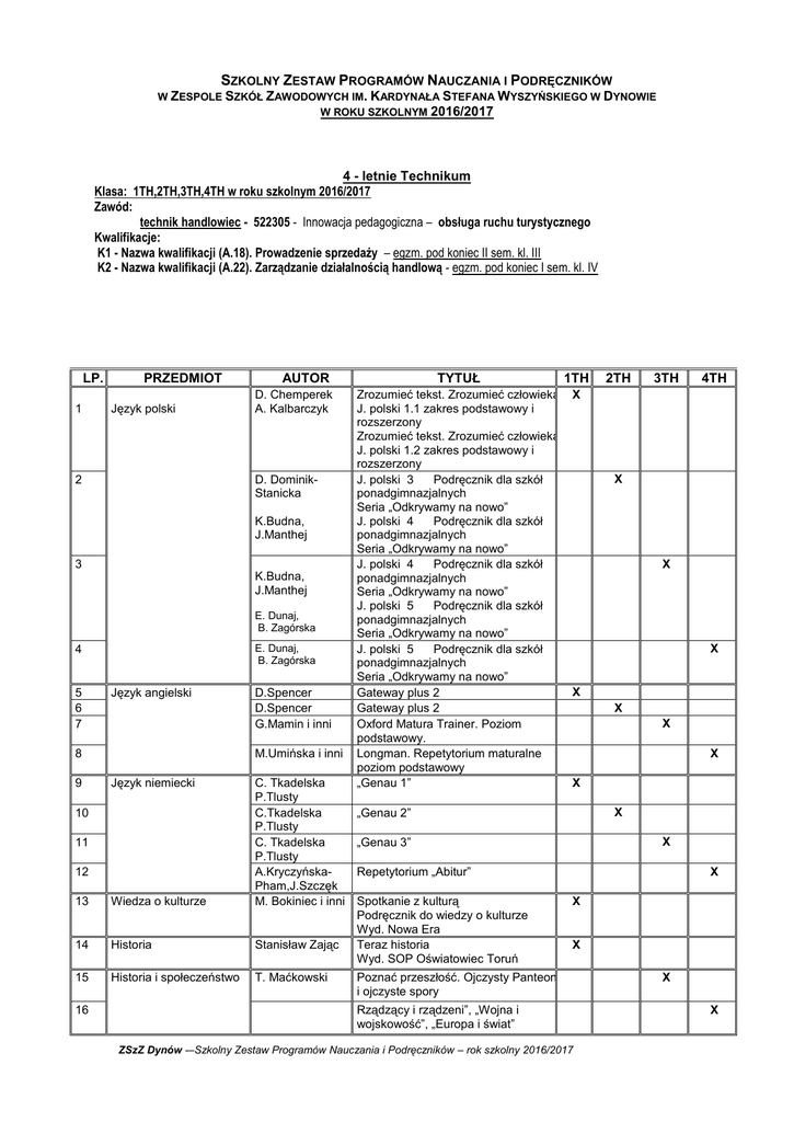 SZKOLNY ZESTAW PROGRAMÓW NAUCZANIA I PODRĘCZNIKÓW W ZESPOLE SZKÓŁ ZAWODOWYCH IM. KARDYNAŁA STEFANA WYSZYŃSKIEGO W DYNOWIE W ROKU SZKOLNYM 2016/2017 4 - letnie Technikum Klasa: 1TH,2TH,3TH,4TH w roku szkolnym 2016/2017 Zawód: technik handlowiec - 522305 - Innowacja pedagogiczna – obsługa ruchu turystycznego Kwalifikacje: K1 - Nazwa kwalifikacji (A.18). Prowadzenie sprzedaży – egzm. pod koniec II sem. kl. III K2 - Nazwa kwalifikacji (A.22). Zarządzanie działalnością handlową - egzm. pod koniec I sem. kl. IV LP. 1 PRZEDMIOT Język polski 2 D. DominikStanicka K.Budna, J.Manthej 3 K.Budna, J.Manthej E. Dunaj, B. Zagórska E. Dunaj, B. Zagórska 4 5 6 7 Język angielski 9 D.Spencer D.Spencer G.Mamin i inni M.Umińska i inni 8 Język niemiecki 13 Wiedza o kulturze C. Tkadelska P.Tlusty C.Tkadelska P.Tlusty C. Tkadelska P.Tlusty A.KryczyńskaPham,J.Szczęk M. Bokiniec i inni 14 Historia Stanisław Zając 15 Historia i społeczeństwo T. Maćkowski 10 11 12 16 TYTUŁ 1TH Zrozumieć tekst. Zrozumieć człowieka J. polski 1.1 zakres podstawowy i rozszerzony Zrozumieć tekst. Zrozumieć człowieka J. polski 1.2 zakres podstawowy i rozszerzony J. polski 3 Podręcznik dla szkół ponadgimnazjalnych Seria „Odkrywamy na nowo” J. polski 4 Podręcznik dla szkół ponadgimnazjalnych Seria „Odkrywamy na nowo” J. polski 4 Podręcznik dla szkół ponadgimnazjalnych Seria „Odkrywamy na nowo” J. polski 5 Podręcznik dla szkół ponadgimnazjalnych Seria „Odkrywamy na nowo” J. polski 5 Podręcznik dla szkół ponadgimnazjalnych Seria „Odkrywamy na nowo” Gateway plus 2 Gateway plus 2 Oxford Matura Trainer. Poziom podstawowy. Longman. Repetytorium maturalne poziom podstawowy „Genau 1” X AUTOR D. Chemperek A. Kalbarczyk 2TH 3TH X X X X X X X X „Genau 2” X „Genau 3” X Repetytorium „Abitur” Spotkanie z kulturą Podręcznik do wiedzy o kulturze Wyd. Nowa Era Teraz historia Wyd. SOP Oświatowiec Toruń 4TH X X X Poznać przeszłość. Ojczysty Panteon i ojczyste spory Rządzący i rządzeni”, „Wojna i wojskowość”, „Europa i świat” ZSzZ Dynów -–Szkolny Zestaw Programów Nauczania i Podręczników – rok szkolny 2016/2017 X X 17 Wiedza o społeczeństwie K.Fic, M.Fic, L. Krzyżanowski 18 19 20 Podstawy przedsiębiorczości Geografia 21 Biologia 22 Chemia 23 Fizyka 24 Matematyka Zbigniew Makieła Krok w przedsiębiorczość Wyd. Nowa Era A. Łazarz Z. „Ciekawi świata” – Zakres Zaniewicz podstawowy - Geografia EmiliaBonar, Biologia na czasie W. Krzeszowiec- Wyd. Nowa Era Jeleń, Stanisław Czachorowski Romuald Hassa To jest chemia Aleksandra Wyd. Nowa Era Mrzigod Janusz Mrzigod Pod.red. Marii Świat fizyki Fiałkowskiej Wyd. „Zamkor” A.Przychoda Z.Łaszczyk 25 A. Przychoda, Z. Łaszczyk 26 A. Łazarz Z. Zaniewicz 27 A. Łazarz Z. Zaniewicz 28 Informatyka 29 30 31 32 33 Wychowanie fizyczne 34 35 36 37 38 Arkadiusz Gawełek 42 43 44 45 46 47 48 49 Matematyka – poznać, zrozumieć Kl. 1 podręcznik do liceum i technikum zakres podstawowy i rozszerzony wyd. WSiP Matematyka – poznać, zrozumieć Kl. 1i 2 podręcznik do liceum i technikum zakres podstawowy i rozszerzony wyd. WSiP Matematyka – poznać, zrozumieć Kl. 2 i 3 podręcznik do liceum i technikum zakres podstawowy i rozszerzony wyd. WSiP Matematyka – poznać, zrozumieć Kl. 2 i 3 podręcznik do liceum i technikum zakres podstawowy i rozszerzony wyd. WSiP Informatyka. Zakres podstawowy Wyd. OPERON X X X X X X X X X X X X X X X X Edukacja dla bezpieczeństwa Zajęcia z wychowawcą Jarosław Słoma „Żyję i działam bezpiecznie” Edukacja dla bezpieczeństwa X X X X X Towar jako przedmiot handlu Iwona Wielgosik 39 40 41 Wiedza o społeczeństwie – zakres podstawowy Elżbieta Strzyżewska, Iwona Wielgosik J.Jóźwiak M.Knap D. Andrzejczak i inni Rachunkowość handlowa Z. Mielczarczyk Organizacja techniki sprzedaży Obsługa klienta J.Jóźwiak M.Knap Towar jako przedmiot handlu. Prowadzenie sprzedaży, tom 1 2 wyd. eMPI X Organizacja i techniki sprzedaży. Prowadzenie sprzedaży 2 wyd. eMPI X X X Sprzedaż towarów cz3 WSiP Organizowanie sprzedaży cz.3 Dokumentacje ekonomicznofinansowe WSiP Sprzedarz towarów cz.3 X X X X X Marketing Statystyka Marketing w działalności gospodarczej WSiP A. Maksymowicz- Zarys statystyki WSiP Ajchel H. Szulc i inni ZSzZ Dynów -–Szkolny Zestaw Programów Nauczania i Podręczników – rok szkolny 2016/2017 X X X 50 Przedsiębiorca w handlu Praca zbiorowa 51 52 53 54 55 56 57 58 59 Język obcy zawodowy j. niemiecki X X X X M. Pańczyk Pracownia sprzedaży. Kwalifikacja A.18. Prowadzenie sprzedaży - zbiór 2 ćwiczeń wyd. eMPI Sprzedaż towarów cz 3 WSiP X Pracownia prowadzenia sprzedaży J.Jóźwiak M.Knap Pracownia techniki biurowej Urszula Łatka Pracownia ekonomiki Z. Mielczarczyk rachunkowości handlowej Obsługa ruchu M.Peć i turystycznego I.Michniewicz X X X X Organizacja i technika pracy biurowej Wyd. WSiP X Dokumentacje ekonomicznofinansowa Obsługa ruchu turystycznego podręcznik Wyd. REA X X X X X X X Religia/etyka 72 73 75 76 X Pracownia sprzedaży. Kwalifikacja A.18. Prowadzenie sprzedaży - zbiór 2 ćwiczeńwyd. eMPI Sprzedaż towarów cz 2 WSiP Sprzedaż towarów cz 3 WSiP 70 71 74 X Pracownia organizowania M. Pańczyk sprzedaży J.Jóźwiak M.Knap J.Jóźwiak M.Knap 60 61 62 63 64 65 66 67 68 69 Przedsiębiorca w handlu 2 wyd. eMPI (w opracowaniu na 2014r.) „Teutsch fur Profis” - Branża ekonomiczna Wychowanie do życia w rodzinie Pod.red. Roberta Strusa i ks. Wiesława Galanta Pod.red. Roberta Strusa i ks. Wiesława Galanta Pod.red. Roberta Strusa i ks. Wiesława Galanta Pod.red. Roberta Strusa i ks. Wiesława Galanta T. Król, M. Ryś „Świadczę o Jezusie w kościele” Podr.nr. AZ-41-01/10-LU-1/12 X „Świadczę o Jezusie w rodzinie” X „Świadczę o Jezusie w świecie” X „Świadczę o Jezusie w świecie” Wędrując ku dorosłości. Wychowanie do życia w rodzinie dla uczniów szkół ponadgimnazjalnych 