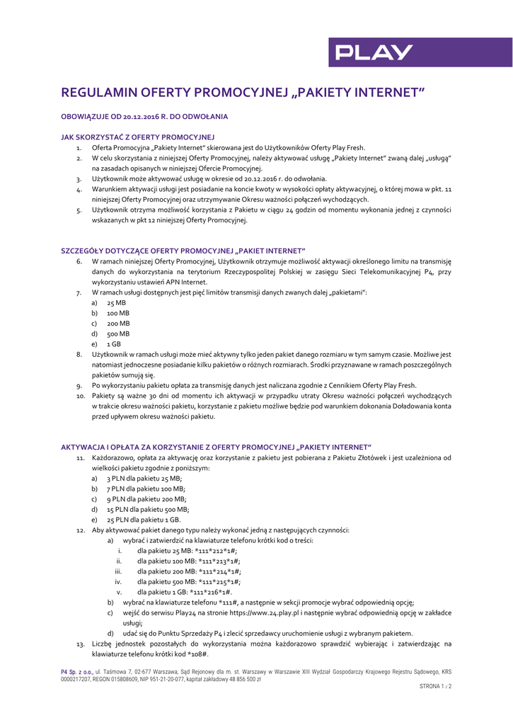 REGULAMIN OFERTY PROMOCYJNEJ „PAKIETY INTERNET” OBOWIĄZUJE OD 20.12.2016 R. DO ODWOŁANIA JAK SKORZYSTAĆ Z OFERTY PROMOCYJNEJ 1. 2. 3. 4. 5. Oferta Promocyjna „Pakiety Internet” skierowana jest do Użytkowników Oferty Play Fresh. W celu skorzystania z niniejszej Oferty Promocyjnej, należy aktywować usługę „Pakiety Internet” zwaną dalej „usługą” na zasadach opisanych w niniejszej Ofercie Promocyjnej. Użytkownik może aktywować usługę w okresie od 20.12.2016 r. do odwołania. Warunkiem aktywacji usługi jest posiadanie na koncie kwoty w wysokości opłaty aktywacyjnej, o której mowa w pkt. 11 niniejszej Oferty Promocyjnej oraz utrzymywanie Okresu ważności połączeń wychodzących. Użytkownik otrzyma możliwość korzystania z Pakietu w ciągu 24 godzin od momentu wykonania jednej z czynności wskazanych w pkt 12 niniejszej Oferty Promocyjnej. SZCZEGÓŁY DOTYCZĄCE OFERTY PROMOCYJNEJ „PAKIET INTERNET” 6. W ramach niniejszej Oferty Promocyjnej, Użytkownik otrzymuje możliwość aktywacji określonego limitu na transmisję danych do wykorzystania na terytorium Rzeczypospolitej Polskiej w zasięgu Sieci Telekomunikacyjnej P4, przy wykorzystaniu ustawień APN Internet. 7. W ramach usługi dostępnych jest pięć limitów transmisji danych zwanych dalej „pakietami”: a) 25 MB b) 100 MB c) 200 MB d) 500 MB e) 1 GB 8. Użytkownik w ramach usługi może mieć aktywny tylko jeden pakiet danego rozmiaru w tym samym czasie. Możliwe jest natomiast jednoczesne posiadanie kilku pakietów o różnych rozmiarach. Środki przyznawane w ramach poszczególnych pakietów sumują się. 9. Po wykorzystaniu pakietu opłata za transmisję danych jest naliczana zgodnie z Cennikiem Oferty Play Fresh. 10. Pakiety są ważne 30 dni od momentu ich aktywacji w przypadku utraty Okresu ważności połączeń wychodzących w trakcie okresu ważności pakietu, korzystanie z pakietu możliwe będzie pod warunkiem dokonania Doładowania konta przed upływem okresu ważności pakietu. AKTYWACJA I OPŁATA ZA KORZYSTANIE Z OFERTY PROMOCYJNEJ „PAKIETY INTERNET” 11. Każdorazowo, opłata za aktywację oraz korzystanie z pakietu jest pobierana z Pakietu Złotówek i jest uzależniona od wielkości pakietu zgodnie z poniższym: a) 3 PLN dla pakietu 25 MB; b) 7 PLN dla pakietu 100 MB; c) 9 PLN dla pakietu 200 MB; d) 15 PLN dla pakietu 500 MB; e) 25 PLN dla pakietu 1 GB. 12. Aby aktywować pakiet danego typu należy wykonać jedną z następujących czynności: a) wybrać i zatwierdzić na klawiaturze telefonu krótki kod o treści: i. dla pakietu 25 MB: *111*212*1#; ii. dla pakietu 100 MB: *111*213*1#; iii. dla pakietu 200 MB: *111*214*1#; iv. dla pakietu 500 MB: *111*215*1#; v. dla pakietu 1 GB: *111*216*1#. b) wybrać na klawiaturze telefonu *111#, a następnie w sekcji promocje wybrać odpowiednią opcję; c) wejść do serwisu Play24 na stronie https://www.24.play.pl i następnie wybrać odpowiednią opcję w zakładce usługi; d) udać się do Punktu Sprzedaży P4 i zlecić sprzedawcy uruchomienie usługi z wybranym pakietem. 13. Liczbę jednostek pozostałych do wykorzystania można każdorazowo sprawdzić wybierając i zatwierdzając na klawiaturze telefonu krótki kod *108#. P4 Sp. z o.o., ul. Taśmowa 7, 02-677 Warszawa, Sąd Rejonowy dla m. st. Warszawy w Warszawie XIII Wydział Gospodarczy Krajowego Rejestru Sądowego, KRS 0000217207, REGON 015808609, NIP 951-21-20-077, kapitał zakładowy 48 856 500 zł STRONA 1 Z 2 DODATKOWE INFORMACJE 14. Skorzystanie z niniejszej Oferty Promocyjnej nie wyklucza korzystania z innych Ofert Promocyjnych dostępnych łącznie z Ofertą Play Fresh (za wyjątkiem Oferty „Darmowy Internet w Play Fresh”, „Internet do wyboru”, „Darmowy Internet bez limitu danych” oraz „Bonus na starterze – Darmowy Internet”), chyba że warunki innych Ofert Promocyjnych stanowią inaczej. 15. Wszelkie wyrazy lub wyrażenia pisane w treści niniejszych warunków Oferty Promocyjnej z dużej litery należy rozumieć zgodnie z ich definicją zawartą odpowiednio w Regulaminie Świadczenia Usług Telekomunikacyjnych przez P4 sp. z o.o. dla Użytkowników lub Cenniku Oferty Play Fresh. 16. W przypadku rozbieżności pomiędzy postanowieniami niniejszej Oferty Promocyjnej a odpowiednio postanowieniami Cennika Oferty Play Fresh lub Regulaminu Świadczenia Usług Telekomunikacyjnych przez P4 sp. z o.o. dla Użytkowników, postanowienia niniejszej Oferty Promocyjnej będą miały charakter nadrzędny. 17. W ramach niniejszej Oferty Promocyjnej Użytkownik zobowiązuje się: a) nie kierować bez zgody Operatora do Sieci Telekomunikacyjnej lub sieci innych przedsiębiorców telekomunikacyjnych, za pomocą jakichkolwiek urządzeń telekomunikacyjnych, przy użyciu Karty SIM/USIM otrzymanej przez Użytkownika ruchu pochodzącego z innych sieci telekomunikacyjnych; b) nie stosować bez zgody Operatora urządzeń umożliwiających dostęp do Sieci Telekomunikacyjnej lub realizowanie połączeń za pomocą urządzeń końcowych przeznaczonych do przyłączenia do sieci stacjonarnej lub działających na podobnej zasadzie, w których wykorzystywane będą karty SIM/USIM działające w Sieci Telekomunikacyjnej; c) nie generować sztucznego ruchu nie służącego wymianie informacji; d) nie używać Karty SIM/USIM w rozwiązaniach telemetrycznych; e) nie używać Karty SIM/USIM do ruchu generowanego maszynowo, w szczególności ruchu typu „maszyna do maszyny” lub „maszyna do użytkownika”; f) nie używać Karty SIM/USIM do generowania ruchu, który ma charakter ataku Denial of Service; g) nie używać Karty SIM/USIM do rozsyłania dużej ilości informacji o jednakowej treści do użytkowników, w szczególności informacji przeznaczonych bezpośrednio lub pośrednio do promowania towarów, usług lub wizerunku Użytkownika, lub służących osiągnięciu efektu handlowego. 18. W przypadku naruszenia przez Użytkownika postanowień określonych w pkt. 17 lit