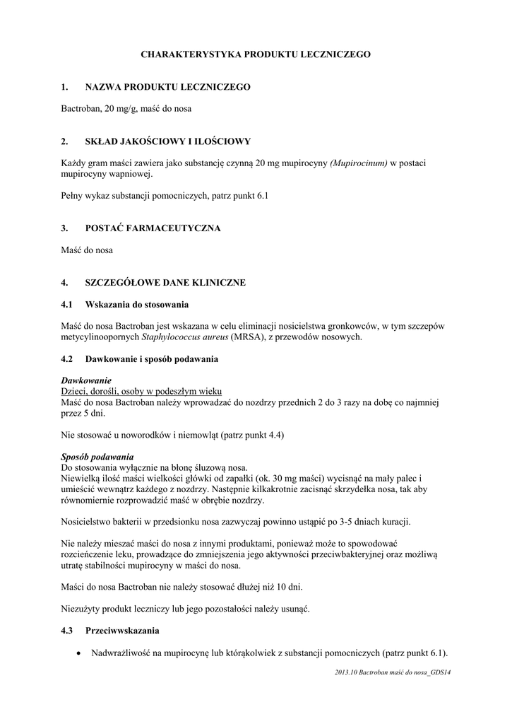 CHARAKTERYSTYKA PRODUKTU LECZNICZEGO 1. NAZWA PRODUKTU LECZNICZEGO Bactroban, 20 mg/g, maść do nosa SKŁAD JAKOŚCIOWY I ILOŚCIOWY 2. Każdy gram maści zawiera jako substancję czynną 20 mg mupirocyny (Mupirocinum) w postaci mupirocyny wapniowej. Pełny wykaz substancji pomocniczych, patrz punkt 6.1 POSTAĆ FARMACEUTYCZNA 3. Maść do nosa 4. SZCZEGÓŁOWE DANE KLINICZNE 4.1 Wskazania do stosowania Maść do nosa Bactroban jest wskazana w celu eliminacji nosicielstwa gronkowców, w tym szczepów metycylinoopornych Staphylococcus aureus (MRSA), z przewodów nosowych. 4.2 Dawkowanie i sposób podawania Dawkowanie Dzieci, dorośli, osoby w podeszłym wieku Maść do nosa Bactroban należy wprowadzać do nozdrzy przednich 2 do 3 razy na dobę co najmniej przez 5 dni. Nie stosować u noworodków i niemowląt (patrz punkt 4.4) Sposób podawania Do stosowania wyłącznie na błonę śluzową nosa. Niewielką ilość maści wielkości główki od zapałki (ok. 30 mg maści) wycisnąć na mały palec i umieścić wewnątrz każdego z nozdrzy. Następnie kilkakrotnie zacisnąć skrzydełka nosa, tak aby równomiernie rozprowadzić maść w obrębie nozdrzy. Nosicielstwo bakterii w przedsionku nosa zazwyczaj powinno ustąpić po 3-5 dniach kuracji. Nie należy mieszać maści do nosa z innymi produktami, ponieważ może to spowodować rozcieńczenie leku, prowadzące do zmniejszenia jego aktywności przeciwbakteryjnej oraz możliwą utratę stabilności mupirocyny w maści do nosa. Maści do nosa Bactroban nie należy stosować dłużej niż 10 dni. Niezużyty produkt leczniczy lub jego pozostałości należy usunąć. 4.3 Przeciwwskazania • Nadwrażliwość na mupirocynę lub którąkolwiek z substancji pomocniczych (patrz punkt 6.1). 2013.10 Bactroban maść do nosa_GDS14 2 4.4 Specjalne ostrzeżenia i środki ostrożności dotyczące stosowania W rzadkich przypadkach wystąpienia reakcji uczuleniowej lub ciężkiego miejscowego podrażnienia po zastosowaniu produktu Bactroban maść do nosa, należy przerwać leczenie, usunąć produkt z nozdrzy oraz prowadzić dalsze leczenie za pomocą innych produktów. Tak jak w przypadku innych produktów przeciwbakteryjnych, przedłużanie terapii powyżej zalecanego okresu może spowodować powstawanie szczepów opornych na lek. Podczas stosowania antybiotyków zgłaszano przypadki wystąpienia rzekomobłoniastego zapalenia jelit, które może występować w postaci od łagodnej do zagrażającej życiu. Dlatego też, ważne jest rozważenie możliwości takiej diagnozy u pacjentów u których w trakcie lub po leczeniu antybiotykami wystąpi biegunka. Taka sytuacja jest mniej prawdopodobna w wypadku mupirocyny stosowanej miejscowo, jednakże jeśli u pacjenta wystąpi silna, przedłużająca się w czasie biegunka lub pacjent ma bóle brzucha, leczenie należy natychmiast przerwać, a pacjenta poddać dalszej diagnozie. Należy unikać kontaktu produktu z oczami. W przypadku dostania się produktu do oka, należy przemywać je wodą, aż do usunięcia pozostałości maści do nosa. Dzieci Bezpieczeństwo stosowania u noworodków i niemowląt nie zostało określone. Nie stosować leku w tej grupie wiekowej. 4.5 Interakcje z innymi produktami leczniczymi i inne rodzaje interakcji Nie stwierdzono interakcji z innymi lekami. 4.6 Wpływ na płodność, ciążę i laktację Ciąża Nie ma odpowiednich danych dotyczących wpływu mupirocyny na przebieg ciąży u kobiet. Badania nad mupirocyną przeprowadzone na zwierzętach nie wykazały toksyczności rozwojowej (patrz punkt 5.3). Ze względu na brak doświadczeń klinicznych dotyczących stosowania mupirocyny podczas ciąży, produkt Bactroban maść do nosa może być stosowany w ciąży jedynie w przypadkach, gdy potencjalne korzyści przeważają nad ewentualnym ryzykiem związanym z leczeniem. Karmienie piersią Brak wystarczających danych dotyczących przenikania mupirocyny do mleka ludzkiego. Płodność Nie ma odpowiednich danych dotyczących wpływu mupirocyny na płodność u ludzi. Badania przeprowadzone na szczurach nie wykazały wpływu na płodność. 4.7 Wpływ na zdolność prowadzenia pojazdów i obsługiwania maszyn Nie stwierdzono niepożądanego wpływu leku na zdolność prowadzenia pojazdów i obsługiwania maszyn. 4.8 Działania niepożądane 2013.10 Bactroban maść do nosa_GDS14 3 Działania niepożądane zostały wymienione poniżej zgodnie z klasyfikacją układów i narządów oraz częstością występowania. Następujące zasady zostały przyjęte dla sporządzenia klasyfikacji częstości występowania działań niepożądanych: Bardzo często ≥1/10, Często ≥1/100 do <1/10, Niezbyt często ≥1/1000 do <1/100, Rzadko ≥1/10 000 do <1/1000, Bardzo rzadko <1/10 000, w tym pojedyncze zgłoszenia. Działania niepożądane występujące niezbyt często określono na podstawie danych pochodzących z 12 badań klinicznych obejmujących populację 422 leczonych pacjentów. Działania niepożądane występujące bardzo rzadko określono głównie na podstawie zgłoszeń po wprowadzeniu leku do obrotu i w związku z tym odnoszą się raczej do częstości zgłoszeń niż rzeczywistej częstości. Zaburzenia układu immunologicznego Bardzo rzadko: skórne reakcje nadwrażliwości. Ogólnoustrojowe reakcje alergiczne takie jak: uogólniona wysypka, pokrzywka lub obrzęk naczynioruchowy. Zaburzenia układu oddechowego, klatki piersiowej i śródpiersia Niezbyt często: reakcje ze strony błony śluzowej nosa. Zgłaszanie podejrzewanych działań niepożądanych Po dopuszczeniu produktu leczniczego do obrotu istotne jest zgłaszanie podejrzewanych działań niepożądanych. Umożliwia to nieprzerwane monitorowanie stosunku korzyści do ryzyka stosowania produktu leczniczego. Osoby należące do fachowego personelu medycznego powinny zgłaszać wszelkie podejrzewane działania niepożądane za pośrednictwem Departamentu Monitorowania Niepożądanych Działań Produktów Leczniczyc