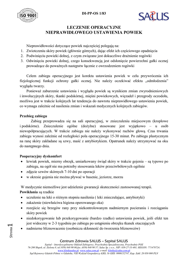DI-PP-OS 1/83 LECZENIE OPERACYJNE NIEPRAWIDŁOWEGO USTAWIENIA POWIEK Nieprawidłowości dotyczące powiek najczęściej polegają na: 1. Zwiotczeniu skóry powiek (głównie górnych), dając efekt ich częściowego opadnięcia 2. Podwinięciu powieki dolnej, z czym związane jest dokuczliwe drażnienie rogówki 3. Odwinięciu powieki dolnej, czego konsekwencją jest odsłonięcie powierzchni gałki ocznej prowadzące do poważnych następstw łącznie z owrzodzeniem rogówki Celem zabiegu operacyjnego jest korekta ustawienia powiek w celu przywrócenia ich fizjologicznej funkcji ochrony gałki ocznej. Nie należy oczekiwać efektu „odmłodzenia” wyglądu twarzy. Ponieważ zaburzenie ustawienia i wyglądu powiek są wynikiem zmian zwyrodnieniowych i inwolucyjnych skóry, tkanki podskórnej, mięśni powiekowych, więzadeł i przegrody oczodołu, możliwa jest w trakcie kolejnych lat tendencja do nawrotu nieprawidłowego ustawienia powiek, co wymaga zależnie od nasilenia zmian i wskazań medycznych kolejnych zabiegów. Przebieg zabiegu Zabieg przeprowadza się na sali operacyjnej, w znieczuleniu miejscowym (kroplowe i podskórne). Znieczulenie ogólne (dożylne) stosowane jest wyjątkowo – u osób niewspółpracujących. W trakcie zabiegu nie należy wykonywać ruchów głową. Czas trwania zabiegu wynosi zależnie od rozległości pola operacyjnego 15-30 minut. Po zabiegu plastycznym na ranę skóry zakładane są szwy, maść z antybiotykiem. Opatrunek należy utrzymywać na oku do następnego dnia. Strona 1 Pooperacyjny dyskomfort krwiak powiek, mierny obrzęk, umiarkowany świąd skóry w trakcie gojenia – są typowe po zabiegu, na ogół nie ma potrzeby stosowania leków przeciwbólowych ogólnie zdjęcie szwów skórnych 7-10 dni po operacji w okresie gojenia nie można pływać w basenie, jeziorze, morzu W medycynie niemożliwe jest udzielenie gwarancji skuteczności zastosowanej terapii. Powikłania są rzadkie uczulenie na leki o różnym stopniu nasilenia ( leki znieczulające, antybiotyki) zakażenie (niewłaściwa higiena operowanego oka) rozejście się brzegów rany przy niekontrolowanym nadmiernym pocieraniu i rozciąganiu skóry powiek niedokorygowanie lub przekorygowanie (bardzo rzadko) ustawienia powiek, jeśli efekt ten jest widoczny w 2-3 tygodniu po zabiegu po ustąpieniu obrzęku tkanek otaczających nadmierne bliznowacenie (osobnicza skłonność do tworzenia bliznowców) Centrum Zdrowia SALUS – Szpital SALUS Szpital – Interdyscyplinarny Oddział Zabiegowy, Przychodnia Specjalistyczna, Przychodnie POZ 76-200 Słupsk, ul. Zielona 8, tel./059) 848 90 00,fax. (059) 848 90 57; Salus Sp. z o.o., NIP: 839-27-53-401; REGON: 771478724; www.klinikasalus.pl; www.salus.com.pl; e-mail: [email protected] Sąd Rejonowy Gdańsk-Północ w Gdańsku, VIII Wydział Gospodarczy KRS; Nr KRS: 0000152747, Kap. Zakł. 28 050 000 PLN DI-PP-OS 1/83 Jak przygotować się do operacji Do szpitala prosimy zabrać skierowanie na operację, dowód ubezpieczenia (nie obowiązuje w przypadku operacji opłacanych prywatnie), formularz zgody. W przypadku planowanego znieczulenia ogólnego wypełnioną ankietę anestezjologiczną oraz wyniki badań laboratoryjnych wraz ze skierowaniem do szpitala należy przynieść na wcześniej uzgodnioną wizytę u anestezjologa. Badania laboratoryjne należy wykonać nie wcześniej jak miesiąc przed zabiegiem. Jeśli pacjent choruje na schorzenia takie jak: cukrzyca, nadciśnienie tętnicze, choroba wieńcowa, zaburzenia rytmu serca, astma, alergie lub, jeśli przyjmuje leki zmniejszające krzepliwość krwi (aspiryna, acard, polocard, acenokumarol, sintrom, warfin) należy poinformować o tym chirurga i zgłosić się do swojego Lekarza Rodzinnego w celu odpowiedniego przygotowania do operacji. W przypadku stosowania leków na stałe – zabrać je ze sobą do szpitala w oryginalnych opakowaniach. W dniu zabiegu pacjent powinien wykonać dokładną poranną toaletę (kąpiel lub prysznic) całego ciała. Po przyjęciu do szpitala jeszcze raz można będzie porozmawiać z lekarzem operującym , anestezjologiem i zadać im ewentualne pytania. Pobyt w szpitalu Po zabiegu pacjentami opiekuje się pielęgniarka dyżurna, do niej należy się zwracać w przypadku dolegliwości, bólów itp. Ponadto w oddziale szpitalnym jest lekarz dyżurny, który interweniuje w nagłych przypadkach. Po operacji pacjent jest wypisany ze szpitala w ciągu jednej do kilku godzin zależnie od rodzaju zastosowanego znieczulenia. Otrzymuje kartę informacyjna, recepty na potrzebne leki, dodatkowe zalecenia ustne od operatora oraz w razie potrzeby zwolnienie z pracy. Ma też wyznaczony termin kontrolnej wizyty u lekarza, który go operował. Strona 2 Ogólne zalecenia pooperacyjne Przed operacją pacjent powinien zapewnić sobie transport do domu – nie powinien prowadzić samochodu (opatrunek na oku). Należy zrealizować przepisane recepty i przyjmować leki zgodnie z zaleceniami lekarza. Higiena operowanego oka Wskazane jest ograniczenie wysiłku fizycznego przez kilka tygodni po operacji. W przypadku nasilonych dolegliwości lub innych niż wyżej opisane należy skontaktować się z lekarzem. Centrum Zdrowia SALUS – Szpital SALUS Szpital – Interdyscyplinarny Oddział Zabiegowy, Przychodnia Specjalistyczna, Przychodnie POZ 76-200 Słupsk, ul. Zielona 8, tel./059) 848 90 00,fax. (059) 848 90 57; Salus Sp. z o.o., NIP: 839-27-53-401; REGON: 771478724; www.klinikasalus.pl; www.salus.com.pl; e-mail: [email protected] Sąd Rejonowy Gdańsk-Północ w Gdańsku, VIII Wydział Gospodarczy KRS; Nr KRS: 0000152747, Kap. Zakł. 28 050 000 PLN DI-PP-OS 1/83 ZGODA NALECZENIE OPERACYJNE NIEPRAWIDŁOWEGO USTAWIENIA POWIEK Świadoma zgoda na operację w znieczuleniu………………………………………….................... Imię i nazwisko chorego……………………………………………………………………………. Data urodzenia……………………