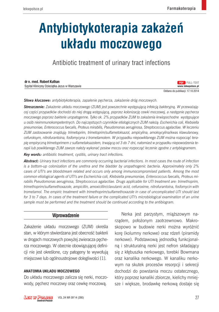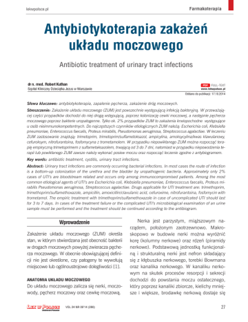 Farmakoterapia lekwpolsce.pl Antybiotykoterapia zakażeń układu moczowego Antibiotic treatment of urinary tract infections dr n. med. Robert Kuthan PDF FULL-TEXT www.lekwpolsce.pl Szpital Kliniczny Dzieciątka Jezus w Warszawie Oddano do publikacji: 17.10.2014 Słowa kluczowe: antybiotykoterapia, zapalenie pęcherza, zakażenie dróg moczowych. Streszczenie: Zakażenie układu moczowego (ZUM) jest powszechnie występującą infekcją bakteryjną. W przeważającej części przypadków dochodzi do niej drogą wstępującą, poprzez kolonizację cewki moczowej, a następnie pęcherza moczowego poprzez bakterie uropatogenne. Tylko ok. 2% przypadków ZUM to zakażenia krwiopochodne występujące u osób nieimmunokompetentnych. Do najczęstszych czynników etiologicznych ZUM należą: Escherichia coli, Klebsiella pneumoniae, Enterococcus faecalis, Proteus mirabilis, Pseudomonas aeruginosa, Streptococcus agalactiae. W leczeniu ZUM zastosowanie znajdują: trimetoprim, trimetoprim/sulfametoksazol, ampicylina, amoksycylina/kwas klawulanowy, cefuroksym, nitrofurantoina, fosfomycyna z trometamolem. W przypadku niepowikłanego ZUM można rozpocząć terapię empiryczną trimetoprimem z sulfametaksazolem, trwającą od 3 do 7 dni, natomiast w przypadku niepowodzenia terapii lub powikłanego ZUM zawsze należy wykonać posiew moczu oraz rozpocząć leczenie zgodne z antybiogramem. Key words: antibiotic treatment, cystitis, urinary tract infections. Abstract: Urinary tract infections are commonly occurring bacterial infections. In most cases the route of infection is a bottom-up colonization of the urethra and the bladder by uropathogenic bacteria. Approximately only 2% cases of UTI’s are bloodstream related and occurs only among immunocompromised patients. Among the most common etiological agents of UTI’s are Escherichia coli, Klebsiella pneumoniae, Enterococcus faecalis, Proteus mirabilis Pseudomonas aeruginosa, Streptococcus agalactiae. Drugs applicable for UTI treatment are: trimethoprim, trimethoprim/sulfamethoxazole, ampicillin, amoxicillin/clavulanic acid, cefuroxime, nitrofurantoina, fosfomycin with trometamol. The empiric treatment with trimethoprim/sulfamethoxazole in case of uncomplicated UTI should last for 3 to 7 days. In cases of the treatment failure or the complicated UTI’s microbiological examination of an urine sample must be performed and the treatment should be continued according to the antibiogram. Wprowadzenie Zakażenie układu moczowego (ZUM) określa stan, w którym stwierdzana jest obecność bakterii w drogach moczowych powyżej zwieracza pęcherza moczowego. W obecnie obowiązującej definicji nie jest określone, czy patogeny te wywołują miejscowe lub ogólnoustrojowe dolegliwości [1]. ANATOMIA UKŁADU MOCZOWEGO Do układu moczowego zalicza się nerki, moczowody, pęcherz moczowy oraz cewkę moczową. VOL 24 NR 09’14 (280) Nerka jest parzystym, miąższowym narządem, położonym zaotrzewnowo. Makroskopowo w budowie nerki można wyróżnić korę (kolumny nerkowe) oraz rdzeń (piramidy nerkowe). Podstawową jednostką funkcjonalną i strukturalną nerki jest nefron składający się z kłębuszka nerkowego, torebki Bowmana oraz kanalika nerkowego. W kanaliku nerkowym na skutek procesów resorpcji i sekrecji dochodzi do powstania moczu ostatecznego, który poprzez kanaliki zbiorcze, kielichy mniejsze i większe, brodawkę nerkową dostaje się 27 Farmakoterapia do miedniczki nerkowej, a dalej przez moczowody do pęcherza moczowego. Moczowód to ok. 25-centymetrowy przewód, który łączy nerkę z pęcherzem moczowym. Zbudowany jest z trójwarstwowej błony mięśniowej, dzięki czemu ma własną perystaltykę, zapobiegając cofaniu się moczu. Moczowód posiada 3 fizjologiczne zwężenia w miejscu zagięć moczowodu – przy odejściu z miedniczki nerkowej, w miejscu skrzyżowania z naczyniami biodrowymi oraz przed ujściem do pęcherza moczowego. Pęcherz moczowy znajduje się w miednicy mniejszej i ma kształt oraz wielkość zależne od stopnia wypełnienia. Maksymalna objętość pęcherza moczowego wynosi od 500 ml do 1000 ml, przy czym parcie na mocz odczuwalne jest przy obecności 300-400 ml moczu. Błona mięśniowa pęcherza moczowego zbudowana jest z mięśnia wypieracza moczu oraz ze zwieracza wewnętrznego cewki moczowej. Ostatni odcinek dróg moczowych – cewka moczowa wykazuje znaczne różnice w budowie w zależności od płci. U kobiet cewka moczowa jest prosta, a jej długość wynosi ok. 3-5 cm, u mężczyzn występują dwa zagięcia cewki, a jej długość to 16-20 cm. Drogi moczowe można podzielić na górne drogi moczowe (miedniczka nerkowa, moczowody) oraz dolne (pęcherz moczowy, cewka moczowa) [2]. Patogeneza ZUM Najczęściej do ZUM dochodzi drogą wstępującą poprzez cewkę moczową. Tylko ok. 2% ZUM to zakażenia krwiopochodne, występujące u osób z niedoborami odporności. Pierwszym etapem rozwoju ZUM jest kolonizacja cewki moczowej przez bakterie uropatogenne, skąd drogą wstępującą mogą przedostać się do pęcherza moczowego. U osób immunokompetentnych, bez zaburzeń w obrębie dróg moczowych zazwyczaj nie dochodzi do rozwoju zakażenia powyżej 28 lekwpolsce.pl pęcherza moczowego. Ze względu na anatomicznie krótszą cewkę moczową u kobiet oraz mniejszą odległość cewki od odbytu, znacznie częściej dochodzi do ZUM u kobiet. Do czynników chroniących organizm człowieka przed powstaniem ZUM zaliczamy: • obecność perystaltyki moczowodów • prawidłowe funkcjonowanie zastawek pę• • • • • cherzowo-moczowodowych zapobieganie przyleganiu bakterii do nabłonka dróg moczowych poprzez: mechaniczne wypłukiwanie drobnoustrojów przez strumień moczu, białko Tamma-Horsfalla, mukopolisacharydy na powierzchni śluzówki pęcherza moczowego, przeciwciała (Ig A) i oligosacharydy (np. antygen grupy Lewis) obecne w moczu, florę fizjologiczną cewki moczowej niskie pH moczu (< 5) wysoką osmolarność m