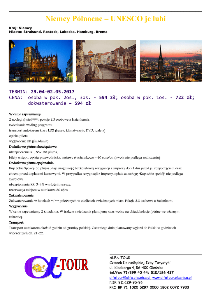 ──────────────────────────────────────────────────────────────── Niemcy Północne – UNESCO je lubi Kraj: Niemcy Miasto: Stralsund, Rostock, Lubecka, Hamburg, Brema TERMIN: 29.04-02.05.2017 CENA: osoba w pok. 2os., 3os. - 594 zł; osoba w pok. 1os. - 722 zł; dokwaterowanie – 594 zł W cenie zapewniamy: 2 noclegi (hotel**/***, pokoje 2,3 osobowe z łazienkami). zwiedzanie według programu transport autokarem klasy LUX (barek, klimatyzacja, DVD, toaleta) opieka pilota wyżywienie BB (śniadania) Dodatkowo płatne obowiązkowo: ubezpieczenie KL, NW: 30 pln/os., bilety wstępu, opłata przewodnicka, zestawy słuchawkowe – 40 euro/os. (kwota nie podlega rozliczeniu) Dodatkowo płatne opcjonalnie: Kup Sobie Spokój: 50 pln/os., daje możliwość bezkosztowej rezygnacji z imprezy do 21 dni przed jej rozpoczęciem oraz chroni przed dopłatami kursowymi. W przypadku rezygnacji z imprezy, opłata za usługę “Kup sobie spokój” nie podlega zwrotowi, ubezpieczenia KR: 3-4% wartości imprezy, rezerwacja miejsca w autokarze 30 zł/os. Zakwaterowanie: Zakwaterowanie w hotelach **/ *** położonych w okolicach zwiedzanych miast. Pokoje 2,3 osobowe z łazienkami. Wyżywienie: W cenie zapewniamy 2 śniadania. W trakcie zwiedzania planujemy czas wolny na obiadokolacje (płatne we własnym zakresie). Transport: Transport autokarem około 5 godzin od granicy polskiej. Ostatniego dnia planowany wyjazd do Polski w godzinach wieczornych ok. 21-22. ALFA-TOUR Członek Dolnośląskiej Izby Turystyki ul. Kleeberga 4, 56-400 Oleśnica tel/fax 71/399 40 44; 515/186 427 [email protected], www.alfatour.olesnica.pl NIP: 911-129-95-96 PKO BP 71 1020 5297 0000 1802 0072 7933 PROGRAM RAMOWY: 1 dzień (czwartek) - zbiórka w godzinach wczesnoporannych i wyjzazd z Polski. Przejazd przez Pojezierze Meklemburskie do Stralsundu - jednego z najpiękniejszych miast Niemiec, posiadającego unikatową zabudowę typową dla miast hanzeatyckich. Wizyta w Oceanarium - największej atrakcji turystycznej w regionie. Spokojny spacer po zabytkowej starówce (wpisanej na listę UNESCO). W programie zwiedzania m.in: kościół św. Marii, kościół św. Mikołaja i św. Jakuba, średniowieczne mury i bramy miejskie, ratusz, Kamienica Wulflama, domy kupieckie. Czas wolny. Przejazd do Rostocku i zwiedzanie starego miasta: Nowy Rynek z charakterystycznym dla Rostocku ratuszem z siedmioma wieżyczkami, Kościół Mariacki, zegar astronomiczny z XV wieku, fragmenty murów miejskich, Brama Kamienna, Plac Uniwersytecki. Przejazd na nocleg w okolicy Rostocku. 2 dzień (piątek) - po śniadaniu zwiedzanie Wismaru - miasta wpisanego na listę UNESCO. W miasteczku zobaczymy m.in. gotyckie kościoły św. Mikołaja i św. Jerzego, rynek ze studnią "Wasserkunst", port ze spichlerzami i browarem. Po zwiedzaniu chwila czasu wolnego na zakup pamiątek. Kolejnym punktem na naszej trasie będzie Lubeka często nazywana "królową Hanzy". Zwiedzanie przepięknego starego miasta, pełnego dawnych zabytków pochodzących z czasów kupieckiej potęgi tych terenów. Będzeimy mieli okazję wypicia kawy w otoczoeniu pięknie położonej nad wodą starówki, która zauroczy nas średniowiecznymi uliczkami(Stare miasto wpisane na listę UNESCO). Zobaczymy tam m.in: Bramę Holsztyńską – symbol miasta, gotyckie kościoły św. Piotra i NMP, ratusz - najstarszy w Niemczech, szpital św. Ducha. Dom Buddenbrooków. Czas wolny na zakupy. Przejazd na nocleg w okolicy Hamburga. 3 dzień (sobota) - po śniadaniu przejazd na zwiedzanie Hamburga – największego północnoniemieckiego portu handlowego. W programie zwiedzania m.in : promenada Alster, Dzielnica Spichlerzy - największy na świecie zabytkowy kompleks magazynowy, w którym pięknie wyeksponowano spichlerze z licznymi kawiarniami i tawernami, Stare Miasto z neorenesansowym ratuszem,kościołem św. Michała - który jest przykładem łabskiego baroku. Czas wolny w centrum miasta, w polbiżu St. Pauli - hamburskiej dzielnicy czerwonych latarni. W godzinach popołudniowych przejazd do Bremy, nazywanej także "Rzymem północy". Zwiedzanie zabytkowej części miasta, m.in. rynek, gotycki Stary Ratusz z ozdobną fasadą, "czterej muzykanci z Bremy", czyli osioł, pies, kot i kogut z baśni braci Grimm, pomnik Rolanda. W trakcie czasu wolnego będziemy mogli spróbować m.in legendarnego niemieckiego piwa BECKS, które pochodzi właśnie z Bremy. W godzinach wieczornych wyjazd z Bremy w droge powrotną do Polski. 4 dzień (niedziela) - przekroczenie granicy Polski w godzinach porannych. Przyjazd do poszczególnych miast. Program zwiedzania jest ramowy i może ulec zmianie. Pilot nie oprowadza po wnętrzach zwiedzanych obiektów. ALFA-TOUR Członek Dolnośląskiej Izby Turystyki ul. Kleeberga 4, 56-400 Oleśnica tel/fax 71/399 40 44; 515/186 427 [email protected], www.alfatour.olesnica.pl NIP: 911-129-95-96 PKO BP 71 1020 5297 0000 1802 0072 7933