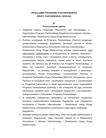 REGULAMIN PROGRAMU PARTNERSKIEGO GRUPY PARTNERSKIEJ SERVAQ §1 Postanowienie ogólne 1. Integralną częścią niniejszego Regulaminu jest obowiązujący u Organizatora Programu Partnerskiego Regulamin Korzystania z Serwisu Internetowego i Świadczenia Usług Drogą Elektroniczną. 2. Podmiot przystępują do Programu Partnerskiego (Partner) akceptując postanowienia niniejszego Regulaminu, akceptuje również w całości postanowienia Regulaminu Korzystania z Serwisu Internetowego i Świadczenia Usług Drogą Elektroniczną, którego postanowienia mają odpowiednie zastosowanie w szczególności w zakresie zakładania i korzystania z Konta, praw i obowiązków Stron, ochrony, udostępniania, przetwarzania danych osobowych (nawet jeżeli w swym brzmieniu wyraźnie nie odnoszą się do Partnera lub Programu Partnerskiego), a także we wszelkich kwestiach nieuregulowanych w niniejszym Regulaminie – na potrzeby związane w szczególności: z rejestracją i prowadzeniem Konta Partnerskiego, uczestnictwem Partnera w Programie Partnerskim Grupy Partnerskiej SERVAQ, korzystaniem przez Partnera ze wszystkich praw i obowiązków związanych z uczestnictwem w Programie Partnerskim, a także wykonywaniem przez Organizatora Programu Partnerskiego, podmioty z nim powiązane lub jego partnerów handlowych wszelkich praw i obowiązków związanych z prowadzeniem, funkcjonowaniem i rozliczaniem Programu Partnerskiego. 3. W przypadku rozbieżności, nieścisłości lub odmiennych uregulowań pomiędzy postanowieniami niniejszego Regulaminu oraz Regulaminu Korzystania z Serwisu Internetowego i Świadczenia Usług Drogą Elektroniczną, pierwszeństwo w stosowaniu mają zapisy niniejszego Regulaminu. 4. Wszelkie wyrażenia pisane wielką literą, które nie zostały zdefiniowane w niniejszym Regulaminie, mają znaczenie nadane im w Regulaminie Korzystania z Serwisu Internetowego i Świadczenia Usług Drogą Elektroniczną. 1 §2 Definicje 1. Regulamin – niniejszy Regulamin. 2. Organizator Programu Partnerskiego – IT Agency SERVAQ Sp. z o.o. z siedzibą w Katowice 40-082, ul. Jana III Sobieskiego 11 lok.E6, wpisana do rejestru przedsiębiorców Krajowego Rejestru Sądowego w Krakowie XII wydział gospodarczy pod nr KRS 0000506730, kapitał zakładowy: 80 000 zł. 3. Program Partnerski – program partnerski organizowany i prowadzony przez Organizatora Programu Partnerskiego, w celu rekomendacji/polecania Towarów oferowanych przez Organizatora Programu Partnerskiego, w ramach którego Partnerzy mogą nabywać Towary oferowane przez Organizatora Programu Partnerskiego oraz otrzymywać wynagrodzenie, rabaty wyliczane zgodnie z zasadami określonymi w SERVAQ Planie Wynagrodzeń lub inne nagrody przewidziane przez Organizatora Programu Partnerskiego. 4. Partner – Użytkownik, który przystąpił do Programu Partnerskiego. 5. Cena Detaliczna – cena Towarów ustalana i publikowana przez Organizatora Programu Partnerskiego, po jakiej sprzedaje on produkty w sklepie internetowym. 6. Cena Partnera - Cena Detaliczna, ustalona przez Organizatora Programu Partnerskiego w sposób preferencyjny, dostępna wyłącznie dla Partnerów, uczestniczących w Programie Partnerskim. 7. Kwota przekazana do Programu Partnerskiego – liczba punktów, dalej zwanych też Punktami SC (wskazana w momencie nabycia Towarów), przekazywana do Programu Partnerskiego od dokonanego nabycia Towarów, która jest podstawą do wyliczania wynagrodzenia, rabatu lub otrzymania innej nagrody w ramach Programu Partnerskiego. 8. Punkty SC – (SERVAQ Credits) – system punktowy Grupy Partnerskiej SERVAQ. 9. Numer Partnera – unikalny, składający się z liter lub cyfr, ciąg znaków przypisany do Partnera w momencie przyjęcia do Programu Partnerskiego. 10. Opiekun – Partner, którego rekomendacja doprowadziła do przystąpienia do Programu Partnerskiego innego podmiotu, niebędącego dotychczas Partnerem. 2 11. Partner Polecający – Partner, którego rekomendacja doprowadziła do skutecznego nabycia Towaru oferowanego przez Organizatora Programu Partnerskiego. 12. Odbiorca rekomendacji – Partner lub podmiot nie będący Partnerem, któremu Partner zarekomendował skutecznie nabycie Towaru oferowanego przez Organizatora Programu Partnerskiego, która to rekomendacja zakończyła się nabyciem zaoferowanego Towaru. 13. SERVAQ Plan Wynagrodzeń – zasady przyznawania, naliczania i przeliczania punktów SC, obliczania wynagrodzeń, rabatów i przyznawania innych nagród przewidziane przez Organizatora Programu Partnerskiego dla Partnerów. 14. Grupa Partnerska SERVAQ – grupa wszystkich Partnerów, którzy przystąpili do Programu Partnerskiego. 15. Twoja Grupa Partnerska SERVAQ lub Grupa Partnerska SERVAQ danego Partnera lub Grupa Partnerska SERVAQ Opiekuna – struktura, którą tworzy Opiekun wraz ze wszystkimi zarejestrowanymi Partnerami, którzy zostali zarekomendowani przez Opiekuna, a także przez pozostałych Partnerów danej struktury niższego stopnia, tj. przez Partnerów, którzy zostali przyjęci do danej Grupy Partnerskiej SERVAQ na podstawie rekomendacji Opiekuna lub Partnera. §2 CZŁONKOSTWO ORAZ JEGO USTANIE W PROGRAMIE PARTNERSKIM 1. Partnerem może zostać Użytkownik, który został zarekomendowany przez Partnera lub samodzielnie złożył wniosek o przystąpienie do Programu Partnerskiego. 2. Uczestnictwo w Programie Partnerskim jest dobrowolne. 3. Partner może posiadać wyłącznie jeden Numer Partnera/jedno Konto, co oznacza, iż posiadanie więcej niż jednego Konta w systemie informatycznym jest zabronione, chyba że zezwala na to SERVAQ Plan Wynagrodzeń lub zezwolenia udzieli Organizator Programu Partnerskiego. 4. W przypadku dokonania rejestracji Dodatkowego Konta (przez Partnera, który już posiada Konto) w Serwisie, z naruszeniem postanowienia §2 ust. 3 niniejszego Regulaminu, wynagrodzenie, rabaty lub inne nagrody będą naliczanie lub przydzielane wyłącznie na Koncie, które zostało zarejestrow