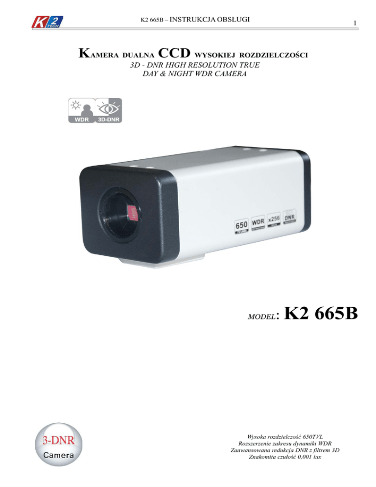 K2 665B – INSTRUKCJA OBSŁUGI 1 KAMERA DUALNA CCD WYSOKIEJ ROZDZIELCZOŚCI 3D - DNR HIGH RESOLUTION TRUE DAY & NIGHT WDR CAMERA MODEL : K2 665B Wysoka rozdzielczość 650TVL Rozszerzenie zakresu dynamiki WDR Zaawansowana redukcja DNR z filtrem 3D Znakomita czułość 0,001 lux K2 665B – INSTRUKCJA OBSŁUGI 2 WSKAZÓWKI OGÓLNE I ŚRODKI OSTROŻNOŚCI Jak obchodzić się z kamerą - Należy unikać wstrząsów, uderzeń, itp. Kamera może ulec uszkodzeniu poprzez nieprawidłowe obchodzenie się z nią lub nieprawidłowe przechowywanie. Bezpieczeństwo elektryczne - By uniknąć porażenia prądem, nie należy usuwać osłon i śrub. W kamerze nie ma części możliwych do naprawienia przez użytkownika. W razie awarii, należy się kontaktować z wyspecjalizowanymi serwisami. Wymagania środowiskowe - Nie wolno korzystać z kamery ani przechowywać jej w miejscach bardzo gorących i bardzo zimnych, wilgotnych i nadmiernie suchych oraz w pobliżu źródeł silnych pól magnetycznych lub promieniowania elektromagnetycznego takich jak odbiorniki radiowe lub przekaźniki telewizyjne. Czyszczenie - Do czyszczenia produktu należy używać delikatnych suchych materiałów, a w przypadku poważnych zabrudzeń używać delikatnych środków. Nie należy dotykać powierzchni przetwornika obrazu lub soczewek. Po przypadkowym dotknięciu do wyczyszczenia powierzchni należy użyć miękkiej szmatki nasączonej alkoholem. Zamontowanie kamery - Nigdy nie kierować kamery w kierunku słońca lub bardzo jasnych obiektów, nawet gdy kamera jest wyłączona. Nie wolno korzystać z kamery ani przechowywać jej w pobliżu lamp fluorescencyjnych lub obiektów odbijających światło oraz niestałych lub migoczących źródłach światła. Transport - Kamera powinna być zabezpieczona przed naciskiem, wibracjami oraz wilgocią podczas transportu i przechowywania. Powinna być transportowana w częściach, w oryginalnym opakowaniu. Uszkodzenia spowodowane nieprawidłowym transportem nie są objęte gwarancją. Instalacja - Kamerę należy zainstalować w przewidzianym dla niej położeniu. Nie należy narażać części kamery na uszkodzenie mechaniczne. Wszelkie czynności serwisowe powinny być wykonane przez wykwalifikowaną osobę. Nie należy samodzielnie rozkręcać obudowę kamery, wewnątrz nie ma żadnych części które można samodzielnie naprawić. Wszystkie naprawy powinny zostać wykonane przez wykwalifikowany serwis. ➢ ➢ ➢ ➢ ➢ ➢ ➢ Przed podłączeniem kamery należy uważnie przeczytać tę instrukcję, by uniknąć uszkodzeń spowodowanych nieprawidłowym montażem lub użytkowaniem. Kamera może pracować wyłącznie przy określonym napięciu zasilania. Należy przestrzegać instrukcji dotyczących bezpieczeństwa umieszczonych na kamerze. Jeśli do wnętrza obudowy dostanie się ciecz lub ciało obce, należy odłączyć kamerę od źródła zasilania i zlecić jej sprawdzenie przez autoryzowanego przedstawiciela handlowego przed ponownym użyciem. Jeśli z urządzenia zacznie się wydobywać jakikolwiek nienormalny zapach lub dym, należy przestać użytkować produkt. W takiej sytuacji należy natychmiast odłączyć źródło zasilania i skontaktować się z serwisem. (Dalsze użytkowanie urządzenia może doprowadzić do pożaru lub porażenia prądem). Urządzenie to zostało przetestowane i jest zgodne z ograniczeniami dotyczącymi urządzenie cyfrowych klasy B. Ograniczenia te służą zapewnieniu właściwej ochrony przed szkodliwymi zakłóceniami w instalacjach mieszkalnych. To urządzenie może generować, wykorzystywać i emitować energię o częstotliwości radiowej. Jeśli nie zostanie zamontowane i nie będzie używane zgodnie z instrukcjami, może powodować szkodliwe zakłócenia łączności radiowej. Kompatybilność elektromagnetyczna (EMC) Urządzenie jest przeznaczone do zastosowań ogólnych w systemach telewizji przemysłowej (CCTV) w środowiskach mieszkalnych, komercyjnych lub przemysłowych. Aby zapewnić prawidłowe działanie i uniknąć problemów dotyczących zakłóceń elektromagnetycznych, uradzenie należy zamontować zgodnie z aktualnie obowiązującymi instrukcjami montażu dotyczącymi kompatybilności elektromagnetycznej. Urządzenia spełniają wymagania zawarte w dyrektywach oraz przepisach krajowych wprowadzających dyrektywy: • Kompatybilność elektromagnetyczna EMC 89/336/EEC ze zmianami • Niskonapięciowa LVD 73/23/EEC ze zmianą, w przypadku sprzętu elektrycznego przeznaczonego do użytkowania przy napięciu nominalnym od 50VAC do 1000VAC oraz od 75VDC do 1500VDC. Niniejsze urządzenie zostało oznakowane zgodnie z Dyrektywą WEEE (2002/96/EC), dotyczącą zużytego sprzętu elektrycznego i elektronicznego. Zapewniając prawidłowe złomowanie przyczyniają się Państwo do ograniczenia ryzyka wystąpienia negatywnego wpływu produktu na środowisko i zdrowie ludzi, które mogłoby zaistnieć w przypadku niewłaściwej utylizacji urządzenia. Symbol umieszczony na produkcie lub dołączonych do niego dokumentach oznacza, że niniejszy produkt nie jest klasyfikowany jako odpad z gospodarstwa domowego. Urządzenie należy oddać do odpowiedniego punktu utylizacji odpadów w celu recyklingu. Aby uzyskać dodatkowe informacje dotyczące recyklingu niniejszego produktu należy skontaktować się z przedstawicielem władz lokalnych, dostawcą usług utylizacji odpadów lub sklepem, gdzie nabyto produkt. Na stronie www.simtecsystem.com.pl są dostępne informacje o zasadach udzielania gwarancji i składania reklamacji oraz do pobrania jest druk serwisowy. K2 665B – INSTRUKCJA OBSŁUGI SPECYFIKACJA Przetwornik obrazu 1/3” Sony Super, Hi-sensitive CCD & DSP Elementy obrazu PAL Wszystkie: 795x596 System wideo PAL Synchronizacja wewnętrzna Rozdzielczość Kolor – 600TVL / B/W - 650TVL Stosunek sygnał/ szum >50dB (AGC Off) Czułość Kolor: 0.1 Lux , B/W: 0,001 Lux (F1.2, 50IRE, AGC on) WDR TAK, regulowany Filtr mechaniczny I