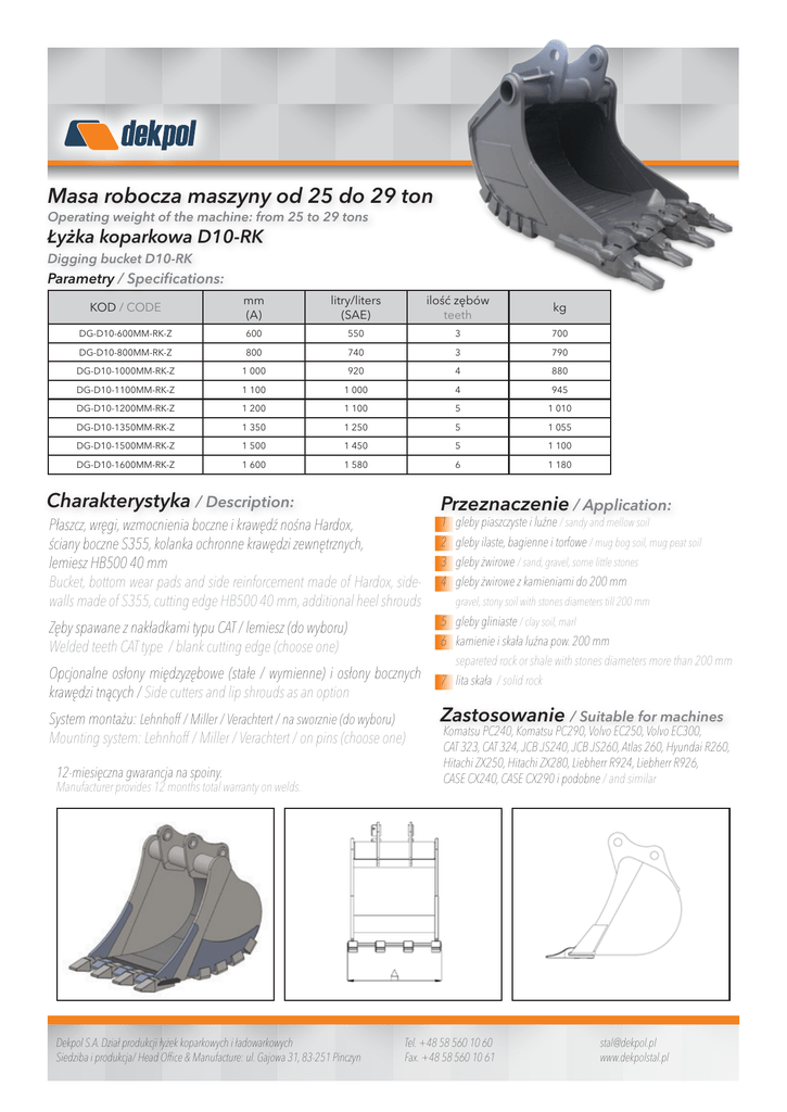 Masa robocza maszyny od 25 do 29 ton Operating weight of the machine: from 25 to 29 tons Łyżka koparkowa D10-RK Digging bucket D10-RK Parametry / Specifications: KOD / CODE mm (A) litry/liters (SAE) ilość zębów teeth kg DG-D10-600MM-RK-Z 600 550 3 700 DG-D10-800MM-RK-Z 800 740 3 790 DG-D10-1000MM-RK-Z 1 000 920 4 880 DG-D10-1100MM-RK-Z 1 100 1 000 4 945 DG-D10-1200MM-RK-Z 1 200 1 100 5 1 010 DG-D10-1350MM-RK-Z 1 350 1 250 5 1 055 DG-D10-1500MM-RK-Z 1 500 1 450 5 1 100 DG-D10-1600MM-RK-Z 1 600 1 580 6 1 180 Charakterystyka / Description: Przeznaczenie / Application: Płaszcz, wręgi, wzmocnienia boczne i krawędź nośna Hardox, ściany boczne S355, kolanka ochronne krawędzi zewnętrznych, lemiesz HB500 40 mm Bucket, bottom wear pads and side reinforcement made of Hardox, sidewalls made of S355, cutting edge HB500 40 mm, additional heel shrouds Zęby spawane z nakładkami typu CAT / lemiesz (do wyboru) Welded teeth CAT type / blank cutting edge (choose one) Opcjonalne osłony międzyzębowe (stałe / wymienne) i osłony bocznych krawędzi tnących / Side cutters and lip shrouds as an option System montażu: Lehnhoff / Miller / Verachtert / na sworznie (do wyboru) Mounting system: Lehnhoff / Miller / Verachtert / on pins (choose one) 12-miesięczna gwarancja na spoiny. Manufacturer provides 12 months total warranty on welds. Dekpol S.A. Dział produkcji łyżek koparkowych i ładowarkowych Siedziba i produkcja/ Head Office & Manufacture: ul. Gajowa 31, 83-251 Pinczyn 1 2 3 4 5 6 7 gleby piaszczyste i luźne / sandy and mellow soil gleby ilaste, bagienne i torfowe / mug bog soil, mug peat soil gleby żwirowe / sand, gravel, some little stones gleby żwirowe z kamieniami do 200 mm gravel, stony soil with stones diameters till 200 mm gleby gliniaste / clay soil, marl kamienie i skała luźna pow. 200 mm separeted rock or shale with stones diameters more than 200 mm lita skała / solid rock Zastosowanie / Suitable for machines Komatsu PC240, Komatsu PC290, Volvo EC250, Volvo EC300, CAT 323, CAT 324, JCB JS240, JCB JS260, Atlas 260, Hyundai R260, Hitachi ZX250, Hitachi ZX280, Liebherr R924, Liebherr R926, CASE CX240, CASE CX290 i podobne / and similar Tel. +48 58 560 10 60 Fax. +48 58 560 10 61 [email protected] www.dekpolstal.pl