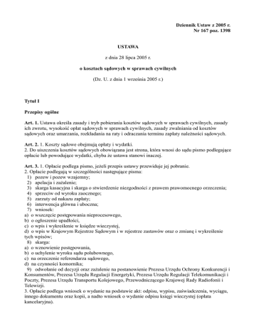 Dziennik Ustaw z 2005 r. Nr 167 poz. 1398 USTAWA z dnia 28 lipca 2005 r. o kosztach sądowych w sprawach cywilnych (Dz. U. z dnia 1 września 2005 r.) Tytuł I Przepisy ogólne Art. 1. Ustawa określa zasady i tryb pobierania kosztów sądowych w sprawach cywilnych, zasady ich zwrotu, wysokość opłat sądowych w sprawach cywilnych, zasady zwalniania od kosztów sądowych oraz umarzania, rozkładania na raty i odraczania terminu zapłaty należności sądowych. Art. 2. 1. Koszty sądowe obejmują opłaty i wydatki. 2. Do uiszczenia kosztów sądowych obowiązana jest strona, która wnosi do sądu pismo podlegające opłacie lub powodujące wydatki, chyba że ustawa stanowi inaczej. Art. 3. 1. Opłacie podlega pismo, jeżeli przepis ustawy przewiduje jej pobranie. 2. Opłacie podlegają w szczególności następujące pisma: 1) pozew i pozew wzajemny; 2) apelacja i zażalenie; 3) skarga kasacyjna i skarga o stwierdzenie niezgodności z prawem prawomocnego orzeczenia; 4) sprzeciw od wyroku zaocznego; 5) zarzuty od nakazu zapłaty; 6) interwencja główna i uboczna; 7) wniosek: a) o wszczęcie postępowania nieprocesowego, b) o ogłoszenie upadłości, c) o wpis i wykreślenie w księdze wieczystej, d) o wpis w Krajowym Rejestrze Sądowym i w rejestrze zastawów oraz o zmianę i wykreślenie tych wpisów; 8) skarga: a) o wznowienie postępowania, b) o uchylenie wyroku sądu polubownego, c) na orzeczenie referendarza sądowego, d) na czynności komornika; 9) odwołanie od decyzji oraz zażalenie na postanowienie Prezesa Urzędu Ochrony Konkurencji i Konsumentów, Prezesa Urzędu Regulacji Energetyki, Prezesa Urzędu Regulacji Telekomunikacji i Poczty, Prezesa Urzędu Transportu Kolejowego, Przewodniczącego Krajowej Rady Radiofonii i Telewizji. 3. Opłacie podlega wniosek o wydanie na podstawie akt: odpisu, wypisu, zaświadczenia, wyciągu, innego dokumentu oraz kopii, a nadto wniosek o wydanie odpisu księgi wieczystej (opłata kancelaryjna). Art. 4. 1. Pismo wnoszone przez kilka osób podlega jednej opłacie. Jeżeli jednak przedmiotem sprawy są roszczenia lub zobowiązania jednego rodzaju i oparte na jednakowej podstawie faktycznej i prawnej (współuczestnictwo formalne), każdy współuczestnik uiszcza opłatę oddzielnie, stosownie do swojego roszczenia lub zobowiązania. 2. Opłatę od wniosku o dokonanie wpisu w księdze wieczystej pobiera się od osoby, która wystąpiła z takim wnioskiem, także wówczas, gdy na jego podstawie mają być ujawnione prawa osób, które nie są wnioskodawcami. 3. Nie pobiera się opłaty od wniosku o sporządzenie uzasadnienia oraz doręczenie odpisu orzeczenia z uzasadnieniem, zgłoszonego w terminie tygodniowym od dnia ogłoszenia sentencji. Art. 5. 1. Wydatki obejmują w szczególności: 1) koszty podróży strony zwolnionej od kosztów sądowych związane z nakazanym przez sąd jej osobistym stawiennictwem; 2) zwrot kosztów podróży i noclegu oraz utraconych zarobków lub dochodów świadków; 3) wynagrodzenie i zwrot kosztów poniesionych przez biegłych, tłumaczy oraz kuratorów ustanowionych dla strony w danej sprawie; 4) wynagrodzenie należne innym osobom lub instytucjom oraz zwrot poniesionych przez nie kosztów; 5) koszty przeprowadzenia innych dowodów; 6) koszty przewozu zwierząt i rzeczy, utrzymywania ich lub przechowywania; 7) koszty ogłoszeń; 8) koszty osadzenia i pobytu w areszcie; 9) ryczałty należne kuratorom sądowym za przeprowadzenie wywiadu środowiskowego w sprawach: o unieważnienie małżeństwa, o rozwód oraz separację, a także za uczestniczenie przy ustalonych przez sąd kontaktach rodziców z dziećmi. 2. Wydatki związane z doręczaniem pism sądowych nie obciążają stron. 3. Wydatki związane ze zwrotem opłat nie obciążają stron. Art. 6. Koszty mediacji nie stanowią wydatków. Art. 7. 1. Stroną w rozumieniu ustawy jest każdy uczestnik postępowania sądowego, w tym także świadek, biegły i tłumacz, a kosztami procesu są również koszty innych rodzajów postępowania. 2. Przez pismo wnoszone do sądu rozumie się również składany ustnie do protokołu pozew, wniosek wszczynający innego rodzaju postępowanie lub inny wniosek, jeżeli podlega opłacie. Art. 8. 1. W postępowaniu dotyczącym kosztów sądowych stosuje się przepisy Kodeksu postępowania cywilnego, chyba że ustawa stanowi inaczej. 2. Postanowienie sądu lub referendarza sądowego w przedmiocie kosztów sądowych może być wydane na posiedzeniu niejawnym. Art. 9. Minister Sprawiedliwości określi, w drodze rozporządzenia: 1) sposób uiszczania opłat sądowych w sprawach cywilnych, w tym wnoszonych na rachunek bankowy sądu lub w formie znaków opłaty sądowej według ustalonego wzoru, mając na względzie łatwość uiszczenia opłat przez strony oraz skutek w postaci zwrotu lub odrzucenia pisma, od którego przy jego wniesieniu nie została uiszczona należna opłata; 2) wzór oświadczenia o stanie rodzinnym, majątku, dochodach i źródłach utrzymania, o którym mowa w art. 102 ust. 2, a także sposób udostępniania osobom fizycznym wzoru druków tych oświadczeń w siedzibach sądów, mając na względzie komunikatywność niezbędnych pouczeń dla stron co do sposobu wypełnienia, skutków niezłożenia lub złożenia nieprawdziwego oświadczenia; 3) wysokość wynagrodzenia i zwrot wydatków poniesionych przez biegłych, kuratorów ustanowionych dla strony w danej sprawie oraz innych osób i instytucji, mając na względzie nakład pracy i kwalifikacje niezbędne do wykonywania zleconych przez sąd czynności oraz poziom wynagrodzeń uzyskiwanych przez pracowników wykonujących podobne zawody. Tytuł II Opłaty DZIAŁ 1 PRZEPISY OGÓLNE Art. 10. Opłatę należy uiścić przy wniesieniu do sądu pisma podlegającego opłacie. Art. 11. Opłata jest stała, stosunkowa albo podstawowa. Art. 12. Opłatę stałą pobiera się w sprawach o prawa niemajątkowe oraz we wskazanych w ustawie niektórych sprawach o prawa maj