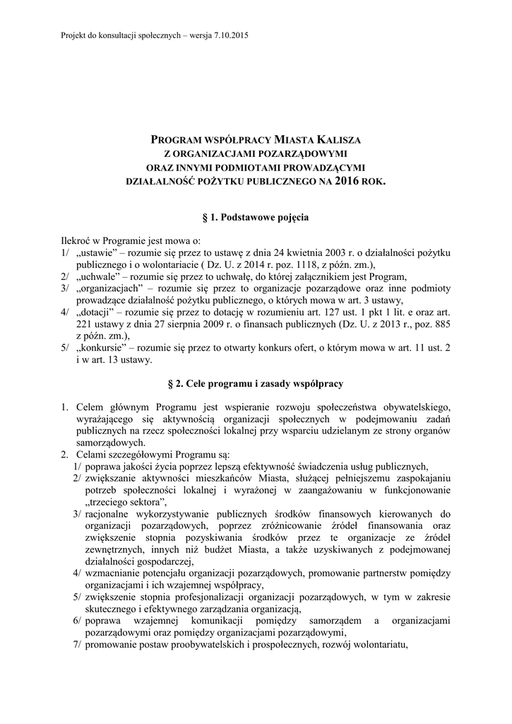 Projekt do konsultacji społecznych – wersja 7.10.2015 PROGRAM WSPÓŁPRACY MIASTA KALISZA Z ORGANIZACJAMI POZARZĄDOWYMI ORAZ INNYMI PODMIOTAMI PROWADZĄCYMI DZIAŁALNOŚĆ POŻYTKU PUBLICZNEGO NA 2016 ROK. § 1. Podstawowe pojęcia Ilekroć w Programie jest mowa o: 1/ „ustawie” – rozumie się przez to ustawę z dnia 24 kwietnia 2003 r. o działalności pożytku publicznego i o wolontariacie ( Dz. U. z 2014 r. poz. 1118, z późn. zm.), 2/ „uchwale” – rozumie się przez to uchwałę, do której załącznikiem jest Program, 3/ „organizacjach” – rozumie się przez to organizacje pozarządowe oraz inne podmioty prowadzące działalność pożytku publicznego, o których mowa w art. 3 ustawy, 4/ „dotacji” – rozumie się przez to dotację w rozumieniu art. 127 ust. 1 pkt 1 lit. e oraz art. 221 ustawy z dnia 27 sierpnia 2009 r. o finansach publicznych (Dz. U. z 2013 r., poz. 885 z późn. zm.), 5/ „konkursie” – rozumie się przez to otwarty konkurs ofert, o którym mowa w art. 11 ust. 2 i w art. 13 ustawy. § 2. Cele programu i zasady współpracy 1. Celem głównym Programu jest wspieranie rozwoju społeczeństwa obywatelskiego, wyrażającego się aktywnością organizacji społecznych w podejmowaniu zadań publicznych na rzecz społeczności lokalnej przy wsparciu udzielanym ze strony organów samorządowych. 2. Celami szczegółowymi Programu są: 1/ poprawa jakości życia poprzez lepszą efektywność świadczenia usług publicznych, 2/ zwiększanie aktywności mieszkańców Miasta, służącej pełniejszemu zaspokajaniu potrzeb społeczności lokalnej i wyrażonej w zaangażowaniu w funkcjonowanie „trzeciego sektora”, 3/ racjonalne wykorzystywanie publicznych środków finansowych kierowanych do organizacji pozarządowych, poprzez zróżnicowanie źródeł finansowania oraz zwiększenie stopnia pozyskiwania środków przez te organizacje ze źródeł zewnętrznych, innych niż budżet Miasta, a także uzyskiwanych z podejmowanej działalności gospodarczej, 4/ wzmacnianie potencjału organizacji pozarządowych, promowanie partnerstw pomiędzy organizacjami i ich wzajemnej współpracy, 5/ zwiększenie stopnia profesjonalizacji organizacji pozarządowych, w tym w zakresie skutecznego i efektywnego zarządzania organizacją, 6/ poprawa wzajemnej komunikacji pomiędzy samorządem a organizacjami pozarządowymi oraz pomiędzy organizacjami pozarządowymi, 7/ promowanie postaw proobywatelskich i prospołecznych, rozwój wolontariatu, Projekt do konsultacji społecznych – wersja 7.10.2015 8/ zwiększenie wpływu sektora obywatelskiego na kreowanie polityki społecznej w Mieście, 9/ integracja podmiotów realizujących zadania publiczne. 3. Współpraca Miasta z organizacjami pozarządowymi oraz podmiotami określonymi w art. 3 ust. 3 ustawy odbywa się na zasadach: pomocniczości, suwerenności stron, partnerstwa, efektywności, uczciwej konkurencji i jawności, które zostały szczegółowo opisane w „Wieloletnim programie współpracy Miasta Kalisza z organizacjami pozarządowymi oraz innymi podmiotami prowadzącymi działalność pożytku publicznego na lata 2016-2020”. § 3. Zakres przedmiotowy 1. Współpraca z organizacjami dotyczy zadań określonych w art. 4 ust. 1 ustawy oraz w art. 7 ust. 1 ustawy z dnia 8 marca 1990 r. o samorządzie gminnym, a w szczególności zadań w zakresie: 1/ pomocy społecznej, w tym pomocy rodzinom i osobom w trudnej sytuacji życiowej oraz wyrównywania szans tych rodzin i osób, 2/ wspierania rodziny i systemu pieczy zastępczej, 3/ działalności na rzecz integracji i reintegracji zawodowej i społecznej osób zagrożonych wykluczeniem społecznym, 4/ działalności charytatywnej, 5/ podtrzymywania i upowszechniania tradycji narodowej, pielęgnowania polskości oraz rozwoju świadomości narodowej, obywatelskiej i kulturowej, 6/ ochrony i promocji zdrowia, w tym działalności leczniczej w rozumieniu ustawy z dnia 15 kwietnia 2011 r. o działalności leczniczej (Dz.U. z 2015 r. poz.618, z późn. zm.), 7/ działalności na rzecz osób niepełnosprawnych, 8/ działalności na rzecz osób w wieku emerytalnym, 9/ działalności wspomagającej rozwój gospodarczy, w tym rozwój przedsiębiorczości, 10/ nauki, szkolnictwa wyższego, edukacji, oświaty i wychowania. 11/ działalności na rzecz dzieci i młodzieży, w tym wypoczynku dzieci i młodzieży, 12/ kultury, sztuki, ochrony dóbr kultury i dziedzictwa narodowego, 13/ wspierania i upowszechniania kultury fizycznej, 14/ ekologii i ochrony zwierząt oraz ochrony dziedzictwa przyrodniczego, 15/ turystyki i krajoznawstwa, 16/ porządku i bezpieczeństwa publicznego, 17/ ratownictwa i ochrony ludności, 18/ upowszechniania i ochrony praw konsumentów, 19/ działalności na rzecz integracji europejskiej oraz rozwijania kontaktów i współpracy między społeczeństwami, 20/ promocji i organizacji wolontariatu, 21/ działalności na rzecz kombatantów i osób represjonowanych, 22/ działalności na rzecz rodziny, macierzyństwa, rodzicielstwa, upowszechniania i ochrony praw dziecka, 23/ przeciwdziałania uzależnieniom i patologiom społecznym, 24/ działalność na rzecz organizacji pozarządowych oraz podmiotów wymienionych w art. 3 ust.3, w zakresie określonym w pkt. 1-32 ustawy. 2. Decyzję o podjęciu współpracy w zakresie zadań określonych w art. 4 ust. 1 ustawy oraz w art. 7 ust. 1 ustawy z dnia 8 marca 1990 r. o samorządzie gminnym, innych niż wymienione w ust. 1 podejmuje Prezydent Miasta Kalisza po zasięgnięciu opinii Kaliskiej Rady Działalności Pożytku Publicznego. Projekt do konsultacji społecznych – wersja 7.10.2015 § 4. Formy współpracy 1. Współpraca, o której mowa w § 3 może być realizowana poprzez finansowe i pozafinansowe formy współpracy oraz polegać na wspomaganiu technicznym, szkoleniowym, materialnym lub finansowym organizacji w zakresie określonym uchwałą. 2. W szczególności współpraca finansowa może poleg