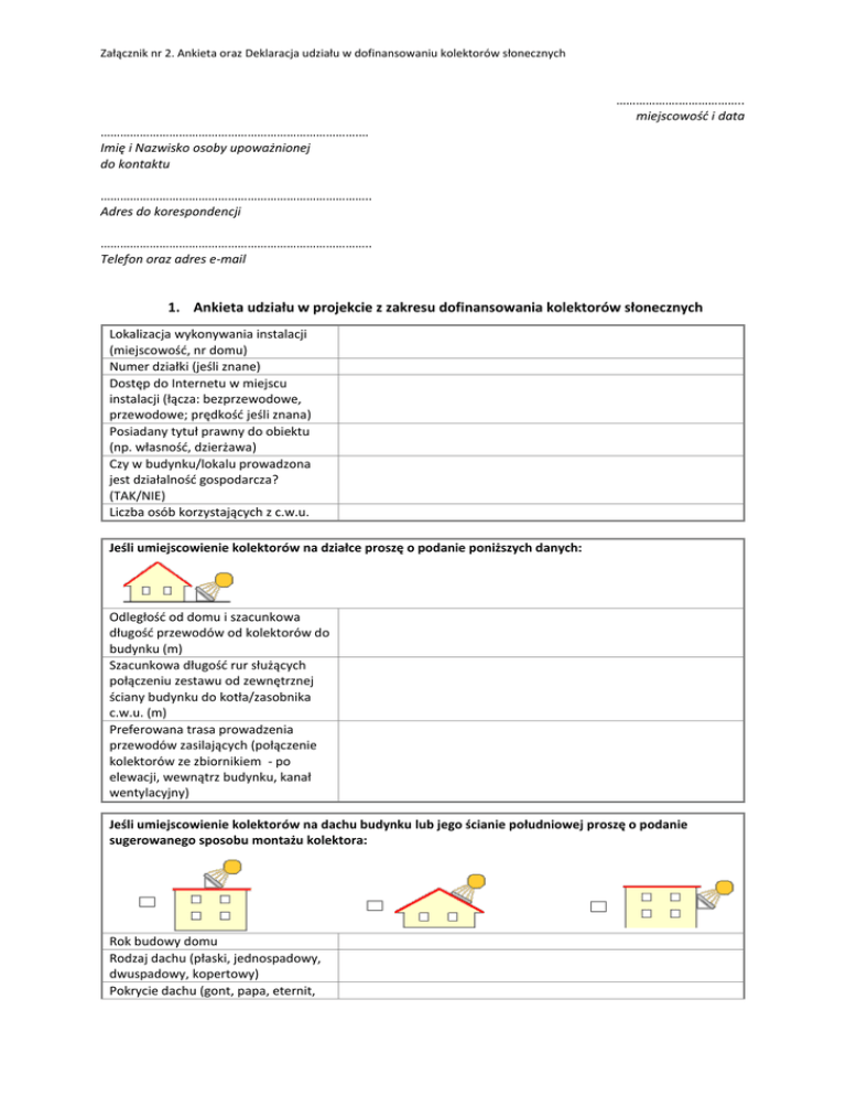 Załącznik nr 2. Ankieta oraz Deklaracja udziału w dofinansowaniu kolektorów słonecznych ……………….……………….. miejscowość i data …………………………………………………………………….… Imię i Nazwisko osoby upoważnionej do kontaktu ……………………………………………………………………….. Adres do korespondencji ……………………………………………………………………….. Telefon oraz adres e-mail 1. Ankieta udziału w projekcie z zakresu dofinansowania kolektorów słonecznych Lokalizacja wykonywania instalacji (miejscowość, nr domu) Numer działki (jeśli znane) Dostęp do Internetu w miejscu instalacji (łącza: bezprzewodowe, przewodowe; prędkość jeśli znana) Posiadany tytuł prawny do obiektu (np. własność, dzierżawa) Czy w budynku/lokalu prowadzona jest działalność gospodarcza? (TAK/NIE) Liczba osób korzystających z c.w.u. Jeśli umiejscowienie kolektorów na działce proszę o podanie poniższych danych: Odległość od domu i szacunkowa długość przewodów od kolektorów do budynku (m) Szacunkowa długość rur służących połączeniu zestawu od zewnętrznej ściany budynku do kotła/zasobnika c.w.u. (m) Preferowana trasa prowadzenia przewodów zasilających (połączenie kolektorów ze zbiornikiem - po elewacji, wewnątrz budynku, kanał wentylacyjny) Jeśli umiejscowienie kolektorów na dachu budynku lub jego ścianie południowej proszę o podanie sugerowanego sposobu montażu kolektora: Rok budowy domu Rodzaj dachu (płaski, jednospadowy, dwuspadowy, kopertowy) Pokrycie dachu (gont, papa, eternit, Załącznik nr 2. Ankieta oraz Deklaracja udziału w dofinansowaniu kolektorów słonecznych blacha, inne). Uwaga: jeżeli eternit, instalacja nie może być zamontowana na dachu Wymiary wolnej powierzchni dachu lub ściany skierowanej na południe (m2) Liczba kondygnacji nadziemnych Preferowana trasa prowadzenia przewodów zasilających (połączenie kolektorów ze zbiornikiem - po elewacji, wewnątrz budynku, kanał wentylacyjny) Szacunkowa długość rur służących połączeniu zestawu z baterii z pozostałą częścią instalacji w budynku (m) Położenie kotłowni (węzła cieplnego) np. piwnica, poziom parteru Wiek kotła Powierzchnia kotłowni (około m2) Wysokość kotłowni (około cm) Moc energii elektrycznej dostępna w kotłowni (czy można podłączyć urządzenie o mocy 40 W) TAK/NIE Lokalizacja istniejącego zbiornika c.w.u. (gdzie jest zamontowany bojler) Szerokość drzwi w celu wniesienia zasobnika (cm) Istniejące źródło przygotowania ciepłej wody: w okresie wiosna-jesień kocioł węglowy kocioł gazowy kocioł olejowy kocioł pelet bojler elektryczny inne, jakie?....................................... Czy zamierza Pani/Pan połączyć kocioł do zbiornika jako 2 źródło zasilania w c.w.u.? w okresie zimowym kocioł węglowy kocioł gazowy kocioł olejowy kocioł pelet bojler elektryczny inne, jakie?....................................... Załącznik nr 2. Ankieta oraz Deklaracja udziału w dofinansowaniu kolektorów słonecznych 2. Deklaracja udziału w projekcie z zakresu dofinansowania kolektorów słonecznych Ja niżej podpisany ……………………………..……………………….. deklaruję uczestnictwo w projekcie dofinansowania kolektorów słonecznych planowanym do realizacji przez Gminę DZIERZKOWICE w ramach Regionalnego Programu Operacyjnego Województwa Lubelskiego na lata 2014 - 2020. 1. Uprzedzony o odpowiedzialności karnej wynikającej z art. 272 Kodeksu Karnego za złożenie nieprawdziwego oświadczenia lub zatajenie prawdy niniejszym oświadczam, że jestem właścicielem / współwłaścicielem1 nieruchomości położonej w …………….……..……..………… (miejscowość) nr działki: ……………..…… obręb: ……….………... dla której prowadzona jest Księga Wieczysta nr: ………………………….….... w Sądzie Rejonowym w…………………………………………. 2. Przekazuję prawo dysponowania niezbędną częścią ww. nieruchomości Gminie DZIERZKWICE dla celów uczestnictwa w projekcie dofinansowania kolektorów słonecznych. Powyższe prawo przekazywane jest na czas określony od dnia niniejszego oświadczenia na okres co najmniej 5 lat po zakończeniu realizacji projektu. (wielkość przekazywanej nieruchomości będzie zależna od niezbędnych wielkości budynków i ewentualnej odległości gruntu potrzebnego do montażu instalacji). 3. Wyrażam zgodę na umieszczenie i utrzymywanie na powyższej nieruchomości, przez okres co najmniej 5 lat po zakończeniu realizacji projektu, zamontowanej instalacji oraz umieszczonego oznaczenia (ologowania) lub tablicy pamiątkowej o sfinansowaniu projektu ze środków Europejskiego Funduszu Rozwoju Regionalnego w ramach Regionalnego Programu Operacyjnego Województwa Lubelskiego na lata 2014 – 2020 4. Liczba osób zamieszkałych w budynku mieszkalnym wynosi: ……………. i jest zgodna z Deklaracją o wysokości opłaty za gospodarowania odpadami komunalnymi. 5. W budynku, korzystającym z instalacji solarnej nie jest prowadzona działalność gospodarcza, obiekty na których miałaby być zamontowana instalacja nie są związane z prowadzeniem działalności rolniczej. 6. Przyjmuję do wiadomości, iż szacowany koszt urządzenia (urządzenie, montaż i przygotowanie dokumentacji technicznej) to około 8 000 złotych brutto (przy założeniu montażu 2 kolektorów). Zestaw solarny wykorzystywany będzie w instalacji CWU budynku mieszkalnego. Deklaruję przystąpienie do programu i pokryję do 15% kosztów kwalifikowanych. 7. Przyjmuję do wiadomości, iż realizacja operacji może pociągać za sobą dodatkowe koszty niekwalifikowane związane z niestandardowymi warunkami (np. druga wężownica w zasobniku, grzałka elektryczna, nietypowe wpięcia do istniejącej instalacji co zwiększy zużycie materiału lu