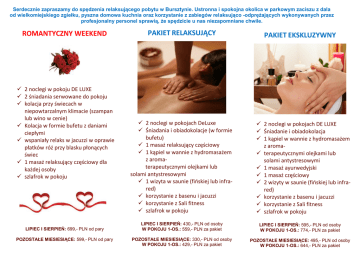 Serdecznie zapraszamy do spędzenia relaksującego pobytu w Bursztynie. Ustronna i spokojna okolica w parkowym zaciszu z dala od wielkomiejskiego zgiełku, pyszna domowa kuchnia oraz korzystanie z zabiegów relaksująco -odprężających wykonywanych przez profesjonalny personel sprawią, że spędzicie u nas niezapomniane chwile. ROMANTYCZNY WEEKEND 2 noclegi w pokoju DE LUXE 2 śniadania serwowane do pokoju kolacja przy świecach w niepowtarzalnym klimacie (szampan lub wino w cenie) Kolacja w formie bufetu z daniami ciepłymi wspaniały relaks w jacuzzi w oprawie płatków róż przy blasku płonących świec 1 masaż relaksujący częściowy dla każdej osoby szlafrok w pokoju LIPIEC I SIERPIEŃ: 699,- PLN od pary POZOSTAŁE MIESIESIĄCE: 599,- PLN od pary PAKIET RELAKSUJĄCY 2 noclegi w pokojach DeLuxe Śniadania i obiadokolacje (w formie bufetu) 1 masaż relaksujący częściowy 1 kąpiel w wannie z hydromasażem z aromaterapeutycznymi olejkami lub solami antystresowymi 1 wizyta w saunie (fińskiej lub infrared) korzystanie z basenu i jacuzzi korzystanie z Sali fitness szlafrok w pokoju PAKIET EKSKLUZYWNY 2 noclegi w pokojach DE LUXE Śniadanie i obiadokolacja 1 kąpiel w wannie z hydromasażem z aroma terapeutycznymi olejkami lub solami antystresowymi 1 masaż ayurwedyjski 1 masaż częściowy 2 wizyty w saunie (fińskiej lub infrared) korzystanie z basenu i jacuzzi korzystanie z Sali fitness szlafrok w pokoju LIPIEC I SIERPIEŃ: 430,- PLN od osoby W POKOJU 1-OS.: 559,- PLN za pakiet LIPIEC I SIERPIEŃ: 595,- PLN od osoby W POKOJU 1-OS.: 774,- PLN za pakiet POZOSTAŁE MIESIESIĄCE: 330,- PLN od osoby W POKOJU 1-OS.: 429,- PLN za pakiet POZOSTAŁE MIESIESIĄCE: 495,- PLN od osoby W POKOJU 1-OS.: 644,- PLN za pakiet 4-DNIOWY PAKIET SPA & WELLNESS 6-DNIOWY PAKIET SPA & WELLNESS (Dni przyjazdów: od niedzieli do czwartku) (Dni przyjazdów: oferta obowiązuje cały tydzień) Oferty pobytów Spa & Wellness - 3 noclegi w pokojach De Lux - drink powitalny - śniadania i obiadokolacje w formie bufetu z ciepłymi daniami - 1 masaż częściowy ( do wyboru: masaż kręgosłupa, relaksujący, twarzy szyi i dekoltu lub refleksologia stóp) -1 kosmetyczny zabieg pielęgnacyjny na dłonie (odżywczo-wygładzający zabieg dla suchych i zniszczonych dłoni – relax i odżywienie dłoni) - 1 okład borowinowy - 1 sesja w saunie fińskiej lub kabinie podczerwieni Infra Red - otwarte wejścia na basen i jacuzzi w trakcie pobytu - otwarte wejścia na salę fitness - szlafrok w pokoju - codzienna poranna gimnastyka w basenie LIPIEC I SIERPIEŃ: 550,- PLN od osoby W POKOJU 1-OS.: 715,- PLN za pakiet POZOSTAŁE MIESIESIĄCE: 460,- PLN od osoby W POKOJU 1-OS.: 598,- PLN za pakiet - 5 noclegów w pokojach De Lux - drink powitalny - śniadania i obiadokolacje w formie bufetu z ciepłymi daniami - 2 masaże częściowy ( do wyboru: masaż kręgosłupa, relaksujący, twarzy szyi i dekoltu lub refleksologia stóp) -1 kosmetyczny zabieg pielęgnacyjny na dłonie (odżywczo-wygładzający zabieg dla suchych i zniszczonych dłoni – relax i odżywienie dłoni) - 2 okłady borowinowe - 1 sesja w saunie fińskiej lub kabinie podczerwieni Infra Red - otwarte wejścia na basen i jacuzzi w trakcie pobytu - otwarte wejścia na salę fitness - szlafrok w pokoju - codzienna poranna gimnastyka w basenie LIPIEC I SIERPIEŃ: 790,- PLN od osoby W POKOJU 1-OS.: 1027,- PLN za pakiet POZOSTAŁE MIESIESIĄCE: 590,- PLN od osoby W POKOJU 1-OS.: 767,- PLN za pakiet WWW.BURSZTYNSPA.PL TEL.: +48 94 314 84 67