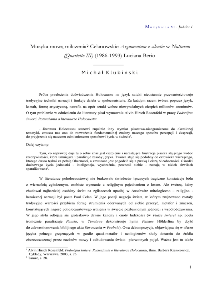 Mu z y k a l i a VI · Judaica 1 Muzyka mową milczenia? Celanowskie Argumentum e silentio w Notturno (Quartetto III) (1986-1993) Luciana Berio Michał Klubiński Próba przełożenia doświadczenia Holocaustu na język sztuki nieustannie przewartościowuje tradycyjne techniki narracji i funkcje dzieła w społeczeństwie. Za każdym razem twórca poprzez język, kształt, formę artystyczną, natrafia na opór sztuki wobec niewyrażalnych cierpień milionów anonimów. O tym problemie w odniesieniu do literatury pisał wymownie Alvin Hirsch Rosenfeld w pracy Podwójna śmierć. Rozważania o literaturze Holocaustu: …literatura Holocaustu stanowi zupełnie inny wymiar pisarstwa-nieograniczone do określonej tematyki, zmusza nas ono do rozważenia fundamentalnej zmiany naszego sposobu percepcji i ekspresji, do przyjrzenia się naszemu odmienionemu sposobowi bycia w świecie1. Dalej czytamy: Tym, co naprawdę daje tu o sobie znać jest cierpienie i narastająca frustracja pisarza stającego wobec rzeczywistości, która umniejsza i paraliżuje zasoby języka. Twórca staje się podobny do człowieka wierzącego, którego dusza tęskni za pełnią Obecności, a zmuszana jest pogodzić się z pustką i ciszą Nieobecności. Ośrodki duchowego życia jednostki - inteligencja, wyobraźnia, pewność siebie - zostają w takich chwilach sparaliżowane2. W literaturze poholocaustowej nie brakowało świadectw łączących tragiczne konstatacje bólu z wiernością zgładzonym, osobiste wyznanie z religijnym pojednaniem z losem. Ale twórcą, który zbudował najbardziej osobisty świat na zgliszczach upadłej w Auschwitz mitologiczno – religijno heroicznej narracji był poeta Paul Celan. W jego poezji negacja świata, w którym zrujnowane zostały tradycyjne wartości przybiera formę strumienia oderwanych od siebie przeżyć, metafor i znaczeń, konstatujących nagość poholocaustowego istnienia w świecie pozbawionym jedności i współodczuwania. W jego stylu odbijają się groteskowo dawne kanony i cnoty ludzkości (w Fudze śmierci np. poeta ironicznie parafrazuje Fausta, w Tenebrae dekonstruuje hymn Patmos Hölderlina by dojść do zakwestionowania biblijnego aktu Stworzenia w Psalmie). Owa dekompozycja, objawiająca się w sferze języka pełnego grzęznących w gardle quasi-metafor i neologizmów służy dotarciu do źródła zbezczeszczonej przez nazistów mowy i odbudowaniu świata pierwotnych pojęć. Ważne jest tu także 1 Alvin Hirsch Rosenfeld: Podwójna śmierć. Rozważania o literaturze Holocaustu, tłum. Barbara Krawcowicz, Cyklady, Warszawa, 2003, s. 26. 2 Tamże, s. 28. 1 Mu z y k a l i a VI · Judaica 1 napięcie wytwarzane pomiędzy znaczeniem a formą tak aby język wyzbyty dekoracyjności i symbolizmu, swej ekspansywnej natury, mógł przenikać w najgłębsze rejony ludzkiego cierpienia. Poeta w Przemówieniu z okazji przyjmowania Nagrody Literackiej Wolnego Hanzeatyckiego Miasta Bremy w 1958 r. tak określał ten rodzaj przekazu: Osiągalne, bliskie i nie utracone wśród (…) strat pozostało jedno: język. On, język, nie zginął, tak, mimo wszystko. Ale musiał teraz przejść przez własne niemożności odpowiedzi, przejść przez straszliwe zamilkanie, przez tysiące mroków niosących śmierć mowy. Przeszedł przez to i nie znalazł słów na to, co się zdarzyło, jednak szedł przez dzianie się. Przeszedł i dane mu było znowu wyjść na światło dzienne wzbogaconym: o to wszystko3. Przestrzeń wiersza staje się więc u Celana w nowy sposób kosmosem, w którym zderzają się ze sobą wszelkie odłamki świata, a istotą jest budowanie wspólnoty poprzez zaprzeczenie bliskiej obecności Boga i drugiego, poprzez dyskretną, powolną i niewyrażalną rozmowę z pozostałymi prochami własnej istoty i relacji „ja” ze światem. Przytoczmy jeszcze raz słowa poety: Wiersz staje się (…) wierszem owego kogoś, kto zadaje pytania tym zjawiskom i je zagaduje – powstaje rozmowa – często jest to rozmowa rozpaczliwa. Dopiero w przestrzeni tej rozmowy konstytuuje się to, co było zagadywane, gromadzi się wokół zagadującego je i nazywającego Ja. Ale to, co było zagadnięte, wnosi swoje innobycie i przez nazwanie zostaje równocześnie zamienione na Ty. Jednakże w owym „tu i teraz” wiersza, (…) jeszcze w tej bezpośredniości i bliskości pozwala temu Innemu współprzemawiać tu, poprzez to, co dla niego jest najbardziej znamienne: przez jego czas4. Wyjątkowość Celanowskiego stawania się na nowo poprzez milczenie wobec absurdu śmierci potwierdza też w swojej Teorii estetycznej Theodor Wiesengrund Adorno, 17 lat po wygłoszeniu niesłusznie utrwalonej w historii tezy „Nie sposób pisać poezji lirycznej po Oświęcimiu”. Określa on poezję Celana jako wybitnie hermetyczną, która jednocześnie rewiduje dotychczasowe założenie tego kierunku – autoteliczność języka poetyckiego, rejestrowanie przez niego zmiennego świata zewnętrznego zastępuje zaś niemożnością wypowiedzenia rzeczywistości: U najwybitniejszego przedstawiciela poezji hermetycznej we współczesnej liryce niemieckiej, Paula Celana, zawartość doświadczeniowa tego, co hermetyczne, ulega odwróceniu. Tę lirykę przenika wstyd sztuki w obliczu cierpienia uchylającego się tak przed doświadczeniem, jak i przed wysublimowaniem. Wiersze Celana chcą wypowiedzieć największą zgrozę przez przemilczanie. Sama zawartość ich prawdy staje się czymś negatywnym. Naśladują one mowę poniżej mowy bezradnego człowieka, a nawet wszelkiej organiczności, mowę tego, co umarłe w kamieniu czy gwieździe. Nieskończona dyskrecja, z jaką odzywa się radykalizm Celana dodaje mu siły. Mowa czegoś pozbawionego życia staje się ostatnią pociechą w obliczu śmierci pozbawionej wszelkiego sensu5. 3 Paul Celan: Przemówienie z okazji przyjmowania Nagrody Literackiej Wolnego Hanzeatyckiego Miasta Bremy, tłum. Feliks Przybylak, w: P. Celan: Utwory wybrane Wybr