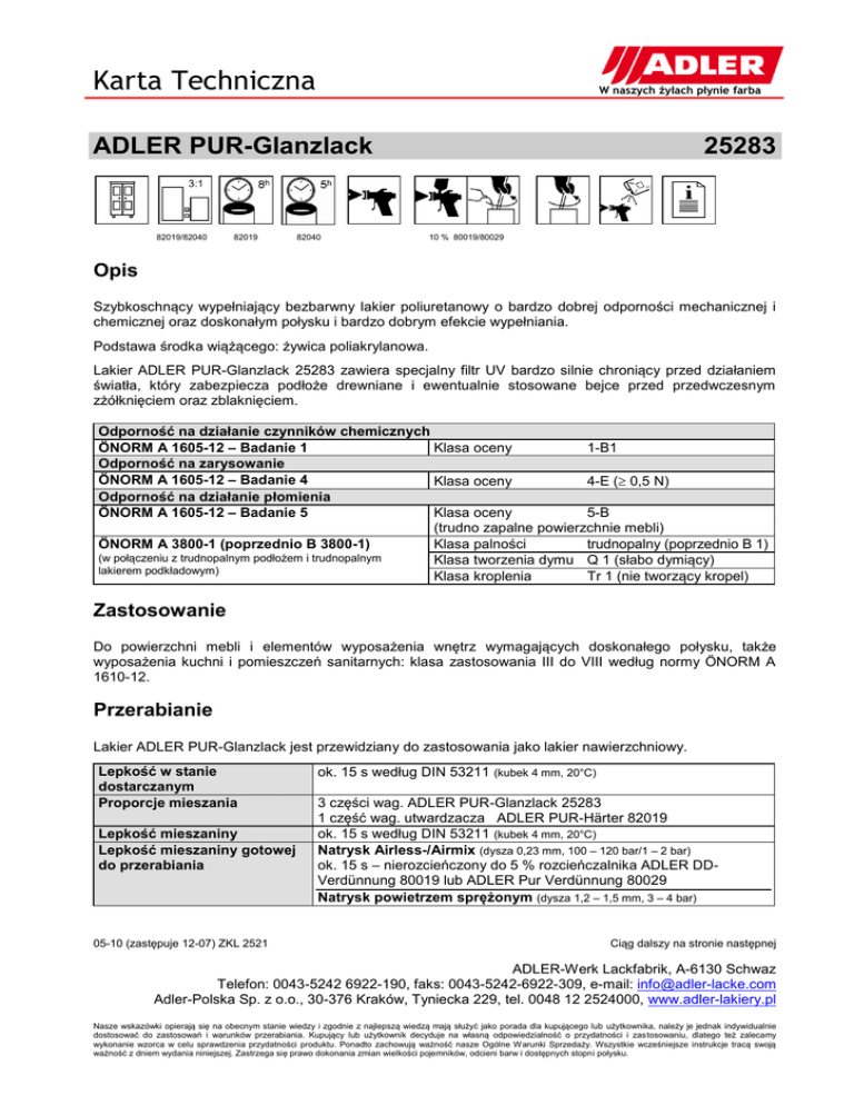 Karta Techniczna W naszych żyłach płynie farba ADLER PUR-Glanzlack 82019/82040 82019 82040 25283 10 % 80019/80029 Opis Szybkoschnący wypełniający bezbarwny lakier poliuretanowy o bardzo dobrej odporności mechanicznej i chemicznej oraz doskonałym połysku i bardzo dobrym efekcie wypełniania. Podstawa środka wiążącego: żywica poliakrylanowa. Lakier ADLER PUR-Glanzlack 25283 zawiera specjalny filtr UV bardzo silnie chroniący przed działaniem światła, który zabezpiecza podłoże drewniane i ewentualnie stosowane bejce przed przedwczesnym zżółknięciem oraz zblaknięciem. Odporność na działanie czynników chemicznych ÖNORM A 1605-12 – Badanie 1 Klasa oceny 1-B1 Odporność na zarysowanie ÖNORM A 1605-12 – Badanie 4 Klasa oceny 4-E ( 0,5 N) Odporność na działanie płomienia ÖNORM A 1605-12 – Badanie 5 Klasa oceny 5-B (trudno zapalne powierzchnie mebli) ÖNORM A 3800-1 (poprzednio B 3800-1) Klasa palności trudnopalny (poprzednio B 1) (w połączeniu z trudnopalnym podłożem i trudnopalnym Klasa tworzenia dymu Q 1 (słabo dymiący) lakierem podkładowym) Klasa kroplenia Tr 1 (nie tworzący kropel) Zastosowanie Do powierzchni mebli i elementów wyposażenia wnętrz wymagających doskonałego połysku, także wyposażenia kuchni i pomieszczeń sanitarnych: klasa zastosowania III do VIII według normy ÖNORM A 1610-12. Przerabianie Lakier ADLER PUR-Glanzlack jest przewidziany do zastosowania jako lakier nawierzchniowy. Lepkość w stanie dostarczanym Proporcje mieszania Lepkość mieszaniny Lepkość mieszaniny gotowej do przerabiania 05-10 (zastępuje 12-07) ZKL 2521 ok. 15 s według DIN 53211 (kubek 4 mm, 20°C) 3 części wag. ADLER PUR-Glanzlack 25283 1 część wag. utwardzacza ADLER PUR-Härter 82019 ok. 15 s według DIN 53211 (kubek 4 mm, 20°C) Natrysk Airless-/Airmix (dysza 0,23 mm, 100 – 120 bar/1 – 2 bar) ok. 15 s – nierozcieńczony do 5 % rozcieńczalnika ADLER DDVerdünnung 80019 lub ADLER Pur Verdünnung 80029 Natrysk powietrzem sprężonym (dysza 1,2 – 1,5 mm, 3 – 4 bar) Ciąg dalszy na stronie następnej ADLER-Werk Lackfabrik, A-6130 Schwaz Telefon: 0043-5242 6922-190, faks: 0043-5242-6922-309, e-mail: [email protected] Adler-Polska Sp. z o.o., 30-376 Kraków, Tyniecka 229, tel. 0048 12 2524000, www.adler-lakiery.pl Nasze wskazówki opierają się na obecnym stanie wiedzy i zgodnie z najlepszą wiedzą mają służyć jako porada dla kupującego lub użytkownika, należy je jednak indywidualnie dostosować do zastosowań i warunków przerabiania. Kupujący lub użytkownik decyduje na własną odpowiedzialność o przydatności i zastosowaniu, dlatego też zalecamy wykonanie wzorca w celu sprawdzenia przydatności produktu. Ponadto zachowują ważność nasze Ogólne W arunki Sprzedaży. Wszystkie wcześniejsze instrukcje tracą swoją ważność z dniem wydania niniejszej. Zastrzega się prawo dokonania zmian wielkości pojemników, odcieni barw i dostępnych stopni połysku. Ciąg dalszy ADLER PUR-Glanzlack 25283 ok. 14 s – 10 % rozcieńczalnika ADLER DD-Verdünnung 80019 lub ADLER Pur Verdünnung 80029 Czas przydatności mieszaniny ok. 8 godzin do użycia Ilości nanoszone ok. 100 g/m² na jedno naniesienie; całkowita ilość nanoszona PURGlanzlack 25283: maks. 350 g/m². W celu uzyskania powierzchni o wysokim połysku zaleca się dwukrotny natrysk bez szlifowania międzyoperacyjnego z wysychaniem przez 3 godziny. 2 Czas wysychania Warstwa 100 g/m naniesiona przez natrysk po ok. 30 min. wysychania (temperatura pomieszczenia 20°C) jest pyłosucha, po 12 godzinach nadaje się dobrze do manipulacji, a po 72 dwóch godzinach jest odporna na zlepianie się przylegających warstw. Polerowanie (taśmą płócienną Uzyskiwane powierzchnie po 3 dniach wysychania w temperaturze i zwykłe) pokojowej nadają się do polerowania, także taśmą płócienną. Informacja na temat przerabiania: Gdy pożądane jest szybsze wysychanie, to alternatywnie zamiast podanego wyżej utwardzacza można przerabiać następującą mieszaninę: Proporcje mieszania Lepkość mieszaniny Lepkość mieszaniny gotowej do przerabiania 3 części wag. lub obj. ADLER PUR-Glanzlack 25283 1 część wag. lub obj. utwardzacza ADLER PUR-Härter S 82040 ok. 15 s według DIN 53211 (kubek 4 mm, 20°C) Natrysk Airless-/Airmix (dysza 0,23 mm, 100 - 120 bar/1-2 bar) ok. 15 s – nierozcieńczony do 5 % rozcieńczalnika ADLER DDVerdünnung 80019 lub ADLER Pur Verdünnung 80029 Natrysk powietrzem sprężonym (dysza 1,2 - 1,5 mm, 3 - 4 bar) ok. 14 s - 10 % rozcieńczalnika ADLER DD-Verdünnung 80019 lub ADLER Pur Verdünnung 80029 Czas przydatności mieszaniny 5 godzin do przerabiania 2 Czas wysychania Warstwa 100 g/m naniesiona przez natrysk po ok. 30 min. wysychania (temperatura pomieszczenia 20°C) jest pyłosucha, po 12 godzinach nadaje się dobrze do manipulacji, a po 48 godzinach jest odporna na zlepianie się przylegających warstw. Polerowanie (taśmą płócienną Uzyskiwane powierzchnie po 2 dniach wysychania w temperaturze i zwykłe) pokojowej nadają się do polerowania, także taśmą płócienną. Lakier ADLER PUR-Glanzlack utwardzany za pomocą ADLER PUR-Härter S 82040 nie nadaje się do powierzchni bielonych nadtlenkiem wodoru (wodą utlenioną). Proszę przestrzegać naszych „Wytycznych do bezbarwnego lakierowania z wysokim połyskiem“ oraz „Wytycznych do lakierowania z wysokim połyskiem barwnych powłok kryjących” oraz zaleceń podanych w Kartach Charakterystyki dla lakieru, utwardzacza i rozcieńczalnika. Inne informacje Utwardzacz Rozcieńczalnik ADLER PUR-Härter 82019 lub ADLER PUR-Härter S 82040 ADLER DD-Verdünnung 80019 lub ADLER Pur Verdünnung 80029 Rozcieńczalniki te zalecamy również do czyszczenia narzędzi pracy. Wielkości pojemników 3 kg, 18 kg