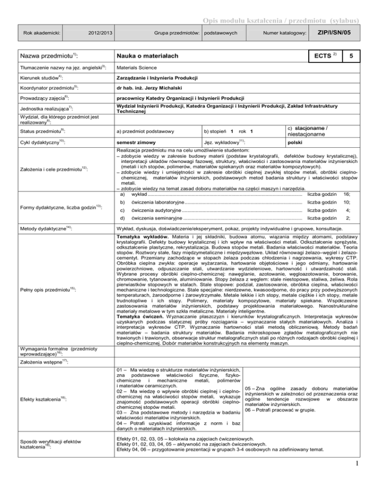 Opis modułu kształcenia / przedmiotu (sylabus) Rok akademicki: 2012/2013 Nazwa przedmiotu1): Grupa przedmiotów: podstawowych Numer katalogowy: ECTS 2) Nauka o materiałach 3) Tłumaczenie nazwy na jęz. angielski : 4) Kierunek studiów : ZIP/I/SN/05 5 Materials Science Zarządzanie i Inżynieria Produkcji 5) Koordynator przedmiotu : dr hab. inż. Jerzy Michalski 6) Prowadzący zajęcia : pracownicy Katedry Organizacji i Inżynierii Produkcji Wydział Inżynierii Produkcji, Katedra Organizacji i Inżynierii Produkcji, Zakład Infrastruktury Technicznej 7) Jednostka realizująca : Wydział, dla którego przedmiot jest 8) realizowany : 9) Status przedmiotu : a) przedmiot podstawowy 10) Cykl dydaktyczny : semestr zimowy b) stopień 1 rok 1 11) Jęz. wykładowy : c) stacjonarne / niestacjonarne polski Realizacja przedmiotu ma na celu umożliwienie studentom: zdobycie wiedzy w zakresie budowy materii (podstaw krystalografii, defektów budowy krystalicznej), interpretacji układów równowagi fazowej, struktury, właściwości i zastosowania materiałów inżynierskich (metali i ich stopów, polimerów, materiałów spiekanych oraz materiałów kompozytowych). zdobycie wiedzy i umiejętności w zakresie obróbki cieplnej zwykłej stopów metali, obróbki cieplnochemicznej, materiałów inżynierskich, podstawowych metod badania struktury i właściwości stopów metali. zdobycie wiedzy na temat zasad doboru materiałów na części maszyn i narzędzia. a) wykład ................................................................................................................. liczba godzin 16; 12) Założenia i cele przedmiotu : 13) Formy dydaktyczne, liczba godzin : 14) Metody dydaktyczne : 15) Pełny opis przedmiotu : b) ćwiczenia laboratoryjne...................................................................................... liczba godzin 10; c) ćwiczenia audytoryjne ........................................................................................ liczba godzin 4; d) ćwiczenia seminaryjne ....................................................................................... liczba godzin 2; Wykład, dyskusja, doświadczenie/eksperyment, pokaz, projekty indywidualne i grupowe, konsultacje. Tematyka wykładów. Materia i jej składniki, budowa atomu, wiązania między atomami, podstawy krystalografii. Defekty budowy krystalicznej i ich wpływ na właściwości metali. Odkształcenie sprężyste, odkształcenie plastyczne, rekrystalizacja. Budowa stopów metali. Badania właściwości materiałów. Teoria stopów. Roztwory stałe, fazy międzymetaliczne i międzywęzłowe. Układ równowagi żelazo–węgiel i żelazocementyt. Przemiany zachodzące w stopach żelaza podczas chłodzenia i nagrzewania, wykresy CTP. Obróbka cieplna zwykła: operacje wyżarzania, hartowanie objętościowe i jego odmiany, hartowanie powierzchniowe, odpuszczanie stali, utwardzanie wydzieleniowe, hartowność i utwardzalność stali. Wybrane procesy obróbki cieplno-chemicznej: nawęglanie, azotowanie, węgloazotowanie, borowanie, chromowanie, tytanowanie, aluminiowanie. Stopy żelaza z węglem: stale niestopowe, staliwa, żeliwa. Rola pierwiastków stopowych w stalach. Stale stopowe: podział, zastosowanie, obróbka cieplna, właściwości mechaniczne i technologiczne. Stale specjalne: nierdzewne, kwasoodporne, do pracy przy podwyższonych temperaturach, żaroodporne i żarowytrzymałe. Metale lekkie i ich stopy, metale ciężkie i ich stopy, metale trudnotopliwe i ich stopy. Polimery, materiały kompozytowe, materiały spiekane. Współczesne zastosowania materiałów inżynierskich, podstawy projektowania materiałowego. Nanostrukturalne materiały metalowe w tym szkła metaliczne. Materiały inteligentne. Tematyka ćwiczeń. Wyznaczanie płaszczyzn i kierunków krystalograficznych. Interpretacja wykresów uzyskanych podczas statycznej próby rozciągania – wyznaczanie stałych materiałowych. Analiza i interpretacja wykresów CTP. Wyznaczanie hartowności stali metodą obliczeniową. Metody badań materiałów – badania struktury materiałów. Badania mikroskopowe zgładów metalograficznych nie trawionych i trawionych, obserwacje struktur metalograficznych stali po różnych rodzajach obróbki cieplnej i cieplno-chemicznej. Dobór materiałów konstrukcyjnych na elementy maszyn. Wymagania formalne (przedmioty 16) wprowadzające) : 17) Założenia wstępne : Efekty kształcenia : 01 – Ma wiedzę o strukturze materiałów inżynierskich, zna podstawowe właściwości fizyczne, fizykochemiczne i mechaniczne metali, polimerów i materiałów ceramicznych. 02 – Ma wiedzę o wpływie obróbki cieplnej i cieplnochemicznej na właściwości stopów metali, wykazuje znajomość podstawowych operacji obróbki cieplnochemicznej stopów metali. 03 – Zna podstawowe metody i narzędzia w badaniu właściwości materiałów inżynierskich. 04 – Potrafi uzyskiwać informacje z norm i baz danych o materiałach inżynierskich. Sposób weryfikacji efektów 19) kształcenia : Efekty 01, 02, 03, 05 – kolokwia na zajęciach ćwiczeniowych. Efekty 01, 02, 03, 04, 05 – aktywność na zajęciach ćwiczeniowych. Efekty 04, 06 – przygotowanie prezentacji w grupach 3-4 osobowych na zdefiniowany temat. 18) 05 – Zna ogólne zasady doboru materiałów inżynierskich w zależności od przeznaczenia oraz ogólne tendencje rozwojowe w obszarze materiałów inżynierskich. 06 – Potrafi pracować w grupie. 1 Forma dokumentacji osiągniętych 20) efektów kształcenia : Elementy i wagi mające wpływ na ocenę 21) końcową : 22) Miejsce realizacji zajęć : Pisemne kolokwia, złożone prace studentów na zadany temat, karta obecności i ocen aktywności studentów na zajęciach. Pisemne kolokwia – 70%, złożone prace studentów na zadany temat – 20%, ocena wystąpień w trakcie zajęć – 10%. sale wykładowe, sale ćwiczeniowe, 23) Literatura podstawowa i uzupełniająca : 1. Ciszewski A., Radomski T., 