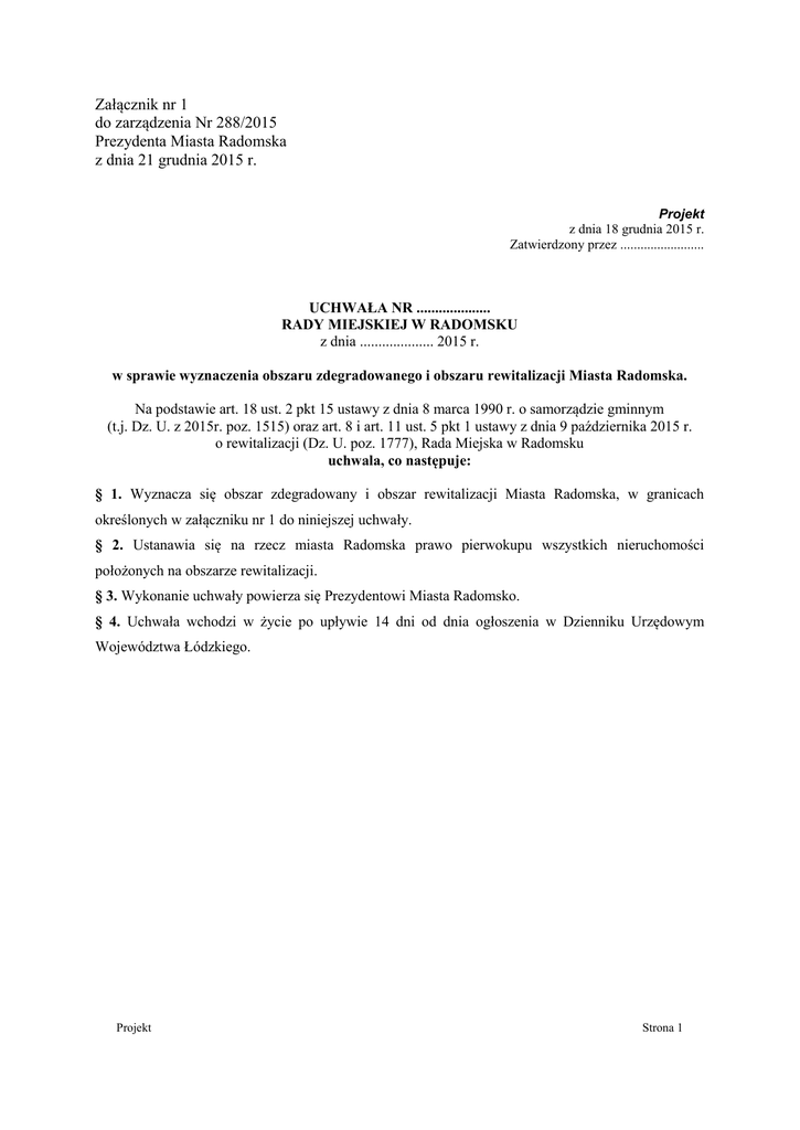 Załącznik nr 1 do zarządzenia Nr 288/2015 Prezydenta Miasta Radomska z dnia 21 grudnia 2015 r. Projekt z dnia 18 grudnia 2015 r. Zatwierdzony przez ......................... UCHWAŁA NR .................... RADY MIEJSKIEJ W RADOMSKU z dnia .................... 2015 r. w sprawie wyznaczenia obszaru zdegradowanego i obszaru rewitalizacji Miasta Radomska. Na podstawie art. 18 ust. 2 pkt 15 ustawy z dnia 8 marca 1990 r. o samorządzie gminnym (t.j. Dz. U. z 2015r. poz. 1515) oraz art. 8 i art. 11 ust. 5 pkt 1 ustawy z dnia 9 października 2015 r. o rewitalizacji (Dz. U. poz. 1777), Rada Miejska w Radomsku uchwala, co następuje: § 1. Wyznacza się obszar zdegradowany i obszar rewitalizacji Miasta Radomska, w granicach określonych w załączniku nr 1 do niniejszej uchwały. § 2. Ustanawia się na rzecz miasta Radomska prawo pierwokupu wszystkich nieruchomości położonych na obszarze rewitalizacji. § 3. Wykonanie uchwały powierza się Prezydentowi Miasta Radomsko. § 4. Uchwała wchodzi w życie po upływie 14 dni od dnia ogłoszenia w Dzienniku Urzędowym Województwa Łódzkiego. Projekt Strona 1 Załącznik nr 1 do uchwały Nr ……………………….. Rady Miejskiej w Radomsku z dnia …………………………………. Projekt Strona 1 Uzasadnienie Zgodnie z ustawą o rewitalizacji z dnia 9 października 2015 r. określającą zasady oraz tryb przygotowania, prowadzenia i oceny rewitalizacji, jak również zasady przygotowania, koordynowania i tworzenia warunków do prowadzenia rewitalizacji oraz postępowania w zakresie właściwości gminy uznano proces rewitalizacji za zadanie własne. Mając na uwadze realizację procesu rewitalizacji zgodnie z ustawą o rewitalizacji należy wyznaczyć w drodze uchwały Rady Miejskiej w Radomsku obszar zdegradowany oraz obszar rewitalizacji. Podstawą do prowadzenia prac nad procesem rewitalizacji stała się Krajowa Polityka Miejska przyjęta 20 października 2015 roku uchwałą nr 198 Rady Ministrów, w której wskazano, iż rewitalizacja jest najbardziej zaawansowanym procesem przemian realizowanym na obszarach zdegradowanych. Realizacja procesu rewitalizacji powinna odnosić się do wyznaczonego w oparciu o obiektywne kryteria terytorium oraz w wyniku wspólnych wysiłków różnych podmiotów spowodować trwałe ożywienie społeczne i gospodarcze obszaru, zwiększać jego atrakcyjność dla mieszkańców i przedsiębiorców oraz poprawiać jakość życia. Odnosząc się do założeń Krajowej Polityki Miejskiej uznano, iż rewitalizacja Miasta Radomska powinna być kluczowym programem społecznym i gospodarczym w ramach obszaru zdegradowanego i obszaru rewitalizacji. Również przyjęta Uchwała Sejmiku Województwa Łódzkiego nr XXXIII/644/13 z dnia 26 lutego 2013 r. dotycząca Strategii Rozwoju Województwa Łódzkiego 2020 wskazuje, iż działania rewitalizacyjne dotyczące zdegradowanych obszarów mieszkaniowych, poprzemysłowych, w tym zabytkowych układów przestrzennych oraz obiektów objętych ochroną zabytków stanowi istotny kierunek strategicznych działań Województwa Łódzkiego. Działania rewitalizacyjne powinny zakładać wsparcie dla tworzenia i realizacji projektów obejmujących kompleksową odnowę obszarów zdegradowanych, których efektem jest poprawa ładu przestrzennego. Zgodnie ze Strategią Rozwoju Województwa Łódzkiego oraz Strategią Rozwoju Powiatu Radomszczańskiego 2020 przyjętą w dniu 13 listopada 2014 roku uchwałą nr LIII/370/2014 Rady Powiatu Radomszczańskiego Miasto Radomsko położone jest na obszarze funkcjonalnym dorzecza rzeki Warty, co stanowi istotny aspekt w kontekście potencjału rekreacyjnego. Poprawa wizerunku obszaru zdegradowanego w znacznym stopniu zwiększy możliwości rozwoju rekreacji na terenie Miasta Radomska. Projekt Strona 1 Kolejnym dokumentem odnoszącym się do działań rewitalizacyjnych jest uchwała nr L/444/14 Rady Miejskiej w Radomsku z dnia 10 marca 2014 roku, w której przyjęto Strategię Rozwoju Miasta Radomsko 2020, która uwzględnia w ramach realizacji drugiego celu strategicznego rewitalizację centrum i obszarów powiązanych. Cel ten ma przyczynić się poprawy atrakcyjności inwestycyjnej i integracji gospodarczej miasta. Obszar centrum miasta jest bardzo istotny z punktu widzenia rozwoju gospodarczego a rozwiązanie problemów w tym zakresie poprawi atrakcyjność inwestycyjna obszaru Biorąc pod uwagę degradację tkanki społecznej w przeprowadzonej diagnozie uwzględniono również dane dotyczące Miejskiej Strategii Rozwiązywania Problemów Społecznych na lata 2014-2020, która została podjęta uchwałą nr XL VIII/427/14 Rady Miejskiej w Radomsku z dnia 24 stycznia 2014 r. Rozdział trzeci Miejskiej Strategii Rozwiązywania Problemów Społecznych na lata 2014-2020 wskazuje na główne obszary problemowe, które mają również odniesienie w przeprowadzonej diagnozie obszaru zdegradowanego. W prowadzonej na podstawie Zarządzenia nr 5/2012 Prezydenta Miasta Radomska z dnia 4 stycznia 2012 roku Gminnej Ewidencji Zabytków Gminy Miasto Radomsko znajduje się wykaz zabytków zlokalizowanych na wskazanym w diagnozie obszarze zdegradowanym i obszarze rewitalizacji. Mając na uwadze znaczenie historyczne obiektów należy podkreślić ich znaczenie dla dziedzictwa kulturowego Miasta Radomska oraz wpływ na budowanie tożsamości lokalnej. Istotnym aspektem związanym ze zlokalizowanymi na terenie Miasta Radomska zabytkami jest również przyjęty uchwałą nr IX/51/15 Rady Miejskiej w Radomsku z dnia 23 marca 2015 roku Programu Opieki nad Zabytkami Gminy Miasta Radomsko na lata 2015-2018. Dokument ten określa sposób prowadzenia działań związanych z poprawa stanu zabytków, ich adaptacji i rewaloryzacji prowadzącej do zwiększenia dostępności dla mieszkańców. W celu wyznaczenia obszaru zdegradowanego i obszaru rewitalizacji opracowano diagnozę, która została przeprowadzona na podstawie wiarygodnych i mierzalnych danych pozysk