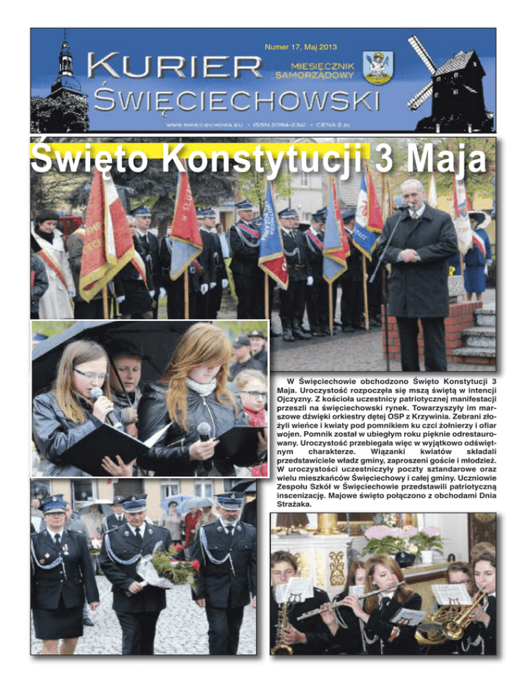 Numer 17, Maj 2013 Święto Konstytucji 3 Maja W Święciechowie obchodzono Święto Konstytucji 3 Maja. Uroczystość rozpoczęła się mszą świętą w intencji Ojczyzny. Z kościoła uczestnicy patriotycznej manifestacji przeszli na święciechowski rynek. Towarzyszyły im marszowe dźwięki orkiestry dętej OSP z Krzywinia. Zebrani złożyli wieńce i kwiaty pod pomnikiem ku czci żołnierzy i ofiar wojen. Pomnik został w ubiegłym roku pięknie odrestaurowany. Uroczystość przebiegała więc w wyjątkowo odświętnym charakterze. Wiązanki kwiatów składali przedstawiciele władz gminy, zaproszeni goście i młodzież. W uroczystości uczestniczyły poczty sztandarowe oraz wielu mieszkańców Święciechowy i całej gminy. Uczniowie Zespołu Szkół w Święciechowie przedstawili patriotyczną inscenizację. Majowe święto połączono z obchodami Dnia Strażaka. Ekologiczny konkurs rozstrzygnięty [2] Rozstrzygnięto konkurs pod nazwą „Daj przykład segregacji odpadów”. Był on adresowany do wszystkich mieszkańców gminy, a polegał na przedstawieniu własnego pomysłu na prowadzenie selekcji zbiórki odpadów. Uczestnicy konkursu mogli opisać sposób, w jaki sami segregują śmieci lub zaproponować, jak robić to najefektywniej i najbezpieczniej dla środowiska. Prace pisemne uzupełniali zdjęciami i grafikami. Konkurs trwał przez kilka miesięcy. Ogłosił go Urząd Gminy, ale KURIER ŚWIĘCIECHOWSKI dofinansowany był ze środków Narodowego Funduszu Ochrony Środowiska i Gospodarki Wodnej w ramach projektu „Segreguj odpady – to się opłaca”, realizowanego przez Rekopol Organizacje Odzysku S.A.. Do rywalizacji przystąpiło 10 osób. Ich prace oceniało jury w składzie: Jan Markiewicz, Kamila Skrzypczak i Marek Tulewicz. Przy ocenie brano pod uwagę estetykę i pomysłowość projektu, jego funkcjonalność, a także świadomość ekologiczną autora i wysiłek włożony w wzbogacenie projektu w ry- O Szlaku św. Jakuba Bardzo ciekawe wydarzenie kulturalne i społeczne miało miejsce w Głogowie. Otóż odbywała się tam międzynarodowa konferencja dotycząca projektu pod nazwą „Europejskie Drogi św. Jakuba”. Z naszego regionu brali w niej udział przedstawiciele samorządów i liderki Stowarzyszenia Liderek Rozwoju Lokalnego ze Święciechowy i Osiecznej. Jeden z referatów wygłosił Marek Wróbel, kierownik Pracowni Terenowej Narodowego Instytutu Dziedzictwa z Trzebin. W konferencji uczestniczyli realizatorzy projektu z Czech, Słowacji, Węgier, Słowenii, Szwajcarii, Niemiec i Polski. Byli więc przedstawiciele samorządów, Kościoła i organizacji turystycznych leżących na Szlaku św. Jakuba. A dyskutowano o wszystkich aspektach projektu. Były więc referaty dotyczące walorów Szlaku św. Jakuba, religijnych aspektów pielgrzymek, stanu projektu w Polsce, w tym między innymi platformy internetowej dotyczącej Szlaku, szkolenia przewodników, planów na rok 2013. Ale odpowiadano też na pytania, jakim „pro- sunki i zdjęcia. Ostatecznie przyznano 3 nagrody oraz kilka wyróżnień. I miejsce i laptopa z akcesoriami otrzymał Krzysztof Samelczak z Niechłodu. Miejsce II i kosiarka do trawy trafiły do Jakuba Mrozińskiego z Niechłodu. Natomiast III miejsce i odkurzacz piorący z akcesoriami odebrali Dorota i Marek Wróblowie z Trzebin. Pozostali uczestnicy otrzymali nagrody pocieszenia. duktem” jest Szlak św. Jakuba, jakie korzyści daje samorządom, co dzisiaj znaczy pielgrzymowanie. Marek Wróbel spojrzał na ten temat oczami zwykłego pielgrzyma. Mówił o tym, czego on oczekuje, jakich udogodnień na Szlaku się spodziewa, co chciałby uzyskać od lokalnych władz. A wie o tym najlepiej, bo pielgrzymi, idący Szlakiem przez naszą gminę, najczęściej zatrzymują się w Trzebinach. Konferencja była więc bardzo owocna. Pokazała, jak realizowany jest projekt w Europie i ile można dla niego zrobić w przyszłości. Pod koniec marca Tomasz Donaj (z klasy IIIa) i Paula John (z klasy IIb Gimnazjum w Święciechowie) brali udział w V Międzygimnazjalnym Konkursie Chemicznym, który odbył się w Lesznie. W konkursie brało udział 40 najlepszych uczniów gimnazjów leszczyńskich i niektórych miejscowości ościennych. Uczestnicy rozwiązywali skomplikowany test, w którym musieli wykazać się wiedzą teoretyczną. Tomasz Donaj został wyróżniony.Uczniowie mieli także możliwość obejrzenia spektakularnego pokazu doświadczeń chemicznych pod hasłem: "Zapraszamy wiosnę, wypędzamy zimę". Wręczenie nagród i podsumowanie konkursu odbyło się 30 kwietnia w Samorządowym Ośrodku Kultury. Zwycięzcom gratulował Marek Lorych, wójt gminy. Dzień Matki We wtorek, 28 maja, odbędzie się okolicznościowy koncert. Wszystkich, którzy chcą w ten radosny sposób uczcić święto mam, zapraszamy do sali w Świeciechowie o godzinie 18. 00. Wystąpi Zespół Pieśni i Tańca Marynia. Zaproszenia 19 maja o godzinie 13 rozpoczną się Zawody Sportowo – Pożarnicze. Impreza odbywać się będzie na boisku sportowym w Święciechowie. W konkurencjach pożarniczych rywalizować będą strażacy z poszczególnych OSP. 21 maja o godzinie 15 swoje święto będą mieli renciści i inwalidzi. Spotykają się w sali w Święciechowie z okazji Światowego Dnia Inwalidy. W części artystycznej wystąpią dzieci ze szkoły oraz młodsza grupa tancerzy Maryni. Zaproszenie skierowane jest do wszystkich członków Rejonowego Koła Emerytów, Rencistów i Inwalidów ze Święciechowy. 2 czerwca, w niedzielę, odbędzie się VIII Gminny Rajd Rowerowy, organizowany przez Stowarzyszenie ZMW w Przybyszewie. Start przewidziano na godzinę 14, ale już od 13 organizatorzy będą zapisywać rowerzystów. W tym roku wszyscy pojadą pod hasłem „Cudze chwalicie, swego nie znacie”. W trakcie rajdu przewidziano sporo atrakcji. Będą konkursy, zawody, nagrody. Sporna droga KURIER ŚWIĘCIECHOWSKI Od kilku lat mieszkańcy ulicy Henrykowskiej w Przybysz
