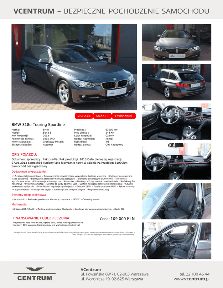 BMW 318d Touring Sportline Marka: Model: Rok Produkcji: Pojemność silnika : Kolor Nadwozia: Skrzynia biegów: BMW Seria 3 2013 1995 cm3 Grafitowy Metalik Automat Przebieg : Moc silnika : Kolor Wnętrza: Rodzaj nadwozia: Ilość drzwi: Rodzaj paliwa: 61000 km 143 KM Czarny Kombi 4/5 Olej napędowy OPIS POJAZDU: Dokument sprzedaży : Faktura-Vat Rok produkcji: 2013 Data pierwszej rejestracji: 27.06.2013 Samochód kupiony jako fabrycznie nowy w salonie PL Przebieg: 61000km Samochód bezwypadkowy Dodatkowe Wyposażenie ✓17-calowe felgi aluminiowe ✓Automatycznie przyciemniane wewnętrzne lusterko wsteczne ✓Elektrycznie otwierana klapa bagażnika ✓Elektrycznie sterowany hamulec postojowy ✓Elementy dekoracyjne aluminiowe ✓Kierownica wykończona skórą ✓Klimatyzacja automatyczna ✓Komputer pokładowy ✓Podgrzewane przednie fotele ✓Reflektory BiXenonowe ✓System Start/Stop ✓Światła do jazdy dziennej LED ✓System nawigacji satelitarnej Professional ✓Czujniki parkowania tył i przód ✓Drive Mode - regulacja trybów jazdy ✓Gniazdo 230V ✓Fotele sportowe BMW ✓Rękaw na narty ✓Czujnik deszczu ✓Elektryczne szyby ✓Automatyczna skrzynia biegów ✓Przyciemniane szyby Systemy Bezpieczeństwa ✓Servotronic ✓Poduszka powietrzna kierowcy i pasażera ✓ISOFIX ✓Centralny zamek Multimedia ✓Gniazdo USB / iPod® ✓Zestaw głośnomówiący Bluetooth ✓Sportowa kierownica wielofunkcyjna ✓Radio CD FINANSOWANIE I UBEZPIECZENIA: Cena: 109 000 PLN Przykładowa rata miesięczna, wpłata 20%, okres leasingu/kredytu 48 miesięcy, 10% wykupu. Rata leasingu jest wartością netto bez vat. Niniejsza treść nie stanowi oferty w rozumieniu przepisów Kodeksu Cywilnego oraz opisu towaru ani zapewnienia w rozumieniu art. 4 Ustawy z dnia 27 lipca 2002r o szczególnych warunkach sprzedaży konsumenckiej. Powered by TCPDF (www.tcpdf.org)
