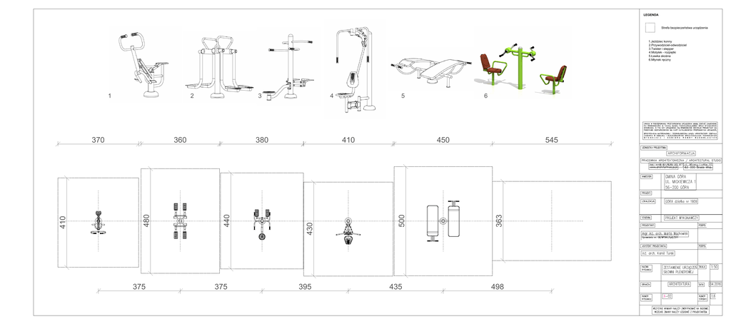 LEGENDA Strefa bezpieczeństwa urządzenia 1.Jeździec konny 2.Przywodziciel-odwodziciel 3.Twister i stepper 4.Motylek - rozpiętki 5.Ławka skośna 6.Młynek ręczny 375 375 5 410 395 6 450 435 545 363 4 380 440 360 480 410 370 3 500 2 430 1 498
