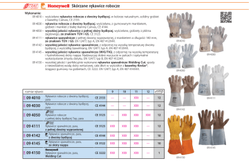 Skórzane rękawice robocze Wykonanie: 09 4010 – wyściełane rękawice robocze z dwoiny bydlęcej, w kolorze naturalnym, solidny grzbiet z bawełny Canvas, CE 2133. 09 4030 – rękawice robocze z dwoiny bydlęcej, wyściełane, z gumowanym mankietem, grzbiet i mankiet z białej tkaniny Canvas, CE 4144. 09 4050 – wysokiej jakości rękawice z pełnej skóry bydlęcej, wyściełane, grzbiety z płótna żaglowego, ze znakiem TÜV i GS, CE 3123. 09 4111 – rękawice spawalnicze z pełnej dwoiny wyprawionej, z mankietem o długości 140 mm, ze znakiem TÜV / GS. EN 12477, typ A, EN 407 412X4X. 09 4142 – wysokiej jakości rękawice spawalnicze, z odpornej na wysoką temperaturę dwoiny bydlęcej, z wyściółką bawełnianą. EN 12477, typ A, EN 407 413X4X. 09 4145 – wysokiej jakości rękawice spawalnicze (WIG/TIG), z odpornej na wysoką temperaturę i hydrofobowej skóry nappa. Nadzwyczaj dobre wyczucie w palcach i optymalne wykorzystanie zmysłu dotyku. EN 12477, typ B, EN 407 41224X. 09 4150 – wysokiej jakości i perfekcyjnie wykonane rękawice spawalnicze Welding Cut, spody z niezwilżalnej wodą skóry welurowej, cała dłoń w wyściółce z bawełny Kevlar®, ściągacz gumowy na grzbietach, CE 3222. EN 12477, typ A, EN 407 414X4X. 9 10 11 12 CE 2133 — — XXX — 12 CE 4144 — — XXX — 12 Rękawice robocze z pełnej skóry bydlęcej Top, para CE 3123 — XXX XXX XXX 12 Rękawice spawalnicze, para, z pełnej dwoiny wyprawionej Rękawice spawalnicze, para, z dwoiny bydlęcej Rękawice spawalnicze, para, ze skóry nappa CE 3123 XXX XXX XXX — 12 CE 4144 XXX XXX XXX — 10 CE 3122 XXX XXX XXX — 10 Rękawice spawalnicze, para, Welding Cut CE 3222 XXX XXX XXX — 1 09H 09 4010 09H 09 4030 09H 09 4050 09H 09 4111 09H 09 4142 09H 09 4145 09A rozmiar rękawic 09 4150 Rękawice robocze z dwoiny bydlęcej, para Rękawice robocze z dwoiny bydlęcej, para 09 4010 09 4030 09 4050 09 4111 09 4142 09 4145 09 4150