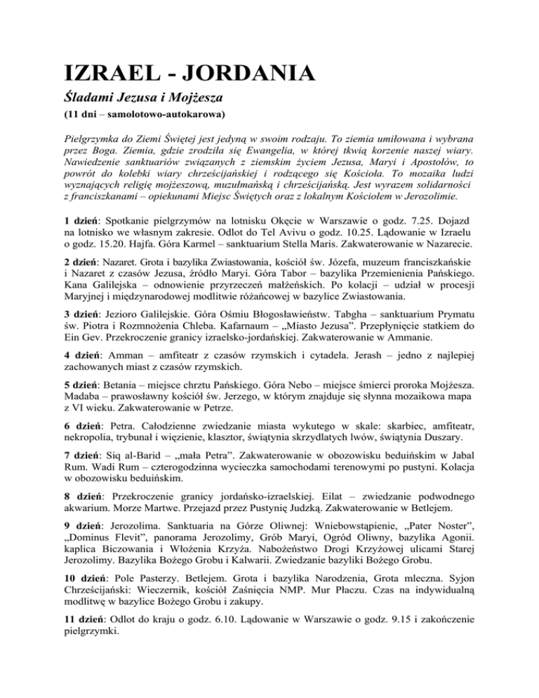 IZRAEL - JORDANIA Śladami Jezusa i Mojżesza (11 dni – samolotowo-autokarowa) Pielgrzymka do Ziemi Świętej jest jedyną w swoim rodzaju. To ziemia umiłowana i wybrana przez Boga. Ziemia, gdzie zrodziła się Ewangelia, w której tkwią korzenie naszej wiary. Nawiedzenie sanktuariów związanych z ziemskim życiem Jezusa, Maryi i Apostołów, to powrót do kolebki wiary chrześcijańskiej i rodzącego się Kościoła. To mozaika ludzi wyznających religię mojżeszową, muzułmańską i chrześcijańską. Jest wyrazem solidarności z franciszkanami – opiekunami Miejsc Świętych oraz z lokalnym Kościołem w Jerozolimie. 1 dzień: Spotkanie pielgrzymów na lotnisku Okęcie w Warszawie o godz. 7.25. Dojazd na lotnisko we własnym zakresie. Odlot do Tel Avivu o godz. 10.25. Lądowanie w Izraelu o godz. 15.20. Hajfa. Góra Karmel – sanktuarium Stella Maris. Zakwaterowanie w Nazarecie. 2 dzień: Nazaret. Grota i bazylika Zwiastowania, kościół św. Józefa, muzeum franciszkańskie i Nazaret z czasów Jezusa, źródło Maryi. Góra Tabor – bazylika Przemienienia Pańskiego. Kana Galilejska – odnowienie przyrzeczeń małżeńskich. Po kolacji – udział w procesji Maryjnej i międzynarodowej modlitwie różańcowej w bazylice Zwiastowania. 3 dzień: Jezioro Galilejskie. Góra Ośmiu Błogosławieństw. Tabgha – sanktuarium Prymatu św. Piotra i Rozmnożenia Chleba. Kafarnaum – „Miasto Jezusa”. Przepłynięcie statkiem do Ein Gev. Przekroczenie granicy izraelsko-jordańskiej. Zakwaterowanie w Ammanie. 4 dzień: Amman – amfiteatr z czasów rzymskich i cytadela. Jerash – jedno z najlepiej zachowanych miast z czasów rzymskich. 5 dzień: Betania – miejsce chrztu Pańskiego. Góra Nebo – miejsce śmierci proroka Mojżesza. Madaba – prawosławny kościół św. Jerzego, w którym znajduje się słynna mozaikowa mapa z VI wieku. Zakwaterowanie w Petrze. 6 dzień: Petra. Całodzienne zwiedzanie miasta wykutego w skale: skarbiec, amfiteatr, nekropolia, trybunał i więzienie, klasztor, świątynia skrzydlatych lwów, świątynia Duszary. 7 dzień: Siq al-Barid – „mała Petra”. Zakwaterowanie w obozowisku beduińskim w Jabal Rum. Wadi Rum – czterogodzinna wycieczka samochodami terenowymi po pustyni. Kolacja w obozowisku beduińskim. 8 dzień: Przekroczenie granicy jordańsko-izraelskiej. Eilat – zwiedzanie podwodnego akwarium. Morze Martwe. Przejazd przez Pustynię Judzką. Zakwaterowanie w Betlejem. 9 dzień: Jerozolima. Sanktuaria na Górze Oliwnej: Wniebowstąpienie, „Pater Noster”, „Dominus Flevit”, panorama Jerozolimy, Grób Maryi, Ogród Oliwny, bazylika Agonii. kaplica Biczowania i Włożenia Krzyża. Nabożeństwo Drogi Krzyżowej ulicami Starej Jerozolimy. Bazylika Bożego Grobu i Kalwarii. Zwiedzanie bazyliki Bożego Grobu. 10 dzień: Pole Pasterzy. Betlejem. Grota i bazylika Narodzenia, Grota mleczna. Syjon Chrześcijański: Wieczernik, kościół Zaśnięcia NMP. Mur Płaczu. Czas na indywidualną modlitwę w bazylice Bożego Grobu i zakupy. 11 dzień: Odlot do kraju o godz. 6.10. Lądowanie w Warszawie o godz. 9.15 i zakończenie pielgrzymki. Codziennie odprawiana jest Msza święta Organizatorzy zastrzegają sobie możliwość zmian w programie W Izraelu oprowadza duchowny z Polski; w Jordanii miejscowy przewodnik Kapłani zabierają albę i białą stułę TERMIN PIELGRZYMKI 15-25 listopada 2013 roku CENA PIELGRZYMKI 1980 zł i 1210 USD (dopłata za pokój jednoosobowy wynosi 420 USD) Osoby przewlekle chore zobowiązane są do wykupienia dodatkowego ubezpieczenia, którego koszt wynosi 300 zł ORGANIZATORZY ZAPEWNIAJĄ przelot samolotem na trasie Warszawa-Tel Awiw i Tel Awiw-Warszawa pełne wyżywienie (śniadanie, obiad i kolacja) zakwaterowanie w hotelach (pokoje 2 lub 3 osobowe z łazienką) autokar do dyspozycji grupy, przewodnik po miejscach świętych wszystkie bilety wstępu, taksówka na Górę Tabor, statek po Jeziorze Galilejskim wiza jordańska, opłaty przekroczenia granic, ubezpieczenie przewodnik-śpiewnik, znak grupy, certyfikat pielgrzyma BLIŻSZE INFORMACJE Fundacja Komisariat Ziemi Świętej ul. Reformacka 4, 31-012 Kraków tel. 12-421-68-06; tel. kom. 666-39-82-14 www.terrasancta.pl e-mail: [email protected] biuro czynne: od poniedziałku do piątku 900-1645