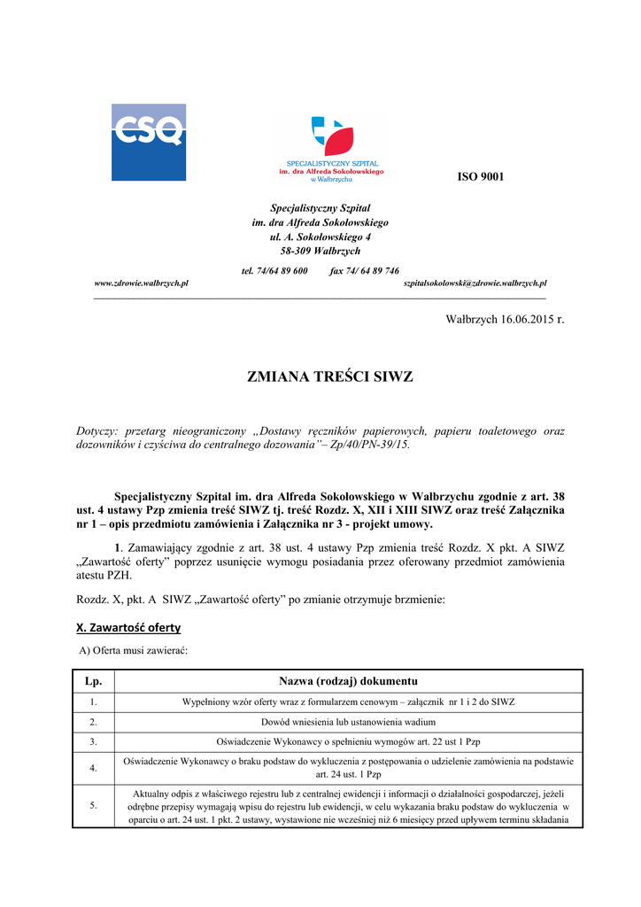 Zmiana specyfikacji - Specjalistyczny Szpital im. dra Alfreda