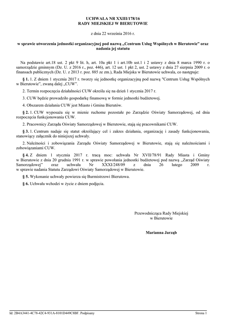 UCHWAŁA NR XXIII/178/16 RADY MIEJSKIEJ W BIERUTOWIE z dnia 22 września 2016 r. w sprawie utworzenia jednostki organizacyjnej pod nazwą ,,Centrum Usług Wspólnych w Bierutowie” oraz nadania jej statutu Na podstawie art.18 ust. 2 pkt 9 lit. h, art. 10a pkt 1 i art.10b ust.1 i 2 ustawy z dnia 8 marca 1990 r. o samorządzie gminnym (Dz. U. z 2016 r., poz. 446), art. 12 ust. 1 pkt 2, ust. 2 ustawy z dnia 27 sierpnia 2009 r. o finansach publicznych (Dz. U. z 2013 r. poz. 885 ze zm.), Rada Miejska w Bierutowie uchwala, co następuje: § 1. 1. Z dniem 1 stycznia 2017 r. tworzy się jednostkę organizacyjną pod nazwą "Centrum Usług Wspólnych w Bierutowie”, zwaną dalej „CUW”. 2. Termin rozpoczęcia działalności CUW określa się na dzień 1 stycznia 2017 r. 3. CUW będzie prowadziło gospodarkę finansową w formie jednostki budżetowej. 4. Obszarem działania CUW jest Miasto i Gmina Bierutów. § 2. 1. CUW wyposaża się w mienie ruchome pozostałe po Zarządzie Oświaty Samorządowej, od dnia rozpoczęcia funkcjonowania CUW. 2. Pracownicy Zarządu Oświaty Samorządowej w Bierutowie, stają się pracownikami CUW. § 3. 1. Centrum nadaje się statut określający cel i zakres działania, organizację i zasady funkcjonowania, stanowiący załącznik do niniejszej uchwały. 2. Należności i zobowiązania Zarządu Oświaty Samorządowej w Bierutowie, stają się należnościami i zobowiązaniami CUW. § 4. Z dniem 1 stycznia 2017 r. tracą moc: uchwała Nr XVII/78/91 Rady Miasta i Gminy w Bierutowie z dnia 20 grudnia 1991 r. w sprawie powołania jednostki budżetowej pod nazwą ,,Zarząd Oświaty Samorządowej” oraz uchwała Nr XXXI/248/09 z dnia 26 lutego 2009 r. w sprawie nadania Statutu Zarządowi Oświaty Samorządowej w Bierutowie. § 5. Wykonanie uchwały powierza się Burmistrzowi Bierutowa. § 6. Uchwała wchodzi w życie z dniem podjęcia. Przewodnicząca Rady Miejskiej w Bierutowie Marianna Jarząb Id: 2B4A3441-4C78-42C4-931A-8101D449C8BF. Podpisany Strona 1 Załącznik do uchwały Nr XXIII/178/16 Rady Miejskiej w Bierutowie z dnia 22 września 2016 r. STATUT CENTRUM USŁUG WSPÓLNYCH W BIERUTOWIE Dział I Przepisy ogólne § 1. Centrum Usług Wspólnych w Bierutowie jest samodzielną jednostką organizacyjną Miasta i Gminy Bierutów, nieposiadającą osobowości prawnej, działającą jako wyodrębniona jednostka budżetowa - zwaną dalej „CUW”. § 2.1. Siedzibą CUW jest miasto Bierutów. 2. Nadzór nad działalnością CUW sprawuje Burmistrz Bierutowa. Dział II Cel i zakres działania § 3. 1. CUW realizuje, organizuje i prowadzi zadania jednostki obsługującej, polegające na obsłudze administracyjnej, finansowej oraz organizacyjnej, następujących obsługiwanych jednostek organizacyjnych Miasta i Gminy Bierutów: 1) Gimnazjum Publiczne w Bierutowie (jednostka budżetowa), 2) Szkoła Podstawowa w Bierutowie (jednostka budżetowa), 3) Szkoła Podstawowa w Wabienicach (jednostka budżetowa), 4) Szkoła Podstawowa w Zbytowej (jednostka budżetowa), 5) Przedszkole Miejskie w Bierutowie (jednostka budżetowa). 2. CUW wykonuje zadania, o których mowa w ust. 1 w zakresie: 1) obsługi kadrowo – płacowej, 2) rachunkowości i sprawozdawczości, w tym sprawozdawczości finansowej, budżetowej i oświatowej, 3) administracyjno – organizacyjnym, 4) udzielania zamówień publicznych, 5) czynności w zakresie kompetencji organu prowadzącego jednostek wymienionych w § 3 ust.1 pkt 1-5 niniejszej uchwały, wynikających z przepisów prawa oświatowego. § 4. W celu zapewnienia prawidłowej realizacji zadań statutowych CUW określonych w § 3 Statutu, CUW: 1) współpracuje z komórkami organizacyjnymi Urzędu Miejskiego w Bierutowie oraz jednostkami organizacyjnymi Miasta i Gminy Bierutów, w szczególności wymienionymi w § 3 Statutu, 2) współpracuje z organizacjami pozarządowymi zajmującymi się w szczególności działalnością oświatową, kulturalną, pomocy społecznej, 3) współpracuje z innymi podmiotami. Id: 2B4A3441-4C78-42C4-931A-8101D449C8BF. Podpisany Strona 1 Dział III Organizacja i zarządzanie § 5. Na czele CUW stoi Dyrektor, który kieruje CUW jednoosobowo i ponosi pełną odpowiedzialność za jego funkcjonowanie. § 6. 1. Dyrektor CUW reprezentuje Miasto i Gminę Bierutów w zakresie działalności CUW na podstawie pełnomocnictwa udzielonego przez Burmistrza Bierutowa. 2. CUW mogą być – pod warunkiem zapewnienia odpowiednich środków finansowych – zlecone inne zadania, w tym z zakresu administracji publicznej. 3. Szczegółowy zakres działania CUW w tym strukturę organizacyjną, określa Regulamin Organizacyjny opracowany przez Dyrektora CUW i zatwierdzony przez Burmistrza Bierutowa w formie zarządzenia. Dział IV Gospodarka finansowa § 7. 1. Podstawą działania CUW jest roczny plan finansowy zgodny z ustalonym budżetem Miasta i Gminy Bierutów. 2. CUW realizuje zadania ze środków finansowych zatwierdzonych uchwałą budżetową Miasta i Gminy Bierutów. 3. Dyrektor odpowiada za prawidłowe gospodarowanie powierzonym mieniem. § 8. Zmiany statutu są dokonywane w trybie i na zasadach obowiązujących dla jego nadania. Przewodnicząca Rady Miejskiej w Bierutowie Marianna Jarząb Id: 2B4A3441-4C78-42C4-931A-8101D449C8BF. Podpisany Strona 2 UZASADNIENIE W o dniu samorządzie 25 czerwca gminnym (por. 2015 r. ustawodawca ustawa z dnia 25 wprowadził czerwca 2015 zmiany r. o do zmianie ustawy ustawy o samorządzie gminnym oraz niektórych innych ustaw (Dz. U. z 2015 r. poz. 1045)), dając samorządom możliwość racjonalizacji kosztów działalności ich jednostek. Wprowadzone zmiany spowodowały, że na ich podstawie gmina może zapewnić swoim jednostkom organizacyjnym zaliczanym do sektora finansów publicznych, a także gminnym instytucjom kultury, wspólną obsługę w szczególności administracyjną, finansową i organizacyjną (por. art. 10a ustawy). Należy zauważyć, że dodane do ustawy o samorządzie gminnym prze