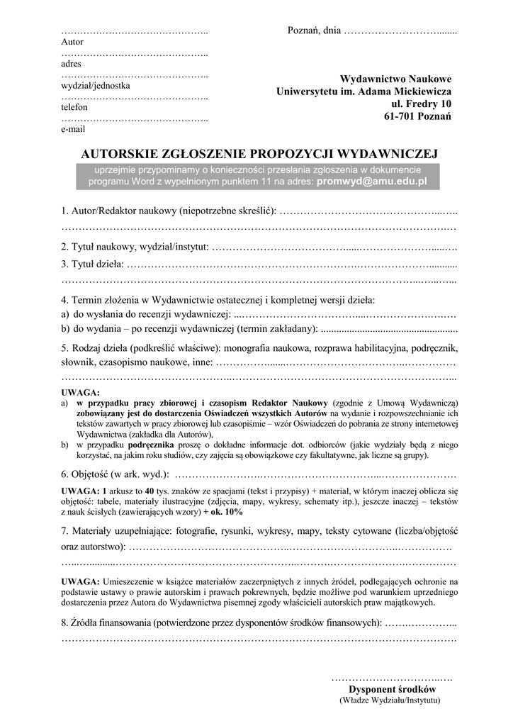 ……………………………………….. Autor ……………………………………….. adres ……………………………………….. wydział/jednostka ……………………………………….. telefon ……………………………………….. e-mail Poznań, dnia ………………………........ Wydawnictwo Naukowe Uniwersytetu im. Adama Mickiewicza ul. Fredry 10 61-701 Poznań AUTORSKIE ZGŁOSZENIE PROPOZYCJI WYDAWNICZEJ uprzejmie przypominamy o konieczności przesłania zgłoszenia w dokumencie programu Word z wypełnionym punktem 11 na adres: [email protected] 1. Autor/Redaktor naukowy (niepotrzebne skreślić): ………………………………………...….. ………………………………………………………………………………………………….… 2. Tytuł naukowy, wydział/instytut: ………………………………….....………………….....…. 3. Tytuł dzieła: ………………………………………………………….…………………........... …………………………………………………………………………………………...…...…... 4. Termin złożenia w Wydawnictwie ostatecznej i kompletnej wersji dzieła: a) do wysłania do recenzji wydawniczej: ...……………………………....……………….….…. b) do wydania – po recenzji wydawniczej (termin zakładany): ..................................................... 5. Rodzaj dzieła (podkreślić właściwe): monografia naukowa, rozprawa habilitacyjna, podręcznik, słownik, czasopismo naukowe, inne: …………….......……………………………..…………… …………………………………………..………………………………………………………... UWAGA: a) w przypadku pracy zbiorowej i czasopism Redaktor Naukowy (zgodnie z Umową Wydawniczą) zobowiązany jest do dostarczenia Oświadczeń wszystkich Autorów na wydanie i rozpowszechnianie ich tekstów zawartych w pracy zbiorowej lub czasopiśmie – wzór Oświadczeń do pobrania ze strony internetowej Wydawnictwa (zakładka dla Autorów), b) w przypadku podręcznika proszę o dokładne informacje dot. odbiorców (jakie wydziały będą z niego korzystać, na jakim roku studiów, czy zajęcia są obowiązkowe czy fakultatywne, jak liczne są grupy). 6. Objętość (w ark. wyd.): …………………….……………………………...…………………. UWAGA: 1 arkusz to 40 tys. znaków ze spacjami (tekst i przypisy) + materiał, w którym inaczej oblicza się objętość: tabele, materiały ilustracyjne (zdjęcia, mapy, wykresy, schematy itp.), jeszcze inaczej – tekstów z nauk ścisłych (zawierających wzory) + ok. 10% 7. Materiały uzupełniające: fotografie, rysunki, wykresy, mapy, teksty cytowane (liczba/objętość oraz autorstwo): ………………………………………..…………………………..……………. …...…..........……………………………………………..……….………………….…………… UWAGA: Umieszczenie w książce materiałów zaczerpniętych z innych źródeł, podlegających ochronie na podstawie ustawy o prawie autorskim i prawach pokrewnych, będzie możliwe pod warunkiem uprzedniego dostarczenia przez Autora do Wydawnictwa pisemnej zgody właścicieli autorskich praw majątkowych. 8. Źródła finansowania (potwierdzone przez dysponentów środków finansowych): …….…………... ……………………………………………………………………………………………………. …………………………..…. Dysponent środków (Władze Wydziału/Instytutu) 9. Czy Autor wydał (lub wydaje) publikacje z tej tematyki (gdzie i kiedy) …………………….. ……………………………………………………………………………………………….…… …………………………………………………………………………………………...……..... 10. Inne prace z tej dziedziny dostępne na rynku: ………………………………………..……... …………………………………………………………………………………………….……… ………………………………………………………………………………………….………… …………………………………………………………………………………………………… 11. Informacja o książce – do 1200 znaków ze spacjami (do zamieszczenia w zapowiedziach wydawniczych oraz na stronie internetowej Wydawnictwa): ………………………………………………………………………………………………….… ……………………………………………………………………………………………….…… …………………………………………………………………………………………….……… ………………………………………………………………………………………….………… ……………………………………………………………………………………….…………… …………………………………………………………………………………….……………… ………………………………………………………………………………….………………… …………………………………………………………………………………….……………… 12. Streszczenie (2-3 strony, tj. 3600-5400 znaków ze spacjami) dostarczone z ostateczną wersją dzieła po recenzji wydawniczej w języku polskim i w miarę możliwości – angielskim. 13. Słowa kluczowe po polsku i angielsku (kryterium wyszukiwania dla danej pozycji): ……........ …………………………………………………………….…………………………..………….. …