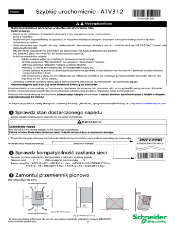 Szybkie uruchomienie - ATV312 POLSKI S1A1094202 Niebezpiczeństwo Niebezpieczeństwo porażenia, wybuchu lub utworzenia łuku elektrycznego • Zapoznaj sie dokładnie z instukcjami zawartymi w tym dokumencie przez rozpoczęciem pracy z napędem • Użytkownik jest odpowiedzialny za zgodność ze wszystkimi międzynarodowymi i krojowymi wymogami elektrycznymi w sprawie uziemnienia urządzeń. • Wiele elementów tego napędu, wliczając plytkę obwodu drukowanego, działają w oparciu o zasilanie sieciowe. NIE DOTYKAĆ. Używać tylko izolowanych narzędzi. • NIE DOTYKAĆ nieizolowanych elementów ani złącz śrubowych kiedy podłączone jest zasilanie • NIE ZWIERAĆ złącz PA/+ oraz PC/- ani kondensatorów szyny DC. • Przed serwisowaniem napędu: - Odłącz zasilanie włącznie z zasilaniem sterowania zewnętrzenego. - Umieść oznaczenie “NIE WŁĄCZAĆ” na wszystkich rozłącznikach napięcia. - Zablokuj wszystkie rozłączniki napięcia w pozycji otwartej. - Poczekaj 15 minut aby rozładowały sie konsdensatory szyny DC. - Zmierz napięcie na szynie DC pomiędzyMeasure the voltage of the DC bus between the PA/+ and PC/- terminals to ensure that the voltage is less than 42 Vdc. - Jeśli kondensatory szyny DC nie rozładowały sie całkowicie skontaktuj sie z lokalnym przedstawicielem Schneider electric. Nie naprawiaj ani nie używaj napędu. • Zainstaluj i zamknij wszystkie osłony przed przywróceniem zasilania lub uruchomieniem i zatrzymaniem napędu. Nieprzestrzeganie tych instrukcji może m oże skutkować śmiercią lub kalectwem. Urządzenia elektryczne powinny być instalowane, operowane, serwisowane i utrzymywane tylko przez wykwalifikowany personel. Schneider Electric nie ponosi odpowiedzialności za konsekwencje wykorzystania produktu niezgodnie z jego przeznaczeniem. Poniższe informacje dotyczą wykorzystania pojedynczego napędu połączonego z jednym silnikiem asynchronicznym z kablem o długości nieprzekraczającej 50 metrów. W innych przypadkach, należy skorzystać z instrukcji instalacji (BBV46391) i programowania (BBV46385) ze strony www.schneider-electric.com. 1 Sprawdz stan dostarczonego napędu • Wyjmij napęd z opaklowania i sprawdz czy nie został uszkodzony. Ostrzeżenie Uszkodzony napęd Nie używaj ani nie używaj napędu, który może byc uszkodzony. Faillure to follow these in structions can res Fai result in death death , seriou seriou s in jury, or equi equ ipm ent dam dam age. • Check that the drive reference printed on the label matches the delivery note and corresponding purchase order. Write the drive Model Reference: 2 and Serial Number: Sprawdz kompatybilność zasilania sieci • Sprawdz czy linia zasilania jest kompatybilna z zakresem zasialnia napedu Napięcie sieci V / Zakres zaslania przemiennika V Zakres napędów: ATV312•••• M2 = 200/240 V 1 faza / ATV312•••• M3=200/240 V 3 fazy ATV312 •••• N4 = 380/500 V 3 fazy / ATV312•••• S6 = 525/600 V 3 fazy 3 8B0917121134 Zamontuj przemiennik pionowo (a) Dla temperatury do 50 °C (a) (a) (a) (b) (a) 50 mm (2 in.) (b) 10 mm (0.4 in.) W celu pozyskania informacji dla innych warunków przejdź do instrukcji instalacji BBV46391). www.schneider-electric.com 1/4 S1A10942 - 02/2012 4 Podłącz przewody zasilania Podłączenie przewodów sterujących i konfiguracja: 5.1 or 5.2 5 • Podłącz przemiennik do uziemnienia • Sprawdz klasyfikacje bezpieczeństwa (sprawdz aneks SCCR ) • Sprawdz kompatybilność napięcia falownika i silnika Motor voltage Volts. • Podłącz przewody do silnika. • Podłącz przemiennik do zasilania. [REMOTE configuration] 5. (Sterowanie przez zewnętrzne odniesienie) 1 Source CLI SINK • Ensure SW1 = ‘’SOURCE’’ • Przewody zadawanie predkosci: predkosci: 200/240 V RE ATV312•••M2 RU F N MO CA N N R COM ER AI 1 NF +10 v CO or 2.2 KΩ See SCCR annex 200/240 V • Przewody sterowania: sterowania: Sterowanie 2 przewodowe: ATV312•••M3 ATV 312 24 V LI1 Sterowanie 3 przewodowe: ATV 312 LUB LI2 24 V LI1 LI2 LIx 380/500 V ATV312•••N4 LI1: przód LI2: tył 525/600 V LI1: stop LI2: przód 6 + 7 + 8 + • Next steps, do: LIx: tył .9.9.1 ATV312•••S6 [KONFIGURACJA LOCAL] 5. (Sterowanie przez wewnętrzne odniesienie). 2 REF MO RUN cz Do: N CO NF 6 • • • • Włącz zasilanie napędu Upewnij czy wejscia logiczne nie są aktywne(Li1,Li2,Lix). Włącz zasilanie. Przy pierwszym uruchomieniu, pokazuje nSt (3 przewodowe) lub rdY'3(2 przewodowe), po wcisnieciu Przy kolejnym uruchomieniu napęd wyświetla nSt'3lub rdY .'3 7 6 + 7 + 8 + 9.2 ENT wyświetla bFr. Ustaw parametry silnika • Zapoznaj sie z tabliczką znamionową silnika aby ustawić poniższe punkty. Menu Code bFr UnS drC[MOTOR CONTROL] FrS nCr nSP COS www.schneider-electric.com Description Factory setting [Standard mot. freq]: Standardowa częstotliwość silnika (Hz) [Rated motor volt.]: Znamionowe napięcie silnika (V) [Rated motor freq.]: Znamionowa częstotliwość silnika (Hz) [Rated mot. current.]: Znamionowe natężenie silnikan (A) [Rated motor speed]: Znamionowa prędkość obrotowa silnika (rpm) [Motor 1 Cosinus Phi.]: Znamionowy cos ϕ silnika 2/4 Customer setting 50.0 drive rating 50.0 drive rating drive rating drive rating S1A10942 - 02/2012 7 Ustaw parametry silnika (kontynuacja) • Ustaw tUn parametr na YES. Menu drC[MOTOR CONTROL] Code tUn Description Factory setting [Auto Tunning]: Auto-Tunning do UnS, FrS, nCr, nSP, nPr'3and COS nO Niebezpieczeństwo Niebezpieczeństwo porażenia, wybuchu lub utworzenia łuku elektrycznego • PodDuring auto-tuning, silnik pracuje na znamionowej częstotliwości • Nie obsługiwać silnika auto-tuningu. Nieprzestrzeganie tych instrukcji może skutkować śmiercią lub kalectwem. kalectwem . 8 Niebezpieczeństwo Niezamierzona praca wyposażenia • Znamionowe parametry silnika UnS, FrS, nCr, nSP, nPr i COS muszą być odpowiednio skonfigurowane przed auto-tuningiem. • Jeśli jeden lub więc