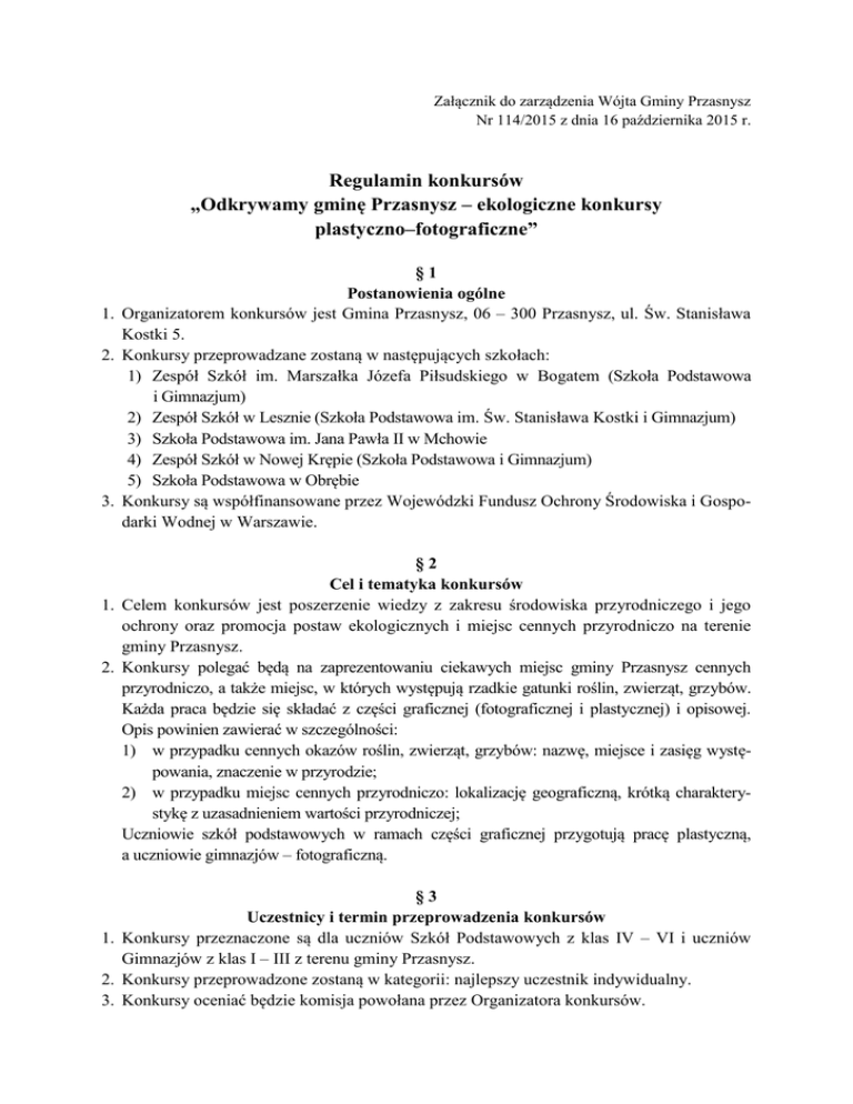 Załącznik do zarządzenia Wójta Gminy Przasnysz Nr 114/2015 z dnia 16 października 2015 r. Regulamin konkursów „Odkrywamy gminę Przasnysz – ekologiczne konkursy plastyczno–fotograficzne” §1 Postanowienia ogólne 1. Organizatorem konkursów jest Gmina Przasnysz, 06 – 300 Przasnysz, ul. Św. Stanisława Kostki 5. 2. Konkursy przeprowadzane zostaną w następujących szkołach: 1) Zespół Szkół im. Marszałka Józefa Piłsudskiego w Bogatem (Szkoła Podstawowa i Gimnazjum) 2) Zespół Szkół w Lesznie (Szkoła Podstawowa im. Św. Stanisława Kostki i Gimnazjum) 3) Szkoła Podstawowa im. Jana Pawła II w Mchowie 4) Zespół Szkół w Nowej Krępie (Szkoła Podstawowa i Gimnazjum) 5) Szkoła Podstawowa w Obrębie 3. Konkursy są współfinansowane przez Wojewódzki Fundusz Ochrony Środowiska i Gospodarki Wodnej w Warszawie. §2 Cel i tematyka konkursów 1. Celem konkursów jest poszerzenie wiedzy z zakresu środowiska przyrodniczego i jego ochrony oraz promocja postaw ekologicznych i miejsc cennych przyrodniczo na terenie gminy Przasnysz. 2. Konkursy polegać będą na zaprezentowaniu ciekawych miejsc gminy Przasnysz cennych przyrodniczo, a także miejsc, w których występują rzadkie gatunki roślin, zwierząt, grzybów. Każda praca będzie się składać z części graficznej (fotograficznej i plastycznej) i opisowej. Opis powinien zawierać w szczególności: 1) w przypadku cennych okazów roślin, zwierząt, grzybów: nazwę, miejsce i zasięg występowania, znaczenie w przyrodzie; 2) w przypadku miejsc cennych przyrodniczo: lokalizację geograficzną, krótką charakterystykę z uzasadnieniem wartości przyrodniczej; Uczniowie szkół podstawowych w ramach części graficznej przygotują pracę plastyczną, a uczniowie gimnazjów – fotograficzną. §3 Uczestnicy i termin przeprowadzenia konkursów 1. Konkursy przeznaczone są dla uczniów Szkół Podstawowych z klas IV – VI i uczniów Gimnazjów z klas I – III z terenu gminy Przasnysz. 2. Konkursy przeprowadzone zostaną w kategorii: najlepszy uczestnik indywidualny. 3. Konkursy oceniać będzie komisja powołana przez Organizatora konkursów. 4. Odpowiedzialnym za przeprowadzenie konkursu w poszczególnej szkole będzie szkolny koordynator konkursu – członek komisji konkursowej. §4 Przebieg konkursów 1. Konkurs / przygotowanie prac konkursowych rozpocznie się w dniu 23 października 2015 roku. 2. Konkursy rozstrzygane będą niezależnie w każdej szkole wskazanej w § 1 ust. 2. 3. Szkolny koordynator konkursu z placówki wskazanej w § 1 ust. 2 zgłasza w dniach 19 października 2015 r. – 22 października 2015 r. do Organizatora uczestników konkursu. Zgłoszenie wraz z oświadczeniem rodziców (opiekunów prawnych) złożyć należy w sekretariacie Urzędu Gminy Przasnysz, ul. Św. Stanisława Kostki 5, 06 – 300 Przasnysz. 4. Uczestnicy konkursów pracę konkursową przygotują w dniach 23 października 2015 r. – 9 listopada 2015 r. 5. Oceny prac dokona komisja powołana przez Organizatora konkursów; komisja czuwać będzie nad prawidłowym przebiegiem konkursów. 6. Komisja oceniać będzie m. in.: 1) wartość przyrodniczą prezentowanego miejsca; 2) częstotliwość występowania danej rośliny, zwierzęcia, grzyba; 3) estetykę wykonania pracy; 4) zakres opisu; 5) formę zaprezentowania pracy; 7. Prace plastyczne mogą być wykonane dowolną techniką plastyczną (np. ołówek, kredka, akwarela, farby plakatowe, wycinanki itp.) na papierze o dowolnym formacie. 8. Wykonanie zdjęcia zalecane jest na papierze fotograficznym, wymiary minimalne: 210 mm x 148 mm (format A5). 9. Każda praca powinna być podpisana w następujący sposób: imię i nazwisko ucznia, nazwa szkoły, klasa. 10. Po zaprezentowaniu wszystkich prac w poszczególnej szkole komisja dokonuje ich oceny za pośrednictwem głosowania. Zwycięży uczestnik, którego praca zdobyła największą ilość głosów, w przypadku równej liczby głosów decyduje głos Przewodniczącego komisji. 11. Rozstrzygnięcia komisji są ostateczne i nie przysługuje od nich odwołanie. §5 Nagrody 1. Nagrodzeni zostaną uczestnicy indywidualni w poszczególnych szkołach: 1) nagroda za I miejsce: aparat fotograficzny; 2) nagroda za II miejsce: tablet; 3) nagroda za III miejsce: plecak turystyczny; 2. Każdy nienagrodzony Uczestnik konkursu otrzyma nagrodę pocieszenia w postaci sadzonki: świerk srebrny kłujący. §6 Uwagi końcowe Sprawy nieuregulowane w regulaminie rozstrzyga Organizator konkursów.
