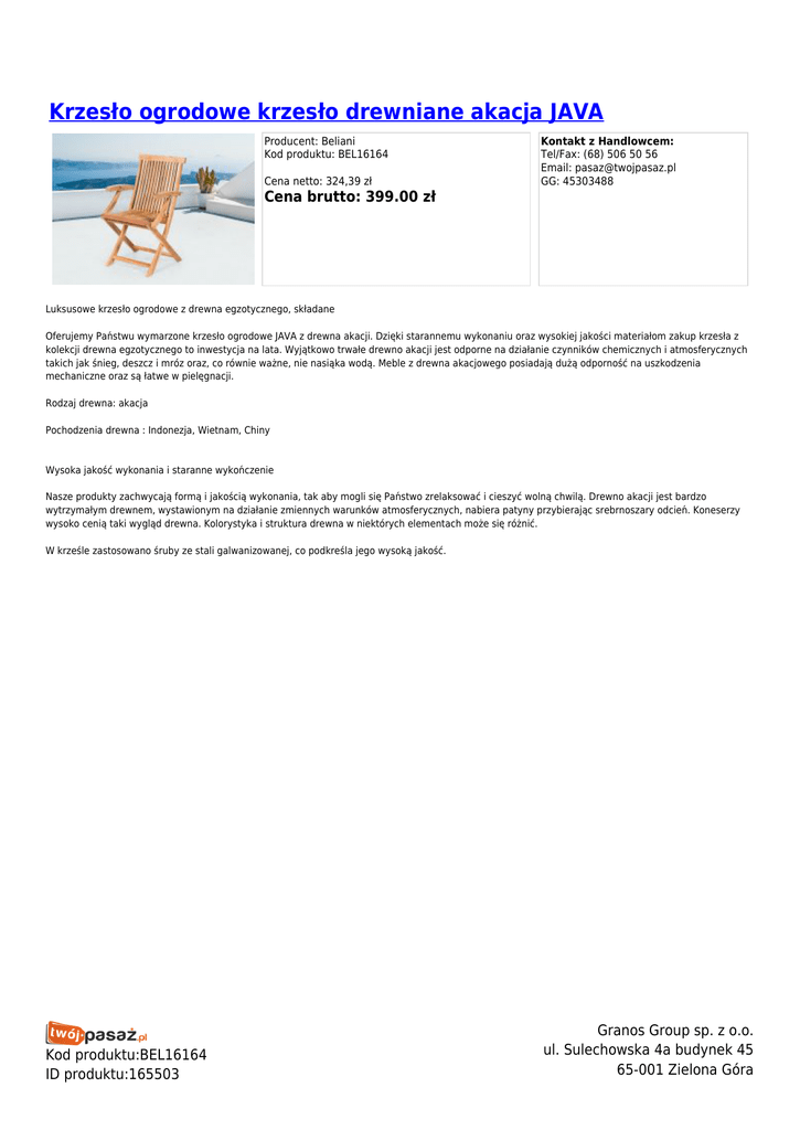 Krzesło ogrodowe krzesło drewniane akacja JAVA Producent: Beliani Kod produktu: BEL16164 Cena netto: 324,39 zł Kontakt z Handlowcem: Tel/Fax: (68) 506 50 56 Email: [email protected] GG: 45303488 Cena brutto: 399.00 zł Luksusowe krzesło ogrodowe z drewna egzotycznego, składane Oferujemy Państwu wymarzone krzesło ogrodowe JAVA z drewna akacji. Dzięki starannemu wykonaniu oraz wysokiej jakości materiałom zakup krzesła z kolekcji drewna egzotycznego to inwestycja na lata. Wyjątkowo trwałe drewno akacji jest odporne na działanie czynników chemicznych i atmosferycznych takich jak śnieg, deszcz i mróz oraz, co równie ważne, nie nasiąka wodą. Meble z drewna akacjowego posiadają dużą odporność na uszkodzenia mechaniczne oraz są łatwe w pielęgnacji. Rodzaj drewna: akacja Pochodzenia drewna : Indonezja, Wietnam, Chiny Wysoka jakość wykonania i staranne wykończenie Nasze produkty zachwycają formą i jakością wykonania, tak aby mogli się Państwo zrelaksować i cieszyć wolną chwilą. Drewno akacji jest bardzo wytrzymałym drewnem, wystawionym na działanie zmiennych warunków atmosferycznych, nabiera patyny przybierając srebrnoszary odcień. Koneserzy wysoko cenią taki wygląd drewna. Kolorystyka i struktura drewna w niektórych elementach może się różnić. W krześle zastosowano śruby ze stali galwanizowanej, co podkreśla jego wysoką jakość. Kod produktu:BEL16164 ID produktu:165503 Granos Group sp. z o.o. ul. Sulechowska 4a budynek 45 65-001 Zielona Góra