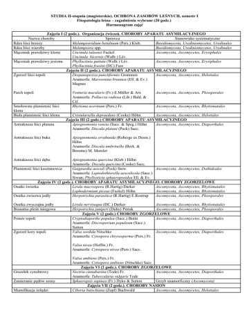 STUDIA II-stopnia (magisterskie). OCHRONA ZASOBÓW LEŚNYCH, semestr I Fitopatologia leśna – zagadnienia wybrane (20 godz.) Harmonogram zajęć Zajęcia I (2 godz.). Organizacja ćwiczeń. CHOROBY APARATU ASYMILACYJNEGO Nazwa choroby Sprawca Stanowisko systematyczne Rdza liści brzozy Melampsoridium betulinum (Pers.) Kleb. Basidiomycota, Urediniomycetes, Uredinales Rdza liści wierzby Melampsora spp. Basidiomycota, Urediniomycetes, Uredinales Mączniak prawdziwy klonu Uncinula tulasnei Fuckel Ascomycota, Ascomycetes, Erysiphales Uncinula bicornis (Wallr.) Lév. Mączniak prawdziwy jesionu Phyllactinia guttata (Wallr.) Lév. Ascomycota, Ascomycetes, Erysiphales Phyllactinia fraxini (DC) Fuss Zajęcia II (2 godz.). CHOROBY APARATU ASYMILACYJNEGO Zgorzel liści topoli Drepanopeziza punctiformis Gremmen Ascomycota, Ascomycetes, Helotiales Anamorfa: Marssonina brunnea (Ell. & Ev.) Magnus Parch topoli Smołowata plamistość liści klonu Biała plamistość liści klonu Antraknoza liści platana Antraknoza liści buka Venturia macularis (Fr.) E.Müller & Arx Anamorfa: Pollaccia radiosa (Lib.) Bald. & Cif. Rhytisma acerinum (Pers.) Fr. Ascomycota, Ascomycetes, Pleosporales Ascomycota, Ascomycetes, Rhytismatales Cristulariella depraedans (Cooke) Höhn. Ascomycota, Ascomycetes, Helotiales Zajęcia III (2 godz.) CHOROBY APARATU ASYMILACYJNEGO Apiognomonia veneta (Sacc. & Speg.) Höhn Ascomycota, Ascomycetes, Diaporthales Anamorfa: Discula platani (Peck) Sacc. Apiognomonia errabunda (Roberge ex Desm.) Höhn Anamorfa: Discula umbrinella (Berk. & Broome) M. Morelet Antraknoza liści dębu Apiognomonia quercina (Kleb.) Höhn Anamorfa: Discula quercina (Cooke) Sacc. Plamistość liści kasztanowca Guignardia aesculi (Peck) Stew. Ascomycota, Ascomycetes, Dothideales Anamorfa: Leptodothiorella aesculicola (Sacc.) Siwan; Phyllosticta sphaeropsoidea Ell. & Ev. Zajęcia IV (2 godz.). CHOROBY APARATU ASYMILACYJNEGO. CHOROBY ZGORZELOWE Osutki świerka Lirula macrospora (R.Hartig) Darker Ascomycota, Ascomycetes, Rhytismatales Lophodermium piceae (Fuckel) Höhn Ascomycota, Ascomycetes, Rhytismatales Osutka zwisowa jodły Herpotrichia parasitica (R.Hartig) E.Rostrup Ascomycota, Ascomycetes, Pleosporales Osutka zwyczajna jodły Brunatna pleśń śniegowa Pomór topoli Zgorzel kory topoli Lirula nervisequa (DC.) Darker Ascomycota, Ascomycetes, Rhytismatales Herpotrichia juniperi (Duby) Petrak Ascomycota, Ascomycetes, Pleosporales Zajęcia V (2 godz.) CHOROBY ZGORZELOWE Cryptodiaporthe populea (Sacc.) Butin Ascomycota, Ascomycetes, Diaporthales Anamorfa: Discosporium populeum (Sacc.) Sutton Valsa sordida Nitschke Ascomycota, Ascomycetes, Diaporthales Anamorfa: Cytospora chrysosperma (Pers.) Fr. Valsa nivea (Hoffm.) Fr. Anamorfa: Cytospora nivea (Pers.) Sacc. Gruzełek cynobrowy Zamieranie pędów sosny Mumifikacja żołędzi Valsa ambiens (Pers.) Fr. Anamorfa: Cytospora ambiens (Nitschke) Sacc. Zajęcia VI (2 godz.). CHOROBY ZGORZELOWE Nectria cinnabarina (Tode) Fr. Ascomycota, Ascomycetes, Diaporthales Anamorfa: Tubercularia vulgaris Tode Sphaeropsis sapinea (Fr.) Dyko & Sutton Grzyb anamorficzny (Ascomycota) Zajęcia VII (2 godz.). CHOROBY NASION Ciboria batschiana (Zopf) Buchwald Ascomycota, Ascomycetes, Helotiales Pleśnienie nasion Mucor spp. Różne grupy systematyczne Rhizopus spp. Verticillium spp. Botrytis cinerea Pers. Trichothecium roseum (Pers.) Link Penicillium spp. i inne Zajęcia VIII (2 godz.). MIKORYZY Cechy morfologiczne i anatomiczne mikoryz: ektomikoryza, ektendomikoryza Zajęcia IX (2 godz.). MIKORYZY Określanie stopnia zmikoryzowania siewek: samosiewka, siewka ze szkółki tradycyjnej, siewka ze szkółki kontenerowej, sztucznie mikoryzowana Zajęcia X (2 godz.). SPRAWDZIANY ZALICZENIOWE Sprawdzian teoretyczny i sprawdzian praktyczny z rozpoznawania chorób.