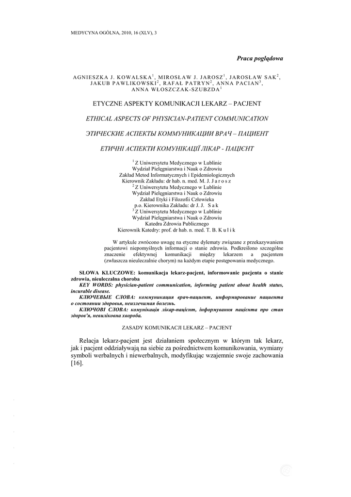 MEDYCYNA OGÓLNA, 2010, 16 (XLV), 3 Praca poglądowa AGNIESZ KA J. KOWALS KA1, MIR OSŁ AW J. JAR OSZ1, JAROSŁ AW S AK2, J A K U B P A W L I K O WS K I 2 , R AF A Ł P A T R Y N 2 , A N N A P AC I A N 3 , A N N A WŁ O S Z C Z A K - S Z U B Z D A 1 ETYCZNE ASPEKTY KOMUNIKACJI LEKARZ – PACJENT ETHICAL ASPECTS OF PHYSICIAN-PATIENT COMMUNICATION ЭТИЧЕСКИЕ АСПЕКТЫ КОММУНИКАЦИИ ВРАЧ – ПАЦИЕНТ ЕТИЧНІ АСПЕКТИ КОМУНІКАЦІЇ ЛІКАР - ПАЦІЄНТ 1 Z Uniwersytetu Medycznego w Lublinie Wydział Pielęgniarstwa i Nauk o Zdrowiu Zakład Metod Informatycznych i Epidemiologicznych Kierownik Zakładu: dr hab. n. med. M. J. J a r o s z 2 Z Uniwersytetu Medycznego w Lublinie Wydział Pielęgniarstwa i Nauk o Zdrowiu Zakład Etyki i Filozofii Człowieka p.o. Kierownika Zakładu: dr J. J. S a k 3 Z Uniwersytetu Medycznego w Lublinie Wydział Pielęgniarstwa i Nauk o Zdrowiu Katedra Zdrowia Publicznego Kierownik Katedry: prof. dr hab. n. med. T. B. K u l i k W artykule zwrócono uwagę na etyczne dylematy związane z przekazywaniem pacjentowi niepomyślnych informacji o stanie zdrowia. Podkreślono szczególne znaczenie efektywnej komunikacji między lekarzem a pacjentem (zwłaszcza nieuleczalnie chorym) na każdym etapie postępowania medycznego. SŁOWA KLUCZOWE: komunikacja lekarz-pacjent, informowanie pacjenta o stanie zdrowia, nieuleczalna choroba KEY WORDS: physician-patient communication, informing patient about health status, incurable disease. КЛЮЧЕВЫЕ СЛОВА: коммуникация врач-пациент, информирование пациента о состоянии здоровья, неизлечимая болезнь. КЛЮЧОВІ СЛОВА: комунікація лікар-пацієнт, інформування пацієнта про стан здоров'я, невиліковна хвороба. ZASADY KOMUNIKACJI LEKARZ – PACJENT - - - - - Relacja lekarz-pacjent jest działaniem społecznym w którym tak lekarz, jak i pacjent oddziaływają na siebie za pośrednictwem komunikowania, wymiany symboli werbalnych i niewerbalnych, modyfikując wzajemnie swoje zachowania [16]. 428 A. J. Kowalska, M. J. Jarosz, J. Sak, J. Pawlikowski … - - - - - Dla lekarza efektywne komunikowanie się z pacjentem ma fundamentalne znaczenie – od jakości komunikowania zależy bowiem, czy pacjent będzie w stanie w wystarczającym stopniu poinformować lekarza o swoich objawach chorobowych, czy zaakceptuje postawioną diagnozę i w związku z tym podejmie leczenie, czy wreszcie będzie realizował zalecenia lekarza [3]. Od umiejętności komunikacyjnych lekarza zależy trafna diagnostyka i skuteczne leczenie [3]. Komunikowanie się lekarza z pacjentem pełni trzy niezmiernie ważne funkcje: - informacyjno-diagnostyczną - jej podstawowym celem jest wzajemne porozumienie i zrozumienie, dzięki przekazywanej przez lekarza wiedzy o samej chorobie, jej etiologii, diagnostyce, leczeniu, rokowaniach, zapobieganiu oraz formułowanie zaleceń lekarskich. - perswazyjną – jej głównym celem jest wywarcie pozytywnego wpływu na reakcje chorego, jego zachowanie, a także kształtowanie prozdrowotnych postaw i sprowokowanie pacjenta do współdziałania w procesie leczenia. - terapeutyczną - jej zasadniczym celem jest zmiana stanu psychofizycznego pacjenta poprzez łagodzenie pobudzenia emocjonalnego, wsparcie w trudnych chwilach [3]. Aby proces komunikowania lekarza z pacjentem przebiegał właściwie, to znaczy by wypełnił powyższe funkcje, lekarz powinien stworzyć sprzyjającą atmosferę, która wzbudzi u pacjenta: - poczucie bezpieczeństwa; - zaufanie do lekarza oraz całego zespołu terapeutycznego; - poczucie intymności; - poczucie, że lekarz jest zainteresowany pacjentem i jego problemem; - poczucie, że lekarz pragnie rozwiązać problem medyczny pacjenta; - stan satysfakcji z kontaktu z lekarzem [1]. Według T.S. Szasz i M.H. Hollender istnieją trzy podstawowe typy interakcji lekarz-pacjent. 1. Pierwszy typ relacji lekarz - pacjent to aktywność - bierność. Zachodzi on przede wszystkim w ostrych stanach chorobowych przejawiając się uległością pacjenta w procesie diagnostycznym i leczniczym. 2. Drugi typ interakcji, kierowanie - współpraca, ma miejsce gdy pacjent jest w stanie współdziałać z personelem medycznym. Lekarz jest jednak w tej relacji wciąż osobą, która podejmuje autorytatywnie decyzje o metodach leczenia. 3. Trzeci typ interakcji lekarz - pacjent, współuczestnictwo, występuje głównie w przypadku chorób przewlekłych. Terapia oparta jest w tym przypadku na partnerstwie i współodpowiedzialności obu stron za proces leczenia [2]. Podkreślanie znaczenia partnerskiego typu relacji pomiędzy lekarzem, a pacjentem stanowi wyraz tendencji, które powodzenie lecznicze upatrują w aktywności i współdziałaniu chorego. Lekarz służy pomocą jako przewodnik Etyczne aspekty komunikacji lekarz – pacjent 429 po obcym pacjentowi świecie medycznym jest doradcą i profesjonalistą, który wspólnie z pacjentem analizuje metody leczenia i razem z nim ponosi odpowiedzialność za podjęte w procesie terapii decyzje [2]. Współcześnie zalecany model relacji lekarz-pacjent nosi następujące cechy: - centralnym punktem wzajemnych relacji jest pacjent; - kontakt lekarza z pacjentem opiera się na wzajemnym szacunku, zaufaniu i poszanowaniu autonomii; - lekarz jest nie tylko specjalistą, realizuje również funkcję edukacyjno doradczą; - naczelną zasadą działania jest troska o pacjenta; - pacjent jest aktywnym uczestnikiem procesu leczenia, wspólnie z lekarzem podejmuje decyzję i jest za nie odpowiedzialny; - lekarz potrafi i chce słuchać chorego oraz posiada umiejętności skutecznego komunikowania [6, 2]. ETYCZNE ASPEKTY PRZEKAZYWANIA NIEPOMYŚLNEJ DIAGNOZY - - - - - Praca z chorym człowiekiem wymaga od personelu medycznego szczególnych predyspozycji psychicznych o