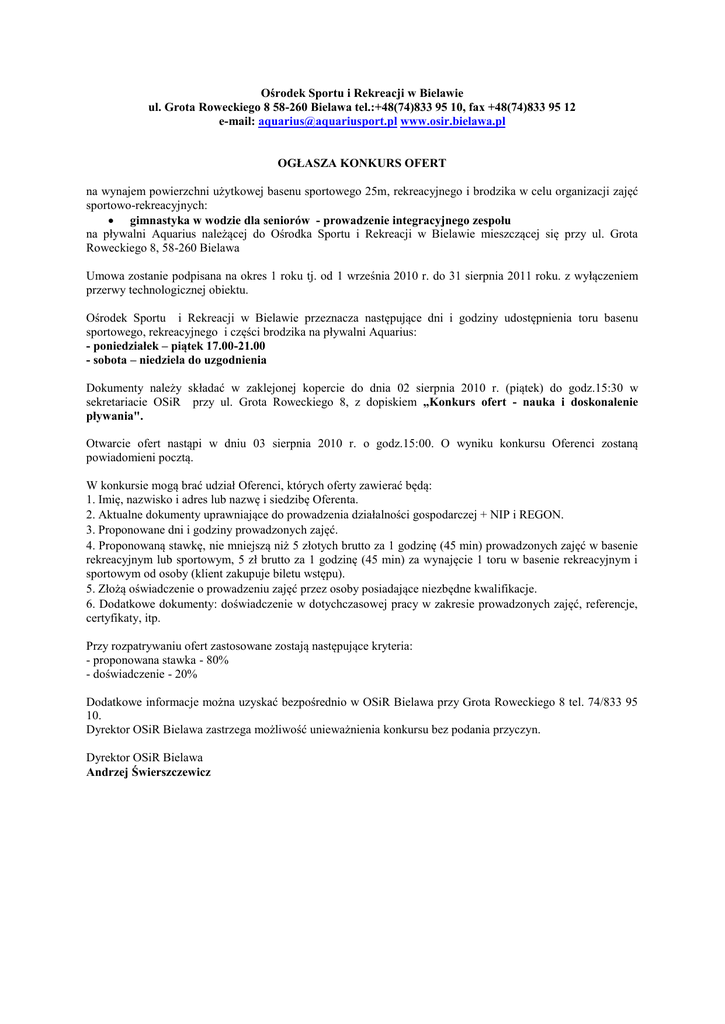 Ośrodek Sportu i Rekreacji w Bielawie ul. Grota Roweckiego 8 58-260 Bielawa tel.:+48(74)833 95 10, fax +48(74)833 95 12 e-mail: [email protected] www.osir.bielawa.pl OGŁASZA KONKURS OFERT na wynajem powierzchni użytkowej basenu sportowego 25m, rekreacyjnego i brodzika w celu organizacji zajęć sportowo-rekreacyjnych: gimnastyka w wodzie dla seniorów - prowadzenie integracyjnego zespołu na pływalni Aquarius należącej do Ośrodka Sportu i Rekreacji w Bielawie mieszczącej się przy ul. Grota Roweckiego 8, 58-260 Bielawa Umowa zostanie podpisana na okres 1 roku tj. od 1 września 2010 r. do 31 sierpnia 2011 roku. z wyłączeniem przerwy technologicznej obiektu. Ośrodek Sportu i Rekreacji w Bielawie przeznacza następujące dni i godziny udostępnienia toru basenu sportowego, rekreacyjnego i części brodzika na pływalni Aquarius: - poniedziałek – piątek 17.00-21.00 - sobota – niedziela do uzgodnienia Dokumenty należy składać w zaklejonej kopercie do dnia 02 sierpnia 2010 r. (piątek) do godz.15:30 w sekretariacie OSiR przy ul. Grota Roweckiego 8, z dopiskiem „Konkurs ofert - nauka i doskonalenie pływania". Otwarcie ofert nastąpi w dniu 03 sierpnia 2010 r. o godz.15:00. O wyniku konkursu Oferenci zostaną powiadomieni pocztą. W konkursie mogą brać udział Oferenci, których oferty zawierać będą: 1. Imię, nazwisko i adres lub nazwę i siedzibę Oferenta. 2. Aktualne dokumenty uprawniające do prowadzenia działalności gospodarczej + NIP i REGON. 3. Proponowane dni i godziny prowadzonych zajęć. 4. Proponowaną stawkę, nie mniejszą niż 5 złotych brutto za 1 godzinę (45 min) prowadzonych zajęć w basenie rekreacyjnym lub sportowym, 5 zł brutto za 1 godzinę (45 min) za wynajęcie 1 toru w basenie rekreacyjnym i sportowym od osoby (klient zakupuje biletu wstępu). 5. Złożą oświadczenie o prowadzeniu zajęć przez osoby posiadające niezbędne kwalifikacje. 6. Dodatkowe dokumenty: doświadczenie w dotychczasowej pracy w zakresie prowadzonych zajęć, referencje, certyfikaty, itp. Przy rozpatrywaniu ofert zastosowane zostają następujące kryteria: - proponowana stawka - 80% - doświadczenie - 20% Dodatkowe informacje można uzyskać bezpośrednio w OSiR Bielawa przy Grota Roweckiego 8 tel. 74/833 95 10. Dyrektor OSiR Bielawa zastrzega możliwość unieważnienia konkursu bez podania przyczyn. Dyrektor OSiR Bielawa Andrzej Świerszczewicz
