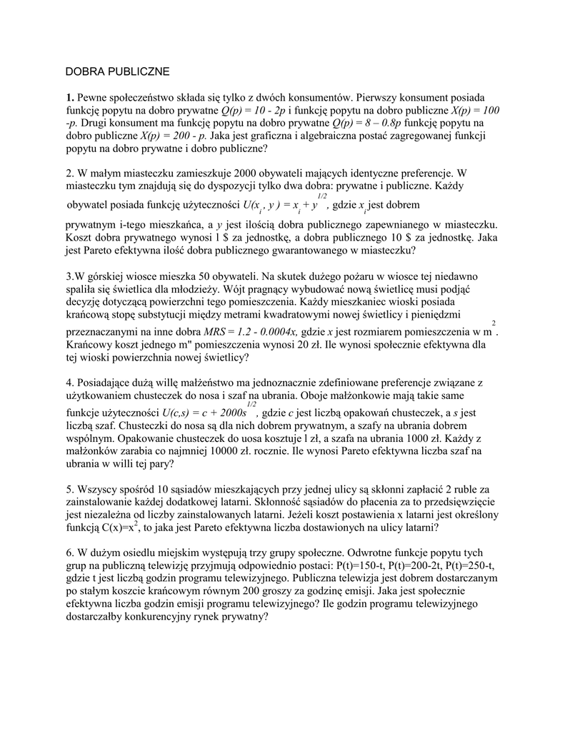 DOBRA PUBLICZNE 1. Pewne społeczeństwo składa się tylko z dwóch konsumentów. Pierwszy konsument posiada funkcję popytu na dobro prywatne Q(p) = 10 - 2p i funkcję popytu na dobro publiczne X(p) = 100 -p. Drugi konsument ma funkcję popytu na dobro prywatne Q(p) = 8 – 0.8p funkcję popytu na dobro publiczne X(p) = 200 - p. Jaka jest graficzna i algebraiczna postać zagregowanej funkcji popytu na dobro prywatne i dobro publiczne? 2. W małym miasteczku zamieszkuje 2000 obywateli mających identyczne preferencje. W miasteczku tym znajdują się do dyspozycji tylko dwa dobra: prywatne i publiczne. Każdy 1/2 obywatel posiada funkcję użyteczności U(x , y ) = x + y , gdzie x jest dobrem i i i prywatnym i-tego mieszkańca, a y jest ilością dobra publicznego zapewnianego w miasteczku. Koszt dobra prywatnego wynosi l $ za jednostkę, a dobra publicznego 10 $ za jednostkę. Jaka jest Pareto efektywna ilość dobra publicznego gwarantowanego w miasteczku? 3.W górskiej wiosce mieszka 50 obywateli. Na skutek dużego pożaru w wiosce tej niedawno spaliła się świetlica dla młodzieży. Wójt pragnący wybudować nową świetlicę musi podjąć decyzję dotyczącą powierzchni tego pomieszczenia. Każdy mieszkaniec wioski posiada krańcową stopę substytucji między metrami kwadratowymi nowej świetlicy i pieniędzmi 2 przeznaczanymi na inne dobra MRS = 1.2 - 0.0004x, gdzie x jest rozmiarem pomieszczenia w m . Krańcowy koszt jednego m" pomieszczenia wynosi 20 zł. Ile wynosi społecznie efektywna dla tej wioski powierzchnia nowej świetlicy? 4. Posiadające dużą willę małżeństwo ma jednoznacznie zdefiniowane preferencje związane z użytkowaniem chusteczek do nosa i szaf na ubrania. Oboje małżonkowie mają takie same 1/2 funkcje użyteczności U(c,s) = c + 2000s , gdzie c jest liczbą opakowań chusteczek, a s jest liczbą szaf. Chusteczki do nosa są dla nich dobrem prywatnym, a szafy na ubrania dobrem wspólnym. Opakowanie chusteczek do uosa kosztuje l zł, a szafa na ubrania 1000 zł. Każdy z małżonków zarabia co najmniej 10000 zł. rocznie. Ile wynosi Pareto efektywna liczba szaf na ubrania w willi tej pary? 5. Wszyscy spośród 10 sąsiadów mieszkających przy jednej ulicy są skłonni zapłacić 2 ruble za zainstalowanie każdej dodatkowej latarni. Skłonność sąsiadów do płacenia za to przedsięwzięcie jest niezależna od liczby zainstalowanych latarni. Jeżeli koszt postawienia x latarni jest określony funkcją C(x)=x2, to jaka jest Pareto efektywna liczba dostawionych na ulicy latarni? 6. W dużym osiedlu miejskim występują trzy grupy społeczne. Odwrotne funkcje popytu tych grup na publiczną telewizję przyjmują odpowiednio postaci: P(t)=150-t, P(t)=200-2t, P(t)=250-t, gdzie t jest liczbą godzin programu telewizyjnego. Publiczna telewizja jest dobrem dostarczanym po stałym koszcie krańcowym równym 200 groszy za godzinę emisji. Jaka jest społecznie efektywna liczba godzin emisji programu telewizyjnego? Ile godzin programu telewizyjnego dostarczałby konkurencyjny rynek prywatny? 7. Bezpieczeństwo publiczne jest, jak nazwa wskazuje, dobrem publicznym. Jednak stan bezpieczeństwa nie w pełni satysfakcjonuje wielu obywateli. Nowe osiedla mieszkaniowe są często strzeżone przez firmy ochroniarskie. Z punktu widzenia mieszkańców osiedla usługi świadczone przez firmę są dobrem publicznym. Populacja osiedla składa się z dwóch typów mieszkańców: młodych małżeństw i starych małżeństw. Te pierwsze są niezbyt bogate i nie mają wielu cennych rzeczy do stracenia. Ich funkcja odwrotna funkcja popytu na ochroniarzy jest dana zależnością P(x)=10-3x, gdzie x jest liczbą ochroniarzy. Natomiast odwrotna funkcją popytu ze strony starych małżeństw ma postać P (x)=20-x. Podaż ochroniarzy można przybliżyć wzorem P = 20+x. a) Zapisz funkcję zagregowanego popytu na ochroniarzy. Sporządź odpowiedni rysunek. b) Ilu ochroniarzy należy zatrudnić na tym osiedlu? 8.Tragedia wspólnego: Mieszkańcy wioski wypasają krowy na jednej wspólnej łące. Cena krowy wynosi 200. Ilość mleka produkowanego przez krowy zależy od tego, ile krów się wypasa na wspólnej łące. Funkcja produkcji mleka ( w litrach) wynosi M (C) = 300C-C2 , gdzie C ilość wypasanych krów na łące. Cena skupu mleka wynosi 1 za litr, bez względu na ilość dostarczanego mleka. Ile wynosi optymalna z punktu widzenia mieszkańców wioski liczba wypasanych krów (maksymalizująca wspólne zyski)? Ile krów będzie wypasanych na wspólnej łące, jeśli każdy rolnik nie ma wpływu na to ile wypasają inni i nie ma żadnych odgórnych regulacji co do liczby wypasanych krów? Jaka jest różnica pomiędzy wspólnymi zyskami w tej sytuacji i w sytuacji optymalnej dla mieszkańców wioski? 9. Gospodarka składa się z 2 konsumentów o funkcjach użyteczności U1(x1,G) = 2x1+G i u2(x2,G) = x2 G (dobro x jest prywatne, zaś G - publiczne). Obydwa dobra są dostarczane po cenach równych 1 (innymi słowy w funkcjach użyteczności dobro publiczne występuje wyrażone w jednostkach dobra prywatnego). Gospodarka dysponuje w sumie zasobem dobra prywatnego w wysokości 8000. Dlaczego alokacja x1=5000, x2=1500, G=1500 nie jest optimum Pareto? 10. W gospodarce składającej się z 2 konsumentów, jednego dobra prywatnego o zasobach początkowych 1 = 2 = 600 oraz dobra publicznego, którego dostarczenie kosztuje c1 = c2 = 250, korzyści z tego dobra konsumenci szacują na v1 = v2 =300 (tj. n1 = n2 = 50). Proszę skonstruować podatek GCT. 11. Zaprojektowano aukcję wymagającą dostarczenia ofert w zamkniętych kopertach (sealed bid auction). Nabywcą jest ten, kto zaoferował najwyższą kwotę, ale nabywa po cenie równej drugiej (co do wysokości) ofercie. Uzasadnić, że przy takim mechanizmie oferenci nie mają motywacji, aby oferować kwotę różną od wartości licytowanego dobra. Uzasadnić też, że przy analogicznym mechanizmie ale z zasadą, iż nabywca płaci cenę