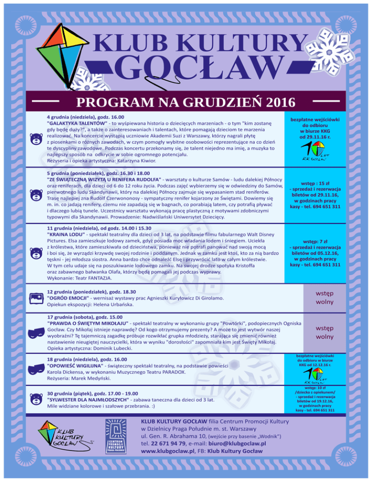 KLUB KULTURY GOCŁAW PROGRAM NA GRUDZIEŃ 2016 4 grudnia (niedziela), godz. 16.00 "GALAKTYKA TALENTÓW" - to wyśpiewana historia o dziecięcych marzeniach - o tym "kim zostanę gdy będę duży?", a także o zainteresowaniach i talentach, które pomagają dzieciom te marzenia realizować. Na koncercie wystąpią uczniowie Akademii Suzi z Warszawy, którzy nagrali płytę z piosenkami o różnych zawodach, w czym pomogły wybitne osobowości reprezentujące na co dzień te dyscypliny zawodowe. Podczas koncertu przekonamy się, że talent niejedno ma imię, a muzyka to najlepszy sposób na odkrycie w sobie ogromnego potencjału. Reżyseria i opieka artystyczna: Katarzyna Kiwior. bezpłatne wejściówki do odbioru w biurze KKG od 29.11.16 r. 5 grudnia (poniedziałek), godz. 16.30 i 18.00 "ZE ŚWIĄTECZNĄ WIZYTĄ U RENIFERA RUDOLFA" - warsztaty o kulturze Samów - ludu dalekiej Północy oraz reniferach, dla dzieci od 6 do 12 roku życia. Podczas zajęć wybierzemy się w odwiedziny do Samów, pierwotnego ludu Skandynawii, który na dalekiej Północy zajmuje się wypasaniem stad reniferów. Trasę najlepiej zna Rudolf Czerwononosy - sympatyczny renifer kojarzony ze Świętami. Dowiemy się m. in. co jadają renifery, czemu nie zapadają się w bagnach, co porabiają latem, czy potrafią pływać i dlaczego lubią tunele. Uczestnicy warsztatu wykonają pracę plastyczną z motywami zdobniczymi typowymi dla Skandynawii. Prowadzenie: Nadwiślański Uniwersytet Dziecięcy. wstęp : 15 zł - sprzedaż i rezerwacja biletów od 29.11.16, w godzinach pracy kasy - tel. 694 651 311 11 grudnia (niedziela), od godz. 14.00 i 15.30 "KRAINA LODU" - spektakl teatralny dla dzieci od 3 lat, na podstawie filmu fabularnego Walt Disney Pictures. Elsa zamieszkuje lodowy zamek, gdyż posiada moc władania lodem i śniegiem. Uciekła z królestwa, które zamieszkiwała od dzieciństwa, ponieważ nie potrafi panować nad swoją mocą i boi się, że wyrządzi krzywdę swojej rodzinie i poddanym. Jednak w zamku jest ktoś, kto za nią bardzo tęskni - jej młodsza siostra. Anna bardzo chce odnaleźć Elsę i przywrócić lato w całym królestwie. W tym celu udaje się na poszukiwanie lodowego zamku. Na swojej drodze spotyka Kristoffa oraz zabawnego bałwanka Olafa, którzy będą pomagali jej podczas wyprawy. Wykonanie: Teatr FANTAZJA. wstęp: 7 zł - sprzedaż i rezerwacja biletów od 05.12.16, w godzinach pracy kasy - tel. 694 651 311 12 grudnia (poniedziałek), godz. 18.30 "OGRÓD EMOCJI" - wernisaż wystawy prac Agnieszki Kuryłowicz Di Girolamo. Opiekun ekspozycji: Helena Urbańska. 17 grudnia (sobota), godz. 15.00 "PRAWDA O ŚWIĘTYM MIKOŁAJU" - spektakl teatralny w wykonaniu grupy "Powtórki", podopiecznych Ogniska Gocław. Czy Mikołaj istnieje naprawdę? Od kogo otrzymujemy prezenty? A może to jest wytwór naszej wyobraźni? Tę tajemniczą zagadkę próbuje rozwikłać grupka młodzieży, starająca się zmienić również nastawienie nieugiętej nauczycielki, która w wyniku "dorosłości" zapomniała kim jest Święty Mikołaj. Opieka artystyczna: Dominik Lubecki. 18 grudnia (niedziela), godz. 16.00 "OPOWIEŚĆ WIGILIJNA" - świąteczny spektakl teatralny, na podstawie powieści Karola Dickensa, w wykonaniu Muzycznego Teatru PARADOX. Reżyseria: Marek Medyński. 30 grudnia (piątek), godz. 17.00 - 19.00 "SYLWESTER DLA NAJMŁODSZYCH" - zabawa taneczna dla dzieci od 3 lat. Mile widziane kolorowe i szałowe przebrania. :) KLUB KULTURY GOCŁAW filia Centrum Promocji Kultury w Dzielnicy Praga Południe m. st. Warszawy ul. Gen. R. Abrahama 10, (wejście przy basenie „Wodnik”) tel. 22 671 94 79, e-mail: [email protected] www.klubgoclaw.pl, FB: Klub Kultury Gocław bezpłatne wejściówki do odbioru w biurze KKG od 12.12.16 r. wstęp: 10 zł /dziecko z opiekunem/ - sprzedaż i rezerwacja biletów od 19.12.16, w godzinach pracy kasy - tel. 694 651 311