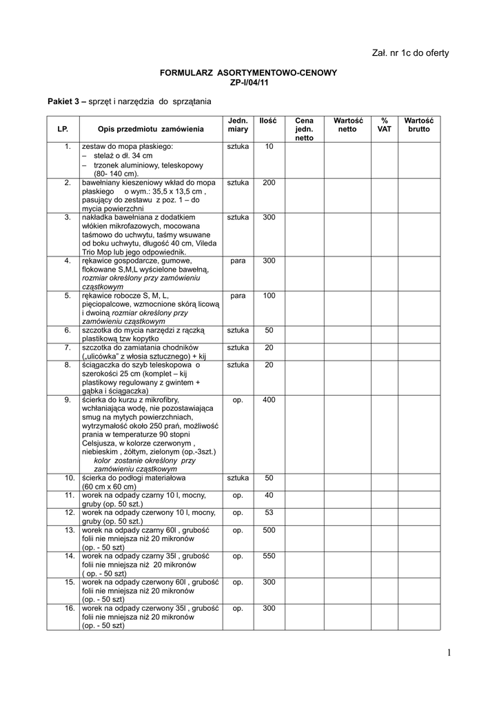Zał. nr 1c do oferty FORMULARZ ASORTYMENTOWO-CENOWY ZP-I/04/11 Pakiet 3 – sprzęt i narzędzia do sprzątania LP. 1. 2. 3. 4. 5. 6. 7. 8. 9. 10. 11. 12. 13. 14. 15. 16. Opis przedmiotu zamówienia zestaw do mopa płaskiego: – stelaż o dł. 34 cm – trzonek aluminiowy, teleskopowy (80- 140 cm). bawełniany kieszeniowy wkład do mopa płaskiego o wym.: 35,5 x 13,5 cm , pasujący do zestawu z poz. 1 – do mycia powierzchni nakładka bawełniana z dodatkiem włókien mikrofazowych, mocowana taśmowo do uchwytu, taśmy wsuwane od boku uchwytu, długość 40 cm, Vileda Trio Mop lub jego odpowiednik. rękawice gospodarcze, gumowe, flokowane S,M,L wyścielone bawełną, rozmiar określony przy zamówieniu cząstkowym rękawice robocze S, M, L, pięciopalcowe, wzmocnione skórą licową i dwoiną rozmiar określony przy zamówieniu cząstkowym szczotka do mycia narzędzi z rączką plastikową tzw kopytko szczotka do zamiatania chodników („ulicówka” z włosia sztucznego) + kij ściągaczka do szyb teleskopowa o szerokości 25 cm (komplet – kij plastikowy regulowany z gwintem + gąbka i ściągaczka) ścierka do kurzu z mikrofibry, wchłaniająca wodę, nie pozostawiająca smug na mytych powierzchniach, wytrzymałość około 250 prań, możliwość prania w temperaturze 90 stopni Celsjusza, w kolorze czerwonym , niebieskim , żółtym, zielonym (op.-3szt.) kolor zostanie określony przy zamówieniu cząstkowym ścierka do podłogi materiałowa (60 cm x 60 cm) worek na odpady czarny 10 l, mocny, gruby (op. 50 szt.) worek na odpady czerwony 10 l, mocny, gruby (op. 50 szt.) worek na odpady czarny 60l , grubość folii nie mniejsza niż 20 mikronów (op. - 50 szt) worek na odpady czarny 35l , grubość folii nie mniejsza niż 20 mikronów ( op. - 50 szt) worek na odpady czerwony 60l , grubość folii nie mniejsza niż 20 mikronów (op. - 50 szt) worek na odpady czerwony 35l , grubość folii nie mniejsza niż 20 mikronów (op. - 50 szt) Jedn. miary Ilość sztuka 10 sztuka 200 sztuka 300 para 300 para 100 sztuka 50 sztuka 20 sztuka 20 op. 400 sztuka 50 op. 40 op. 53 op. 500 op. 550 op. 300 op. 300 Cena jedn. netto Wartość netto % VAT Wartość brutto 1 17. worek na odpady czarny , 120l , grubość folii nie mniejsza niż 20 mikronów (op.- 25 szt) 18. worek na odpady żółty , 60l , grubość folii nie mniejsza niż 20 mikronów (op. - 50 szt) 19. worek na odpady niebieski 60l , grubość nie mniejsza niż 20 mikronów (op. - 50 szt) 20. worek na odpady biały 120l , grubość folii nie mniejsza niż 20 mikronów (op. - 25 szt) 21. zmywak z gąbką z jedną stroną szorstką (op.- 10 szt.) 22. miotła brzozowa 23. wiadro plastikowe, prostokątne z przykrywką 10 l 24. wiadro plastikowe, okrągłe bez przykrywki 10 l 25. wiadro plastikowe pedałowe białe 20 l 26. szczotka do mycia rąk – jednostronna 27. szczotka do WC z pojemnikiem na szczotkę 28. szczotka do zamiatania z włókna mieszanego, oprawa plastikowa o dł. 40cm + kij z gwintem 29. wycieraczka antypoślizgowa z obwódką gumową w środku materiał, na gumie 150 cm x 90 cm 30. wycieraczka 120 cm x 80 cm z włosia 31. łopata do śniegu – kij nie krótszy niż 140 cm + dykta z zakończeniem metalowym 32. łopata do śniegu – kij nie krótszy niż 140 cm + szufla plastikowa z zakończeniem metalowym op. 150 op. 40 op. 10 op. 60 op. 100 sztuka sztuka 55 30 sztuka 15 sztuka sztuka sztuka 110 15 50 sztuka 40 sztuka 24 sztuka sztuka 24 15 sztuka 15 Razem: .........................., dnia..................... ......................................................... /podpis i pieczęć imienna Wykonawcy lub osoby upoważnionej do jego reprezentowania/ 2