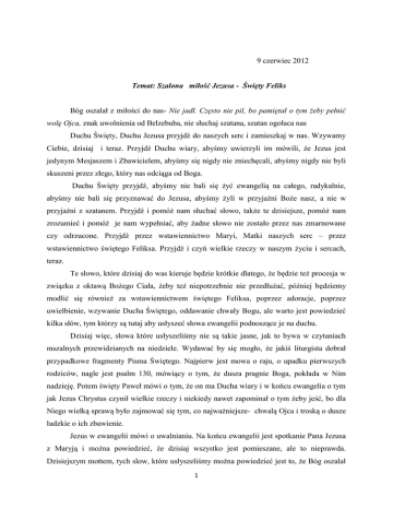 9 czerwiec 2012 Temat: Szalona miłość Jezusa - Święty Feliks Bóg oszalał z miłości do nas- Nie jadł. Często nie pil, bo pamiętał o tym żeby pełnić wolę Ojca, znak uwolnienia od Belzebuba, nie słuchaj szatana, szatan ogołaca nas Duchu Święty, Duchu Jezusa przyjdź do naszych serc i zamieszkaj w nas. Wzywamy Ciebie, dzisiaj i teraz. Przyjdź Duchu wiary, abyśmy uwierzyli im mówili, że Jezus jest jedynym Mesjaszem i Zbawicielem, abyśmy się nigdy nie zniechęcali, abyśmy nigdy nie byli skuszeni przez złego, który nas odciąga od Boga. Duchu Święty przyjdź, abyśmy nie bali się żyć ewangelią na całego, radykalnie, abyśmy nie bali się przyznawać do Jezusa, abyśmy żyli w przyjaźni Boże nasz, a nie w przyjaźni z szatanem. Przyjdź i pomóż nam słuchać słowo, także te dzisiejsze, pomóż nam zrozumieć i pomóż je nam wypełniać, aby żadne słowo nie zostało przez nas zmarnowane czy odrzucone. Przyjdź przez wstawiennictwo Maryi, Matki naszych serc – przez wstawiennictwo świętego Feliksa. Przyjdź i czyń wielkie rzeczy w naszym życiu i sercach, teraz. Te słowo, które dzisiaj do was kieruje będzie krótkie dlatego, że będzie też procesja w związku z oktawą Bożego Ciała, żeby też niepotrzebnie nie przedłużać, później będziemy modlić się również za wstawiennictwem świętego Feliksa, poprzez adoracje, poprzez uwielbienie, wzywanie Ducha Świętego, oddawanie chwały Bogu, ale warto jest powiedzieć kilka słów, tym którzy są tutaj aby usłyszeć słowa ewangelii podnoszące je na duchu. Dzisiaj więc, słowa które usłyszeliśmy nie są takie jasne, jak to bywa w czytaniach mszalnych przewidzianych na niedziele. Wydawać by się mogło, że jakiś liturgista dobrał przypadkowe fragmenty Pisma Świętego. Najpierw jest mowa o raju, o upadku pierwszych rodziców, nagle jest psalm 130, mówiący o tym, że dusza pragnie Boga, pokłada w Nim nadzieję. Potem święty Paweł mówi o tym, że on ma Ducha wiary i w końcu ewangelia o tym jak Jezus Chrystus czynił wielkie rzeczy i niekiedy nawet zapominał o tym żeby jeść, bo dla Niego wielką sprawą było zajmować się tym, co najważniejsze- chwalą Ojca i troską o dusze ludzkie o ich zbawienie. Jezus w ewangelii mówi o uwalnianiu. Na końcu ewangelii jest spotkanie Pana Jezusa z Maryją i można powiedzieć, że dzisiaj wszystko jest pomieszane, ale to nieprawda. Dzisiejszym mottem, tych slow, które usłyszeliśmy można powiedzieć jest to, że Bóg oszalał 1 z miłości do nas. Czasami słyszymy takie słowa i może niektórym się nie podoba, że one są mówione w kontekście Boga, ale tak jest. Pan Jezus z miłości do nas oszalał i na każdym kroku widać było to szaleństwo, tą przesadę. Nie jadł. Często nie pil, bo pamiętał o tym żeby pełnić wolę Ojca i pamiętał żeby przyjść do ludzi najbardziej zapomnianych, odrzuconych, kalekich, umarłych. Taką miał żarliwość o tych ludzi, że zapominał nawet o swoim ciele, a pamiętał o ich ciele i o ich duszach. Niektórzy tego nie rozmieli, uważali, że Pan Jezus właśnie oszalał, że za dużo wziął na siebie i teraz skończy się to jakąś chorobą psychiczną. Gdyby w tamtych czasach byli psychologowie to może by już Panu Jezusowi dali jakieś zaświadczenie, że z Nim jest naprawdę bardzo źle. Może jakieś lekarstwa by Mu przepisali. Ale z Panem Jezusem było wszystko dobrze. Pan Jezus pokazuje nam, że Jego miłość jest tak wielka i tak piękna i tak gorąca, że On również robi te spotkanie dla ciebie żebyś doświadczył tego szaleństwa jakiego doświadczali ludzie tamtych czasów, czasów Pana Jezusa. I to co się usłyszysz w tym kościele to nie będzie nic szczególnego, nic nowego, bo znamy to od dzieciństwa, ale chodzi o to żebyśmy dzięki temu spotkaniu i tym słowom, które usłyszymy poznali prawdziwego Jezusa, bo problem jest taki, że my chrześcijanie nie mamy w sobie mocy Jezusa, że nie spotkaliśmy Jezusa, więc te spotkanie dosięgnie cel, kiedy spotkasz na nim dzisiaj Jezusa. Kiedy Go doświadczysz. Kiedy przyjmiesz Jego szaloną miłość. Kiedy pozwolisz żeby Pan Jezus jak kiedyś uwalniał ciebie od złych duchów, które chcą ciebie na wszelki sposób ciebie od Boga oddalić. Jezus dzisiaj w tej ewangelii czynił wielki znak uwolnienia od Belzebuba, od szatana. A co faryzeusze widząc to mówili? Że jest po prostu opętany. Nie widzieli w tym dobrodziejstwa, miłości i miłosierdzia Boga, tylko wdzieli w tym opętanie. Jakie ciężkie to było bluźnierstwo i Pan Jezus powiedział im: Bluźnicie i to jest gorsze bluźnierstwo niż gdyście powiedzieli coś złego przeciwko Mnie. Bluźnicie teraz Duchowi Świętemu, bo mówić komuś kto czyni dobrze w imię Boga, że jest opętany, że czyni to mocą szatana. No to większego bluźnierstwa nie ma, to zamyka sobie drogę do zbawienia, do odrzuca miłość Boga i niestety wchodzi w co? W ręce szatana, przed którym się niby broni. Jedyny wyzwoliciel od złego to Jezus. Nie ma innego. Zobaczcie jakie była zatwardziałość tych ludzi. I dzisiaj, my jesteśmy na tym spotkaniu aby doświadczyć miłości Jezus, która uwalnia, bo niestety przez tą ewangelię Pan Jezus nam przypomina, ciągle jesteśmy w jakikolwiek sposób i na różnym poziomie zniewalani, osaczani, dręczeni, kuszeni. Jezus musi nas nieustannie wyzwalać. Jezus przychodzi do nas, aby czynić nas wolnymi, a wolni są ci, którzy należą do Jezusa, którzy są uczniami Jezusa. Oni są wolnymi albo będą uwolnieni. 2 Jeszcze, powoli kończąc tą krótka homilie, pamiętajmy nie wolno nam słuchać szatana tak jak to zrobiła Ewa, tak jak to zrobił Adam. Od razu posłuchali Złego. Nie można żadnej dyskusji prowadzić ze złym, tylko z Bogiem się rozmawia. Tylko Boga się słucha. Szatan jest zwodzicielem i kłamcą. On każdego dnia będzie kusi nas do złego, ale niech zawsze w sercu plonie lampka wiary i miłości 
