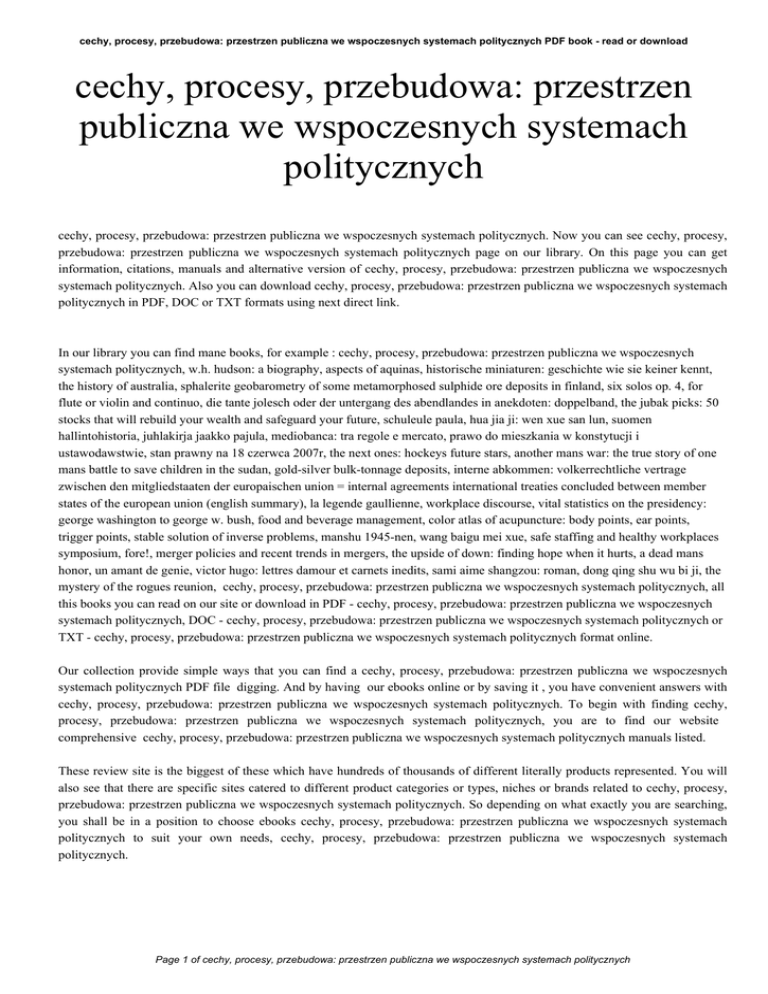 cechy, procesy, przebudowa: przestrzen publiczna we wspoczesnych systemach politycznych PDF book - read or download cechy, procesy, przebudowa: przestrzen publiczna we wspoczesnych systemach politycznych cechy, procesy, przebudowa: przestrzen publiczna we wspoczesnych systemach politycznych. Now you can see cechy, procesy, przebudowa: przestrzen publiczna we wspoczesnych systemach politycznych page on our library. On this page you can get information, citations, manuals and alternative version of cechy, procesy, przebudowa: przestrzen publiczna we wspoczesnych systemach politycznych. Also you can download cechy, procesy, przebudowa: przestrzen publiczna we wspoczesnych systemach politycznych in PDF, DOC or TXT formats using next direct link. In our library you can find mane books, for example : cechy, procesy, przebudowa: przestrzen publiczna we wspoczesnych systemach politycznych, w.h. hudson: a biography, aspects of aquinas, historische miniaturen: geschichte wie sie keiner kennt, the history of australia, sphalerite geobarometry of some metamorphosed sulphide ore deposits in finland, six solos op. 4, for flute or violin and continuo, die tante jolesch oder der untergang des abendlandes in anekdoten: doppelband, the jubak picks: 50 stocks that will rebuild your wealth and safeguard your future, schuleule paula, hua jia ji: wen xue san lun, suomen hallintohistoria, juhlakirja jaakko pajula, mediobanca: tra regole e mercato, prawo do mieszkania w konstytucji i ustawodawstwie, stan prawny na 18 czerwca 2007r, the next ones: hockeys future stars, another mans war: the true story of one mans battle to save children in the sudan, gold-silver bulk-tonnage deposits, interne abkommen: volkerrechtliche vertrage zwischen den mitgliedstaaten der europaischen union = internal agreements international treaties concluded between member states of the european union (english summary), la legende gaullienne, workplace discourse, vital statistics on the presidency: george washington to george w. bush, food and beverage management, color atlas of acupuncture: body points, ear points, trigger points, stable solution of inverse problems, manshu 1945-nen, wang baigu mei xue, safe staffing and healthy workplaces symposium, fore!, merger policies and recent trends in mergers, the upside of down: finding hope when it hurts, a dead mans honor, un amant de genie, victor hugo: lettres damour et carnets inedits, sami aime shangzou: roman, dong qing shu wu bi ji, the mystery of the rogues reunion, cechy, procesy, przebudowa: przestrzen publiczna we wspoczesnych systemach politycznych, all this books you can read on our site or download in PDF - cechy, procesy, przebudowa: przestrzen publiczna we wspoczesnych systemach politycznych, DOC - cechy, procesy, przebudowa: przestrzen publiczna we wspoczesnych systemach politycznych or TXT - cechy, procesy, przebudowa: przestrzen publiczna we wspoczesnych systemach politycznych format online. Our collection provide simple ways that you can find a cechy, procesy, przebudowa: przestrzen publiczna we wspoczesnych systemach politycznych PDF file digging. And by having our ebooks online or by saving it , you have convenient answers with cechy, procesy, przebudowa: przestrzen publiczna we wspoczesnych systemach politycznych. To begin with finding cechy, procesy, przebudowa: przestrzen publiczna we wspoczesnych systemach politycznych, you are to find our website comprehensive cechy, procesy, przebudowa: przestrzen publiczna we wspoczesnych systemach politycznych manuals listed. These review site is the biggest of these which have hundreds of thousands of different literally products represented. You will also see that there are specific sites catered to different product categories or types, niches or brands related to cechy, procesy, przebudowa: przestrzen publiczna we wspoczesnych systemach politycznych. So depending on what exactly you are searching, you shall be in a position to choose ebooks cechy, procesy, przebudowa: przestrzen publiczna we wspoczesnych systemach politycznych to suit your own needs, cechy, procesy, przebudowa: przestrzen publiczna we wspoczesnych systemach politycznych. Page 1 of cechy, procesy, przebudowa: przestrzen publiczna we wspoczesnych systemach politycznych