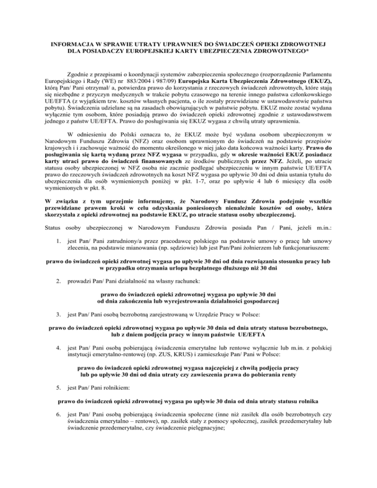 INFORMACJA W SPRAWIE UTRATY UPRAWNIEŃ DO ŚWIADCZEŃ OPIEKI ZDROWOTNEJ DLA POSIADACZY EUROPEJSKIEJ KARTY UBEZPIECZENIA ZDROWOTNEGO* Zgodnie z przepisami o koordynacji systemów zabezpieczenia społecznego (rozporządzenie Parlamentu Europejskiego i Rady (WE) nr 883/2004 i 987/09) Europejska Karta Ubezpieczenia Zdrowotnego (EKUZ), którą Pan/ Pani otrzymał/ a, potwierdza prawo do korzystania z rzeczowych świadczeń zdrowotnych, które stają się niezbędne z przyczyn medycznych w trakcie pobytu czasowego na terenie innego państwa członkowskiego UE/EFTA (z wyjątkiem tzw. kosztów własnych pacjenta, o ile zostały przewidziane w ustawodawstwie państwa pobytu). Świadczenia udzielane są na zasadach obowiązujących w państwie pobytu. EKUZ może zostać wydana wyłącznie tym osobom, które posiadają prawo do świadczeń opieki zdrowotnej zgodnie z ustawodawstwem jednego z państw UE/EFTA. Prawo do posługiwania się EKUZ wygasa z chwilą utraty uprawnienia. W odniesieniu do Polski oznacza to, że EKUZ może być wydana osobom ubezpieczonym w Narodowym Funduszu Zdrowia (NFZ) oraz osobom uprawnionym do świadczeń na podstawie przepisów krajowych i i zachowuje ważność do momentu określonego w niej jako data końcowa ważności karty. Prawo do posługiwania się kartą wydaną przez NFZ wygasa w przypadku, gdy w okresie ważności EKUZ posiadacz karty utraci prawo do świadczeń finansowanych ze środków publicznych przez NFZ. Jeżeli, po utracie statusu osoby ubezpieczonej w NFZ osoba nie zacznie podlegać ubezpieczeniu w innym państwie UE/EFTA prawo do rzeczowych świadczeń zdrowotnych na koszt NFZ wygasa po upływie 30 dni od dnia ustania tytułu do ubezpieczenia dla osób wymienionych poniżej w pkt. 1-7, oraz po upływie 4 lub 6 miesięcy dla osób wymienionych w pkt. 8. W związku z tym uprzejmie informujemy, że Narodowy Fundusz Zdrowia podejmie wszelkie przewidziane prawem kroki w celu odzyskania poniesionych nienależnie kosztów od osoby, która skorzystała z opieki zdrowotnej na podstawie EKUZ, po utracie statusu osoby ubezpieczonej. Status osoby ubezpieczonej w Narodowym Funduszu Zdrowia posiada Pan / Pani, jeżeli m.in.: 1. jest Pan/ Pani zatrudniony/a przez pracodawcę polskiego na podstawie umowy o pracę lub umowy zlecenia, na podstawie mianowania (np. sędziowie) lub jest Pan/Pani żołnierzem lub funkcjonariuszem: prawo do świadczeń opieki zdrowotnej wygasa po upływie 30 dni od dnia rozwiązania stosunku pracy lub w przypadku otrzymania urlopu bezpłatnego dłuższego niż 30 dni 2. prowadzi Pan/ Pani działalność na własny rachunek: prawo do świadczeń opieki zdrowotnej wygasa po upływie 30 dni od dnia zakończenia lub wyrejestrowania działalności gospodarczej 3. jest Pan/ Pani osobą bezrobotną zarejestrowaną w Urzędzie Pracy w Polsce: prawo do świadczeń opieki zdrowotnej wygasa po upływie 30 dnia od dnia utraty statusu bezrobotnego, lub z dniem podjęcia pracy w innym państwie UE/EFTA 4. jest Pan/ Pani osobą pobierającą świadczenia emerytalne lub rentowe wyłącznie lub m.in. z polskiej instytucji emerytalno-rentowej (np. ZUS, KRUS) i zamieszkuje Pan/ Pani w Polsce: prawo do świadczeń opieki zdrowotnej wygasa najczęściej z chwilą podjęcia pracy lub po upływie 30 dni od dnia utraty czy zawieszenia prawa do pobierania renty 5. jest Pan/ Pani rolnikiem: prawo do świadczeń opieki zdrowotnej wygasa po upływie 30 dnia od dnia utraty statusu rolnika 6. jest Pan/ Pani osobą pobierającą świadczenia społeczne (inne niż zasiłek dla osób bezrobotnych czy świadczenia emerytalno – rentowe), np. zasiłek stały z pomocy społecznej, zasiłek przedemerytalny lub świadczenie przedemerytalne, czy świadczenie pielęgnacyjne; prawo do świadczeń opieki zdrowotnej wygasa po upływie 30 dni od dnia utraty prawa do tego świadczenia 7. zawarł Pan/ Pani umowę o dobrowolne ubezpieczenie zdrowotne w NFZ: prawo do świadczeń opieki zdrowotnej wygasa po upływie 30 dni od dnia rozwiązania umowy dobrowolnego ubezpieczenia 8. jest Pan/ Pani osobą uczącą się (szkoła średnia lub wyższa): prawo do świadczeń opieki zdrowotnej osób, które ukończyły szkołę ponadgimnazjalną z tytułu zgłoszenia jako członek rodziny wygasa po upływie 6 miesięcy od dnia zakończenia nauki lub skreślenia z listy uczniów. prawo do świadczeń opieki zdrowotnej studentów z tytułu zgłoszenia jako członek rodziny wygasa po upływie 4 miesięcy od ukończenia studiów lub studiów doktoranckich albo skreślenia z listy studentów lub uczestników studiów doktoranckich oraz z chwilą ukończenia 26 r.ż Ponadto, osobami ubezpieczonymi w NFZ są członkowie rodziny zgłoszeni do ubezpieczenia zdrowotnego przez wyżej wymienione osoby. Co do zasady, członkowie rodziny posiadają prawo do świadczeń w tym samym okresie, w jakim prawo to przysługuje osobom, które ich zgłosiły. Gdy wyjazd do innego państwa UE/EFTA ma cel zarobkowy Jeżeli Pana/ Pani wyjazd do innego państwa UE/EFTA ma na celu znalezienie tam i podjęcie pracy zarobkowej lub otworzenie w tym państwie samodzielnej działalności gospodarczej, a nie posiada Pan/i dokumentu A1 zaświadczającego, że podczas pracy za granicą zastosowanie ma polskie ustawodawstwo w zakresie ubezpieczenia zdrowotnego, od momentu podjęcia pracy lub działalności podlega Pan/ Pani ubezpieczeniom społecznym i zdrowotnemu tego państwa UE/EFTA, na terytorium, którego praca lub działalność jest wykonywana. Tak więc, od momentu podjęcia pracy lub działalności w innym państwie UE/EFTA przestaje Pan/ Pani podlegać ubezpieczeniu zdrowotnemu w Polsce, nawet jeżeli pracodawca nie dopełni obowiązku wyrejestrowania z ubezpieczenia zdrowotnego w NFZ. Podobnie osoby, które w Polsce ubezpieczone są, mi in. z tytułu posiadania statusu członka rodziny, bezrobotnego, studenta, czy emeryta lub rencisty, z dniem podpisania umowy o pracę, nawet w przypadku pracy o charakterze sezonowym, staj