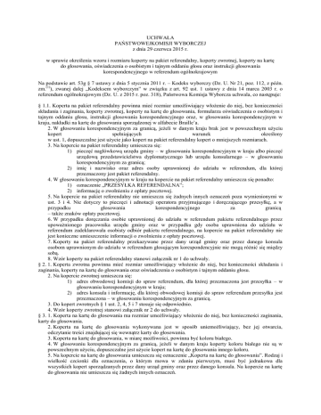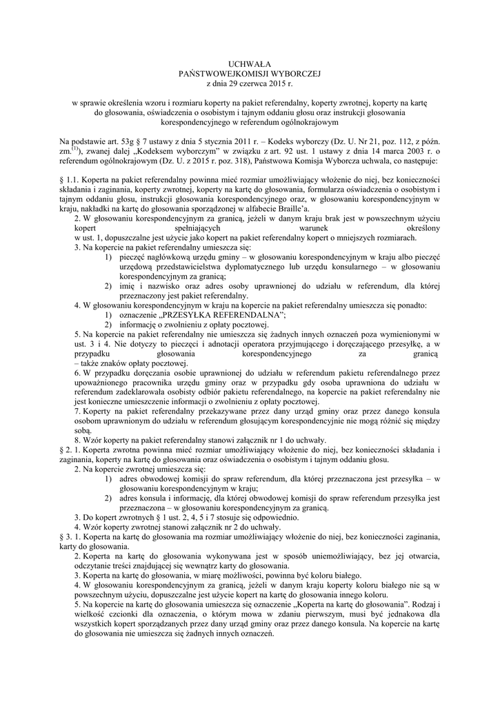 UCHWAŁA PAŃSTWOWEJKOMISJI WYBORCZEJ z dnia 29 czerwca 2015 r. w sprawie określenia wzoru i rozmiaru koperty na pakiet referendalny, koperty zwrotnej, koperty na kartę do głosowania, oświadczenia o osobistym i tajnym oddaniu głosu oraz instrukcji głosowania korespondencyjnego w referendum ogólnokrajowym Na podstawie art. 53g § 7 ustawy z dnia 5 stycznia 2011 r. – Kodeks wyborczy (Dz. U. Nr 21, poz. 112, z późn. zm.(1)), zwanej dalej „Kodeksem wyborczym” w związku z art. 92 ust. 1 ustawy z dnia 14 marca 2003 r. o referendum ogólnokrajowym (Dz. U. z 2015 r. poz. 318), Państwowa Komisja Wyborcza uchwala, co następuje: § 1.1. Koperta na pakiet referendalny powinna mieć rozmiar umożliwiający włożenie do niej, bez konieczności składania i zaginania, koperty zwrotnej, koperty na kartę do głosowania, formularza oświadczenia o osobistym i tajnym oddaniu głosu, instrukcji głosowania korespondencyjnego oraz, w głosowaniu korespondencyjnym w kraju, nakładki na kartę do głosowania sporządzonej w alfabecie Braille’a. 2. W głosowaniu korespondencyjnym za granicą, jeżeli w danym kraju brak jest w powszechnym użyciu kopert spełniających warunek określony w ust. 1, dopuszczalne jest użycie jako kopert na pakiet referendalny kopert o mniejszych rozmiarach. 3. Na kopercie na pakiet referendalny umieszcza się: 1) pieczęć nagłówkową urzędu gminy – w głosowaniu korespondencyjnym w kraju albo pieczęć urzędową przedstawicielstwa dyplomatycznego lub urzędu konsularnego – w głosowaniu korespondencyjnym za granicą; 2) imię i nazwisko oraz adres osoby uprawnionej do udziału w referendum, dla której przeznaczony jest pakiet referendalny. 4. W głosowaniu korespondencyjnym w kraju na kopercie na pakiet referendalny umieszcza się ponadto: 1) oznaczenie „PRZESYŁKA REFERENDALNA”; 2) informację o zwolnieniu z opłaty pocztowej. 5. Na kopercie na pakiet referendalny nie umieszcza się żadnych innych oznaczeń poza wymienionymi w ust. 3 i 4. Nie dotyczy to pieczęci i adnotacji operatora przyjmującego i doręczającego przesyłkę, a w przypadku głosowania korespondencyjnego za granicą – także znaków opłaty pocztowej. 6. W przypadku doręczania osobie uprawnionej do udziału w referendum pakietu referendalnego przez upoważnionego pracownika urzędu gminy oraz w przypadku gdy osoba uprawniona do udziału w referendum zadeklarowała osobisty odbiór pakietu referendalnego, na kopercie na pakiet referendalny nie jest konieczne umieszczenie informacji o zwolnieniu z opłaty pocztowej. 7. Koperty na pakiet referendalny przekazywane przez dany urząd gminy oraz przez danego konsula osobom uprawnionym do udziału w referendum głosującym korespondencyjnie nie mogą różnić się między sobą. 8. Wzór koperty na pakiet referendalny stanowi załącznik nr 1 do uchwały. § 2. 1. Koperta zwrotna powinna mieć rozmiar umożliwiający włożenie do niej, bez konieczności składania i zaginania, koperty na kartę do głosowania oraz oświadczenia o osobistym i tajnym oddaniu głosu. 2. Na kopercie zwrotnej umieszcza się: 1) adres obwodowej komisji do spraw referendum, dla której przeznaczona jest przesyłka – w głosowaniu korespondencyjnym w kraju; 2) adres konsula i informację, dla której obwodowej komisji do spraw referendum przesyłka jest przeznaczona – w głosowaniu korespondencyjnym za granicą. 3. Do kopert zwrotnych § 1 ust. 2, 4, 5 i 7 stosuje się odpowiednio. 4. Wzór koperty zwrotnej stanowi załącznik nr 2 do uchwały. § 3. 1. Koperta na kartę do głosowania ma rozmiar umożliwiający włożenie do niej, bez konieczności zaginania, karty do głosowania. 2. Koperta na kartę do głosowania wykonywana jest w sposób uniemożliwiający, bez jej otwarcia, odczytanie treści znajdującej się wewnątrz karty do głosowania. 3. Koperta na kartę do głosowania, w miarę możliwości, powinna być koloru białego. 4. W głosowaniu korespondencyjnym za granicą, jeżeli w danym kraju koperty koloru białego nie są w powszechnym użyciu, dopuszczalne jest użycie kopert na kartę do głosowania innego koloru. 5. Na kopercie na kartę do głosowania umieszcza się oznaczenie „Koperta na kartę do głosowania”. Rodzaj i wielkość czcionki dla oznaczenia, o którym mowa w zdaniu pierwszym, musi być jednakowa dla wszystkich kopert sporządzanych przez dany urząd gminy oraz przez danego konsula. Na kopercie na kartę do głosowania nie umieszcza się żadnych innych oznaczeń. 6. Do kopert na karty do głosowania § 1 ust. 2 i 7 stosuje się odpowiednio. 7. Wzór koperty na kartę do głosowania stanowi załącznik nr 3 do uchwały. § 4. 1. Oświadczenie o osobistym i tajnym oddaniu głosu sporządza się na karcie koloru białego, formatu A5. 2. W głosowaniu korespondencyjnym za granicą oświadczenie o osobistym i tajnym oddaniu głosu może być sporządzone na karcie o formacie zbliżonym do formatu A5, powszechnie stosowanym w druku w danym kraju. 3. Urząd gminy oraz konsul przygotowuje formularz oświadczenia, na którym umieszcza imię (imiona), nazwisko i numer ewidencyjny PESEL osoby uprawnionej do udziału w referendum oraz datę przeprowadzanego referendum, a także miejsce na wpisanie nazwy miejscowości, w której osoba uprawniona do udziału w referendum sporządza oświadczenie, i daty jego sporządzenia oraz miejsce na własnoręczny podpis osoby uprawnionej do udziału w referendum. 4. Wzór oświadczenia o osobistym i tajnym oddaniu głosu stanowi załącznik nr 4 do uchwały. § 5. 1. Instrukcję głosowania korespondencyjnego sporządza się na karcie formatu A4, czcionką o rozmiarze nie mniejszym niż 14 pkt. 2. W głosowaniu korespondencyjnym za granicą instrukcja głosowania korespondencyjnego może być sporządzona na karcie o formacie zbliżonym do formatu A4, powszechnie stosowanym w druku w danym kraju. 3. W głosowaniu korespondencyjnym w kraju, w przypadku gdy pakiet referendalny przesyłan