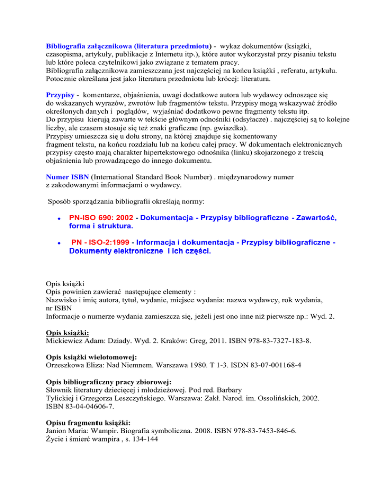 Bibliografia załącznikowa (literatura przedmiotu) - wykaz dokumentów (książki, czasopisma, artykuły, publikacje z Internetu itp.), które autor wykorzystał przy pisaniu tekstu lub które poleca czytelnikowi jako związane z tematem pracy. Bibliografia załącznikowa zamieszczana jest najczęściej na końcu książki , referatu, artykułu. Potocznie określana jest jako literatura przedmiotu lub krócej: literatura. Przypisy - komentarze, objaśnienia, uwagi dodatkowe autora lub wydawcy odnoszące się do wskazanych wyrazów, zwrotów lub fragmentów tekstu. Przypisy mogą wskazywać źródło określonych danych i poglądów, wyjaśniać dodatkowo pewne fragmenty tekstu itp. Do przypisu kierują zawarte w tekście głównym odnośniki (odsyłacze) . najczęściej są to kolejne liczby, ale czasem stosuje się też znaki graficzne (np. gwiazdka). Przypisy umieszcza się u dołu strony, na której znajduje się komentowany fragment tekstu, na końcu rozdziału lub na końcu całej pracy. W dokumentach elektronicznych przypisy często mają charakter hipertekstowego odnośnika (linku) skojarzonego z treścią objaśnienia lub prowadzącego do innego dokumentu. Numer ISBN (International Standard Book Number) . międzynarodowy numer z zakodowanymi informacjami o wydawcy. Sposób sporządzania bibliografii określają normy: PN-ISO 690: 2002 - Dokumentacja - Przypisy bibliograficzne - Zawartość, forma i struktura. PN - ISO-2:1999 - Informacja i dokumentacja - Przypisy bibliograficzne Dokumenty elektroniczne i ich części. Opis książki Opis powinien zawierać następujące elementy : Nazwisko i imię autora, tytuł, wydanie, miejsce wydania: nazwa wydawcy, rok wydania, nr ISBN Informacje o numerze wydania zamieszcza się, jeżeli jest ono inne niż pierwsze np.: Wyd. 2. Opis książki: Mickiewicz Adam: Dziady. Wyd. 2. Kraków: Greg, 2011. ISBN 978-83-7327-183-8. Opis książki wielotomowej: Orzeszkowa Eliza: Nad Niemnem. Warszawa 1980. T 1-3. ISDN 83-07-001168-4 Opis bibliograficzny pracy zbiorowej: Słownik literatury dziecięcej i młodzieżowej. Pod red. Barbary Tylickiej i Grzegorza Leszczyńskiego. Warszawa: Zakł. Narod. im. Ossolińskich, 2002. ISBN 83-04-04606-7. Opisu fragmentu książki: Janion Maria: Wampir. Biografia symboliczna. 2008. ISBN 978-83-7453-846-6. Życie i śmierć wampira , s. 134-144 Opis artykułu w książce (pracy zbiorowej): Bajka Zbigniew: Rynek mediów w Polsce. W: Dziennikarstwo i świat mediów. Pod red. Zbigniewa Bauera, Edwarda Chudzińskiego. Wyd. 2. 2000. ISBN 83-7052-804-X, s. 83-102 Pamiętaj : poszczególne elementy opisu przedziela się wybranym znakiem interpunkcyjnym (np. kropka, przecinek, .średnik). Wybrane znaki należy stosować konsekwentnie we wszystkich opisach w danej publikacji. Opis artykułu z czasopisma: Opis artykułu powinien zawierać następujące elementy: Nazwisko i imię autora, tytuł artykułu, tytuł czasopisma, rok, nr czasopisma, nr strony Przykład: Olejko Andrzej: Śmierć w Bieszczadach. „Odkrywca” 2001 nr 4 s. 20-21 Opis bibliograficzny dokumentów elektronicznych Opis powinien zawierać następujące elementy: typ nośnika zapisywany po tytule np.:[online]; [CD-ROM], daty dostępu, aktualizacji np. [dostęp 5 kwietnia 2005], warunki dostępu np. :Dostępny w Internecie : http:// biblioteka.wroc.pl Opis elektronicznej książki: KOPALIÑSKI, Władysław: Słownik wyrazów obcych i zwrotów obcojęzycznych [CD-ROM]. Wersja 1.0.3.16. Łódź., PRO-media CD, 1998. ISBN 83-7231-731-3. Przykład dokumentu z Internetu: Rembas Michał: Wrocław, jakiego nie znacie. W: Gazeta.pl. Turystyka [online] 2007 nr 5 [dostęp 8 czerwiec 2008]. Dostępny w Internecie:http://turystyka.gazeta.pl/Turystyka/1,81989,3080753.html Opis bibliograficzny innych tekstów kultury: Opis reprodukcji obrazu, rzeźby, dzieła architektury: Jak opis rozdziału z książki: Munch Edvard: Krzyk [il.]. W: Jankowiak- Konik Beata: Historia malarstwa. Jak czytać obrazy. Wyd. Poznań: Ibis,2010. ISBN 978-83-62202-00-3 Opis bibliograficzny filmu: Jak być kochaną [film]. Reż. Wojciech Jerzy Has [Film DVD], Warszawa: PWA, 1999. Pamiętaj! Bibliografię należy ułożyć alfabetycznie. Bibliografia: 1. Bibliografia załącznikowa i przypisy. "Biblioteka w Szkole" 2004 nr 11, s. 26 – 27 Bonk Gabriela, Stronka Aleksandra: 2. Opis bibliograficzny stosowany w bibliografii załącznikowej [online]. Biblioteka Zespołu Szkół Urszulańskich w Rybniku [dostęp 15 czerwca 2008]. Dostępny w World Wide Web: http://www.bibliofilur.republika.pl. 3. Sebastjan Danuta, Tobolska Urszula: Bibliografia załącznikowa i przypisy bibliograficzne. "Poradnik Bibliotekarza" 2005 nr 3 s. 11-19. Opracowały: Barbara Urban, Dorota Kilar