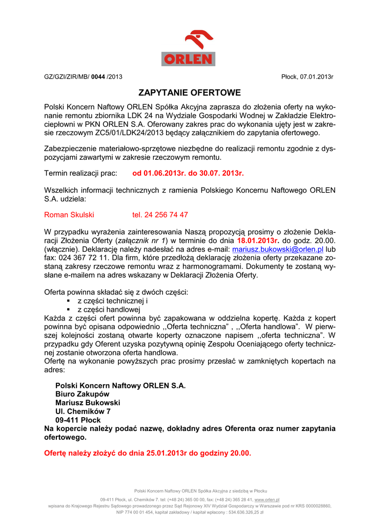 GZ/GZI/ZIR/MB/ 0044 /2013 Płock, 07.01.2013r ZAPYTANIE OFERTOWE Polski Koncern Naftowy ORLEN Spółka Akcyjna zaprasza do złoŜenia oferty na wykonanie remontu zbiornika LDK 24 na Wydziale Gospodarki Wodnej w Zakładzie Elektrociepłowni w PKN ORLEN S.A. Oferowany zakres prac do wykonania ujęty jest w zakresie rzeczowym ZC5/01/LDK24/2013 będący załącznikiem do zapytania ofertowego. Zabezpieczenie materiałowo-sprzętowe niezbędne do realizacji remontu zgodnie z dyspozycjami zawartymi w zakresie rzeczowym remontu. Termin realizacji prac: od 01.06.2013r. do 30.07. 2013r. Wszelkich informacji technicznych z ramienia Polskiego Koncernu Naftowego ORLEN S.A. udziela: Roman Skulski tel. 24 256 74 47 W przypadku wyraŜenia zainteresowania Naszą propozycją prosimy o złoŜenie Deklaracji ZłoŜenia Oferty (załącznik nr 1) w terminie do dnia 18.01.2013r. do godz. 20.00. (włącznie). Deklarację naleŜy nadesłać na adres e-mail: [email protected] lub fax: 024 367 72 11. Dla firm, które przedłoŜą deklarację złoŜenia oferty przekazane zostaną zakresy rzeczowe remontu wraz z harmonogramami. Dokumenty te zostaną wysłane e-mailem na adres wskazany w Deklaracji ZłoŜenia Oferty. Oferta powinna składać się z dwóch części: z części technicznej i z części handlowej KaŜda z części ofert powinna być zapakowana w oddzielna kopertę. KaŜda z kopert powinna być opisana odpowiednio ,,Oferta techniczna” , ,,Oferta handlowa”. W pierwszej kolejności zostaną otwarte koperty oznaczone napisem ,,oferta techniczna”. W przypadku gdy Oferent uzyska pozytywną opinię Zespołu Oceniającego oferty technicznej zostanie otworzona oferta handlowa. Ofertę na wykonanie powyŜszych prac prosimy przesłać w zamkniętych kopertach na adres: Polski Koncern Naftowy ORLEN S.A. Biuro Zakupów Mariusz Bukowski Ul. Chemików 7 09-411 Płock Na kopercie naleŜy podać nazwę, dokładny adres Oferenta oraz numer zapytania ofertowego. Ofertę naleŜy złoŜyć do dnia 25.01.2013r do godziny 20.00. Polski Koncern Naftowy ORLEN Spółka Akcyjna z siedzibą w Płocku 09-411 Płock, ul. Chemików 7. tel: (+48 24) 365 00 00, fax: (+48 24) 365 28 41, www.orlen.pl wpisana do Krajowego Rejestru Sądowego prowadzonego przez Sąd Rejonowy XIV Wydział Gospodarczy w Warszawie pod nr KRS 0000028860, NIP 774 00 01 454, kapitał zakładowy / kapitał wpłacony : 534.636.326,25 zł Otwarcie ofert nastąpi bez udziału Oferentów. Otwarcia ofert oraz ich oceny dokona Zespół Oceniający ze strony PKN ORLEN S.A. I. Oferta techniczna powinna zawierać. 1. Referencje z remontu i zabezpieczenia chemoodpornego co najmniej 5 zbiorników zamkniętych Ŝelbetowych o kubaturze nie mniejszej niŜ 100m3 w tym co najmniej 4 zbiorników Ŝelbetowych zamkniętych, w których zabezpieczenie chemoodporne wykonano w formie laminatu Ŝywicznego. NaleŜy przedstawić referencje z ostatnich 5 lat działalności. 2. Informację, przy uŜyciu jakich materiałów zostaną wykonane prace: MC-Buchemia, Sika Poland, IPA Bauchemische Produkte GmbH. 3. Zobowiązanie Oferenta, Ŝe zapewni nadzór przedstawiciela producenta materiałów (MC-Bauchemie sp. zo.o., Sika Poland Sp. z o.o., IPA GMBH nad specjalistycznymi pracami z uŜyciem materiałów tej firmy. 4. Certyfikat wydany przez producenta materiałów (MC-Bauchemie sp. z o.o. Sika Poland Sp. z o.o., IPA GMBH) potwierdzający znajomość technologii aplikacji materiałów tej firmy przez Oferenta, stanowiący potwierdzenie udzielenia gwarancji dla materiałów aplikowanych przez Oferenta (Wykonawcę) w remontowanym zbiorniku w wybranym wariancie naprawczym. 5. Wykonawca przedstawi osobę, która będzie pełniła przez cały okres realizacji zadania, obowiązki kierownika budowy. Osoba ta musi posiadać uprawnienia budowlane bez ograniczeń w specjalności konstrukcyjno-budowlanej. Wykonawca dołączy kopie uprawnień wraz z decyzją o nadaniu uprawnień oraz aktualne zaświadczenie o wpisie na listę właściwej izby samorządu zawodowego. 6. Oświadczenie oferenta Ŝe zapoznał się i przyjął do wiadomości rozdziały/punkty dokumentacji projektowej: Pkt. 10 – dotyczący zakresu robót i proponowanych technologii, Pkt. 11- dotyczący wymagań bezpieczeństwa i organizacji robót remontowych, Pkt. 12 – dotyczący nadzoru nad pracami remontowymi przez wykonawcę, Pkt. 13- dotyczący odbioru poszczególnych etapów prac remontowych. 7. Oświadczenie o wykonaniu przez Oferenta (Wykonawcę) dokumentacji powykonawczej oraz odbiorowej w 2 egz. 8. Kopię Certyfikatu wdroŜonego u Oferenta Systemu Zarządzania Bezpieczeństwa i Higieną Pracy. Oferty nie posiadające ww. certyfikatu nie będą rozpatrywane. 9. Oświadczenie Oferenta o posiadaniu Certyfikatów SZBiHP, ISO 14001 i ISO 9001. 10. Oświadczenie, Ŝe firma realizować będzie prace we własnym zakresie. Zamawiający nie przewiduje moŜliwości podzlecania całości lub części prac. 11. Potwierdzenie przyjęcia do realizacji prac w oferowanym terminie. 12. Deklarację wykonania pełnego zakresu robót zawartego w zapytaniu ofertowym i potwierdzenie ich zgodności z oględzinami i pomiarami wykonanymi podczas wizji na obiektach. 13. Oświadczenie Oferenta, Ŝe na etapie realizacji prac, będzie prowadził bieŜące uzgodnienia w zakresie wykonywanych prac i dokumentacji z inspektorem nadzoru. 14. Deklarację posiadania niezbędnej wiedzy i doświadczenia przez pracowników (kwalifikacje kadry, posiadanie uprawnień, itp.) Oferenta oraz dysponowania potencjałem technicznym (sprzęt) niezbędnym do wykonania przedmiotowego remontu. 15. Oświadczenie Oferenta, Ŝe do realizacji prac zatrudnieni zostaną tylko doświadczeni pracownicy o potwierdzonych (zweryfikowanych) kwalifikacjach posiadający minimum 2-letni staŜ pracy u Wykonawcy i wykonywali prace o podobnych charakterze. 16. Wykonawca zobowiązany jest do podania lokalizacji zapleczy i podłączenia sprzętu zgodne z zarządzeniem wewnętrznym 3/GD/03 z dn. 20.01