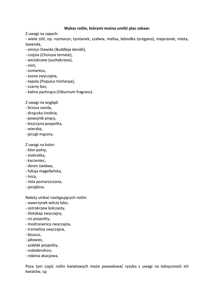 Wykaz roślin, którymi można umilić plac zabaw: Z uwagi na zapach: - wiele ziół, np. rozmaryn, tymianek, szałwia, melisa, lebiodka (oregano), majeranek, mieta, lawenda, - omżyn Dawida (Buddleja davidii), - czojsia (Choisyia ternate), - wiciokrzew (suchokrzew), - mirt, - osmantus, - sosna zwyczajna, - topola (Populus trichorpa), - czarny bez, - kalina pachnąca (Viburnum fragrans). Z uwagi na wygląd: - brzoza zwisła, - drzączka średnia, - powojnik pnący, - leszczyna pospolita, - wierzba, - jarząb mączny. Z uwagi na kolor: - klon polny, - stokrotka, - kaczeniec, - deren świdwa, - fuksja magellańska, - lnica, - róża pomarszczona, - jarzębina. Należy unikać następujących roślin: - wawrzynek wilcze łyko, - ostrokrzew kolczasty, - złotokap zwyczajny, - cis pospolity, - modrzewnica zwyczajna, - trzmielina zwyczajna, - bluszcz, - jałowiec, - szakłak pospolity, - rododendron, - robinia akacjowa. Poza tym część roślin kwiatowych może powodować ryzyko z uwagi na toksyczność ich kwiatów, są: - konwalia majowa, - ostróżka ogrodowa, - ciemiernik, - mak lekarski, - psianka czarna. Niebezpieczne rośliny egzotyczne nie zostały ujęte w powyższym zestawieniu.