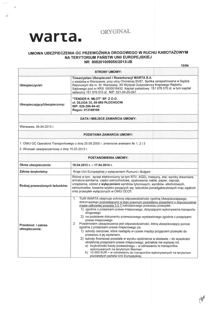 warta. ORYGINAŁ UMOWA UBEZPIECZENIA OC PRZEWOŹNIKA DROGOWEGO W RUCHU KABOTAŻOWYM NA TERYTORIUM PAŃSTW UNII EUROPEJSKIEJ NR 908201009055/2013/JB 10/84 STRONY UMOWY: Ubezpieczycie!: Towarzystwo Ubezpieczeń i Reasekuracji WARTA S.A. z siedzibą w Warszawie, przy ulicy Chmielnej 85/87, Spółka zarejestrowana w Sądzie Rejonowym dla m. St. Warszawy, XII Wydział Gospodarczy Krajowego Rejestru Sądowego pod nr KRS: 0000016432. Kapitał zakładowy: 151 976 570 zł, w tym kapitał wpłacony 151 976 570 zł; NIP: 521-04-20-047 Ubezpieczający/Ubezpieczony: "TENDER K. MŁOT" SP. Z O.O. ul. DŁUGA 33, 05-860 PŁOCHOCIN NIP: 525-206-94-42 Regon: 013168169 DATA l MIEJSCE ZAWARCIA UMOWY: Warszawa, 04. 04.201 3 r. PODSTAWA ZAWARCIA UMOWY: 1. OWU OC Operatora Transportowego z dnia 25.09.2000 r. zmienione aneksem Nr 1, 2 i 3 2. Wniosek ubezpieczeniowy z dnia 15.03.2013 r. POSTANOWIENIA UMOWY: Okres ubezpieczenia: Zakres terytorialny: Rodzaj przewożonych ładunków: 18.04.2013 r. - 17.04.2014 r. Kraje Unii Europejskiej z wyłączeniem Rumunii i Bułgarii Różne w tym: sprzęt elektroniczny (w tym RTV, AGD), maszyny, stal, wyroby drewniane, armatura sanitarna, części samochodowe, opakowania, kable, papier, osprzęt, urządzenia, odzież z wyłączeniem wyrobów tytoniowych, wyrobów alkoholowych, samochodów, towarów szybko psujących się, ładunków ponadgabarytowych oraz ciężkich oraz przesyłek wyłączonych w OWU ÓCOT. 1. Przedmiot i zakres ubezpieczenia: 2. TUiR WARTA obejmuje ochroną odpowiedzialność cywilną Ubezpieczającego, dokonuiaceao pozostającymi w ieqo prawnym posiadaniu poiazdami o dopuszczalnej masie całkowite! powyżei 3,5 T kabotażoweao przewozu przesyłek: 1) zgodnie z przepisami prawa miejscowego, dotyczącymi wykonywania transportu drogowego 2) na podstawie dokumentu przewozowego wystawionego zgodnie z przepisami prawa miejscowego Przedmiotem ubezpieczenia jest odpowiedzialność, którą ubezpieczający ponosi zgodnie z przepisami prawa miejscowego za: 1 ) szkody rzeczowe, które nastąpiły w czasie między przyjęciem przesyłki do przewozu a jej wydaniem, 2) szkody finansowe powstałe w wyniku opóźnienia w dostawie - do wysokości określonej przepisami prawa miejscowego, jednakże nie wyższej niż: a) trzykrotność kwoty przewoźnego - w odniesieniu to transportów wykonywanych na terytorium Niemiec b) 10 000 EUR - w odniesieniu do transportów wykonywanych na terytorium pozostałych państw Unii Europejskiej, ORYGINAŁ Wyłączenia i ograniczenia odpowiedzialności TUiR WARTA 1 . W umowie mają zastosowanie wyłączenia i ograniczenia wymienione w OWU z zastrzeżeniem poniższych postanowień: 1 ) TUiR WARTA nie ponosi odpowiedzialności za szkody powstałe wskutek winy umyślnej ubezpieczającego, jego pracowników oraz osób działających na zlecenie, w imieniu i na rzecz ubezpieczającego - w odniesieniu do przewozów wykonywanych na terytorium Niemiec 2) TUiR WARTA nie ponosi odpowiedzialności za szkody, za które Ubezpieczający nie ponosi odpowiedzialności zgodnie z przepisami prawa miejscowego lub zawartą umową przewozu 2. Jeżeli Ubezpieczający w umowie przewozu ograniczył swoją odpowiedzialność jaką ponosi według przepisów prawa miejscowego wobec uprawnionego z umowy przewozu, to również odpowiedzialność TUiR WARTA podlega temu ograniczeniu. Suma ubezpieczenia: > > 600 000 EUR na jedno zdarzenie 1 200 000 EUR na wszystkie zdarzenia w okresie ubezpieczenia Planowane przychody z tytułu przewozów kabotażowych: 1.200.000 zł Franszyza redukcyjna w każdej szkodzie: 3% nie mniej niż 500 EUR Stawka: 0,5 % Składka: Składka zaliczkowa wynosi 6.000.00 zł. W przypadku, gdy wartość faktycznie zrealizowanych w okresie ubezpieczenia przychodów będzie wyższa od wartości przyjętej do naliczenia składki zaliczkowej, Ubezpieczający zapłaci składkę uzupełniającą wg stawki 2%. W przeciwnym przypadku składką należną jes składka zaliczkowa. Płatność składki w wysokości 6.000,00 zł płatna w czterech ratach po 1 .500,00 zł w następujących terminach: l rata płatna do dnia: 18 kwietnia 2013 r. II rata płatna do dnia: 18 lipca 2013 r. III rata płatna do dnia: 18 września 2013 r. Płatność składki: IV rata płatna do dnia: 18 grudnia 2013 r. Powyższe kwoty składek prosimy przekazać na konto TUiR WARTA nr: Centrum Obsługi Klientów Korporacyjnych Nr 05 1500 1012 1210 1012 7979 0000 Bank Zachodni WBK SA 63 Oddział w Warszawie, ul. Marcina Kasprzaka 22. POSTANOWIENIA KOŃCOWE 1 . W sprawach nie uregulowanych w umowie zastosowanie mają postanowienia OWU OC Operatora Transportowego z dnia 25.09.2000 r. zmienione aneksem Nr 1, 2 i 3. 2. Do umowy załącza się OWU OC Operatora Transportowego z dnia 25.09.2000 r. zmienione aneksem Nr 1 , 2, 3. 3. Kontakt w przypadku szkody: CENTRUM ALARMOWE WARTY tel.: 0 801 31 1 311 dla połączeń z telefonu stacjonarnego tel.: (+48) 601 31 1 311 dla połączeń z telefonów komórkowych faks:(32)7771801 adres e-mail: [email protected] 4. Umowa została sporządzona w dwóch egzemplarzach, z których jeden otrzymuje ubezpieczający i jeden TUiR WARTA. Warszawa, 04.04.2013 r. ' ' • " > ' ' '• CZETJ l REASEKURACJI RTA"S.A. (2) : : ; Podpis i pieczęć lhP7nif>r aiarf>nn* Ubezpieczającego Kor ''.."- 7 "TEN K. Młot P°r3cy|nych w Warszawie 31. fax 22 567-55 22 REGON 00001726;; Podpis i pieczęć TlliR WARTA STARSZY EKSPERT jga 33 ' osoby upoważnione do skłdfcIMriialSWiadcżenia woli w imieniu Ubezpieczającego 2 Mk- <& Joanna Burska