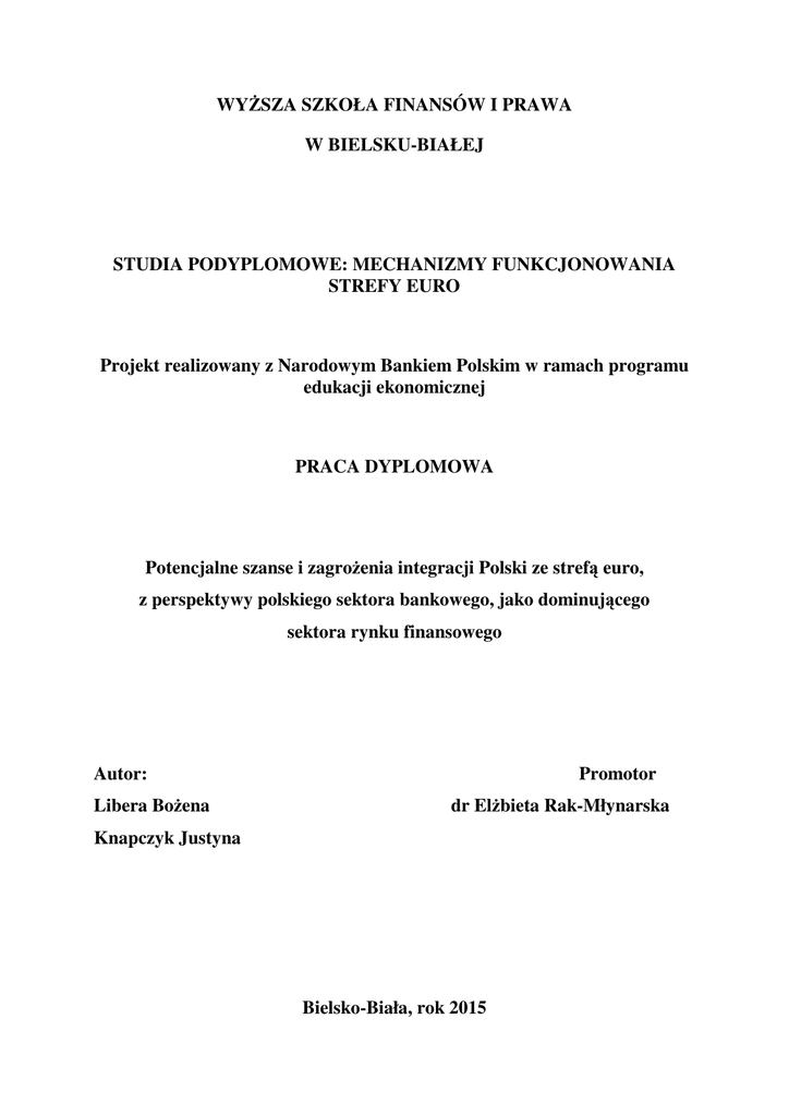 WYŻSZA SZKOŁA FINANSÓW I PRAWA W BIELSKU-BIAŁEJ STUDIA PODYPLOMOWE: MECHANIZMY FUNKCJONOWANIA STREFY EURO Projekt realizowany z Narodowym Bankiem Polskim w ramach programu edukacji ekonomicznej PRACA DYPLOMOWA Potencjalne szanse i zagrożenia integracji Polski ze strefą euro, z perspektywy polskiego sektora bankowego, jako dominującego sektora rynku finansowego Autor: Libera Bożena Promotor dr Elżbieta Rak-Młynarska Knapczyk Justyna Bielsko-Biała, rok 2015 Spis treści Wstęp .............................................................................................................................. 3 Rozdział 1 Obecna sytuacja na rynku finansowym w Polsce i w strefie Euro ........ 4 1.1. Modele rynków finansowych ............................................................................ 4 1.2. Rynek finansowy w Polsce................................................................................ 4 1.3. Integracja rynków finansowych ........................................................................ 8 Rozdział 2 Bezpośrednie i pośrednie szanse i zagrożenia integracji Polski ......... 11 2.1. Potencjalne bezpośrednie korzyści i szanse .................................................... 11 2.2. Koszty i zagrożenia w związku z wejściem do strefy euro ............................. 14 2.3. Bilans korzyści i kosztów dla Polski po wejściu do strefy euro ..................... 16 Rozdział 3 Perspektywy dla polskiego sektora bankowego w obliczu integracji . 18 3.1. Korzyści i szanse dla sektora bankowego ....................................................... 18 3.2. Negatywne skutki wejścia do strefy euro na sektor bankowy ........................ 20 3.3. Bilans potencjalnych szans i zagrożeń dla bankowości w Polsce.................. 24 Podsumowanie ............................................................................................................. 27 Bibliografia .................................................................................................................. 28 2 Wstęp Integracja Polski ze strefą euro jest zagadnieniem bardzo szerokim i złożonym. Dla różnych dziedzin gospodarki może mieć inne perspektywy, które niejednokrotnie mają odmienny skutek i konsekwencje. Stan rynków finansowych, opisany w Rozdziale 1, a głównie sektora bankowego wskazuje na daleko zaawansowaną integrację tegoż rynku. Natomiast analiza doświadczeń ostatniego kryzysu finansowo-gospodarczego pokazuje, iż w warunkach pogłębiającej się globalizacji i integracji rynków finansowych, a także coraz silniejszej zależności pomiędzy największymi instytucjami finansowymi, dotychczasowe rozwiązania w zakresie europejskiego bezpieczeństwa finansowego nie są wystarczające i mogą stwarzać ryzyko dla stabilności Europy i jej systemu bankowego. Zatem istotą integracji dla sektora bankowego jest przede wszystkim integracja rynków finansowych, która oparta jest na istotnym projekcie zmierzającym w kierunku poprawy bezpieczeństwa i przerwania sytuacji kryzysowej w sektorze bankowym. Projekt ten to unia bankowa, zaproponowany przez Komisję Europejską w połowie 2012 roku, która ma składać się docelowo z trzech elementów: jednolitego mechanizmu nadzorczego (ang.Single Supervisory Mechanism– SSM), jednolitego mechanizmu restrukturyzacji i uporządkowanej likwidacji banków (ang.Single Resolution Mechanism–SRM), a także wspólnego systemu gwarantowania depozytów (ang.Deposit Guarantee Scheme). Najbardziej zaawansowane są prace nad pierwszymi dwoma mechanizmami. Podstawowym celem pracy jest ocena konsekwencji integracji ze strefą euro dla sektora bankowego, poprzez pryzmat wejścia do unii bankowej. Zagadnienie to jest jednak trudne, a problem złożony z uwagi na duży stopień umiędzynarodowienia polskiego sektora bankowego i obecność na polskim rynku unijnych grup bankowych. Należy jednak pamiętać, iż sektor bankowy, choć w niewielkim procencie, stanowią również banki tylko z polskim kapitałem i są to między innymi banki spółdzielcze funkcjonujące na rynku lokalnym. Przedstawione w pracy odpowiednio w Rozdziale 2 i 3, podstawowe szanse i korzyści oraz zagrożenia i ryzyka zarówno dla całego kraju jak i samego sektora bankowego w Polsce mają dać odpowiedź na pytanie: czy szybka akcesja jest korzystna z perspektywy sektora bankowego w Polsce? 3 Rozdział 1 Obecna sytuacja na rynku finansowym w Polsce i w strefie Euro 1.1. Modele rynków finansowych Uwzględniając sposób przepływu środków pieniężnych, w ramach systemu finansowego wyodrębnia się dwa główne modele: • model rynkowy, zwany również anglosaskim lub angloamerykańskim, • model zorientowany bankowo tj. model kontynentalny. W modelu rynkowym dominuje finansowanie bezpośrednie, z wykorzystaniem rynków finansowych. W związku z brakiem pośrednika rynek ten jest obciążony większym ryzykiem. Równocześnie jednakże rynek ten oferuje niższą cenę kapitału, charakteryzuje się większą płynnością, umożliwia realizację nowych, innowacyjnych przedsięwzięć wpływając tym samym na zwiększenie efektywności przedsiębiorstw. W modelu zorientowanym bankowo bank pełni rolę pośrednika w procesie pozyskiwania środków finansowych. Z tego też względu rynek ten charakteryzuje niższe ryzyko ale i równocześnie niższa stopa zwrotu. Uwzględniając powyższy podział rynków finansowych, kraje europejskie można podzielić na: - kraje z systemem finansowym opartym głównie na rynkach (Holandia, Wielka Brytania, Belgia, Francja, Finlandia, Szwecja), - kraje z dominującą rolą sektora bankowego (Austria, Dania, Niemcy, Grecja, Włochy, Portugalia, Hiszpania), - kraje z systemami finansowymi relatywnie mniejszymi (kraje Europy Wschodniej), - pozostałe (Irlandia, Malta, Cypr, Luksemburg) z bardzo dużym sektorem bankowym oraz wysoką relacją wartości kredytów do PKB.1 1.2. Rynek finansowy w Polsce W Polsce dominuj