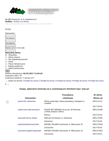 06-300 Przasnysz, ul. B. Joselewicza 6 Grafika : drukuj / nie drukuj http://www.pupprzasnysz.pl/klient/oferty_pracy/st:1.html Szukaj: Stanowisko: Pracodawca: Wymagania: Ważne od (rrrr-mm-dd): Wyszukaj oferty: - Wszystkie - Oferty lokalne - Dla niepełnosprawnych - Staże - Prace interwencyjne - Roboty publiczne - Oferta konkursowa X ostatnia aktualizacja: 02.03.2017 11:45:16 znaleziono ofert: 70 znaleziono podstron: 7 (strona 1/7) Jesteś na stronie 1 Przejdź do strony 2 Przejdź do strony 3 Przejdź do strony 4 Przejdź do strony 5 Przejdź do strony 6 Uwaga, ogłoszenia otwierają się w wyskakujących okienkach typu "pop-up" Stanowisko pomocnik mechanika Pracodawca Nr oferty Lokalizacja Ważna od Oferta zamknięta. Dane pracodawcy dostępne w urzędzie StPr/17/112 2017-03-02 opiekun/ka osób starszych kierownik fermy drobiu elektryk/elektromechanik pracownik papierni/operator PFLEGE MIT HERZEN 24 sp.zoo, SK Wrocław ul.Pows.Slaskich 148/11 OfPr/17/049 Niemcy 2017-03-02 GRELAVI SA Olsztyn ul. Zawiersze OfPr/17/055 Zawiersze 2017-03-01 SOFIDEL POLAND Ciechanów ul. Mleczarska 31 OfPr/17/054 Ciechanów 2017-03-01 SOFIDEL POLAND Ciechanów ul. Mleczarska 31 OfPr/17/053 Ciechanów 2017-03-01 Pracodawca konserwator/elektryk Stanowisko Nr oferty ABIO spółka z o o wWarszawie ul.Karczewska 18 OfPr/17/052 Ciechanów 2017-03-01 specj.ds rynku nieruchomości ORANGE REAL ESTATE sp. zo o Bydgoszcz ul.Chodkiewicza 61 OfPr/17/051 Ciechanów 2017-03-01 Oferta zamknięta. Dane pracodawcy dostępne w urzędzie StPr/17/125 sprzedawca na stacji paliw 2017-03-01 kierownik fermy drobiu recepcjonistka GRELAVI SA Olsztyn ul.Piłsudskiego 72c OfPr/17/050 Sykstyny 2017-03-01 OśrodekWczasowy Pryzmat Kołobrzeg ul.Chopina 3a OfPr/17/048 Kołobrzeg 2017-03-01 Jesteś na stronie 1 Przejdź do strony 2 Przejdź do strony 3 Przejdź do strony 4 Przejdź do strony 5 Przejdź do strony 6 - Oferta lokalna - Prace interwencyjne - Roboty publiczne - Staże - Oferta konkursowa - Dla niepełnosprawnych