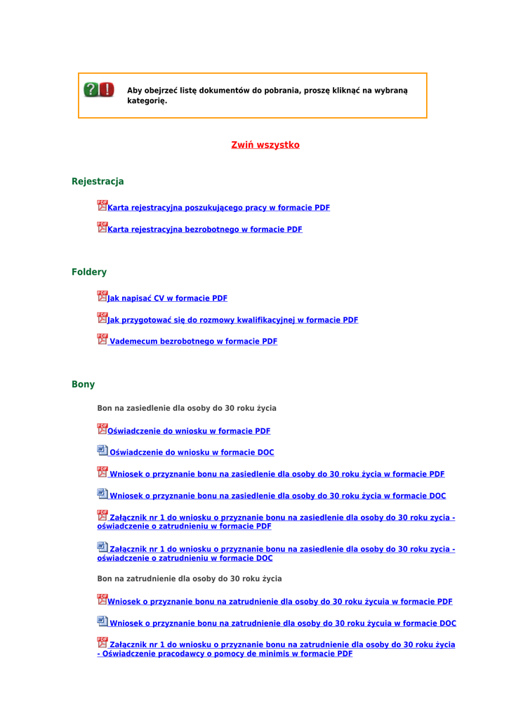 Aby obejrzeć listę dokumentów do pobrania, proszę kliknąć na wybraną kategorię. Zwiń wszystko Rejestracja Karta rejestracyjna poszukującego pracy w formacie PDF Karta rejestracyjna bezrobotnego w formacie PDF Foldery Jak napisać CV w formacie PDF Jak przygotować się do rozmowy kwalifikacyjnej w formacie PDF Vademecum bezrobotnego w formacie PDF Bony Bon na zasiedlenie dla osoby do 30 roku życia Oświadczenie do wniosku w formacie PDF Oświadczenie do wniosku w formacie DOC Wniosek o przyznanie bonu na zasiedlenie dla osoby do 30 roku życia w formacie PDF Wniosek o przyznanie bonu na zasiedlenie dla osoby do 30 roku życia w formacie DOC Załącznik nr 1 do wniosku o przyznanie bonu na zasiedlenie dla osoby do 30 roku zycia oświadczenie o zatrudnieniu w formacie PDF Załącznik nr 1 do wniosku o przyznanie bonu na zasiedlenie dla osoby do 30 roku zycia oświadczenie o zatrudnieniu w formacie DOC Bon na zatrudnienie dla osoby do 30 roku życia Wniosek o przyznanie bonu na zatrudnienie dla osoby do 30 roku życuia w formacie PDF Wniosek o przyznanie bonu na zatrudnienie dla osoby do 30 roku życuia w formacie DOC Załącznik nr 1 do wniosku o przyznanie bonu na zatrudnienie dla osoby do 30 roku życia - Oświadczenie pracodawcy o pomocy de minimis w formacie PDF Załącznik nr 1 do wniosku o przyznanie bonu na zatrudnienie dla osoby do 30 roku życia - Oświadczenie pracodawcy o pomocy de minimis w formacie DOC Wniosek o zawarcie umowy w ramach bonu zatrudnieniowego w formacie PDF Wniosek o zawarcie umowy w ramach bonu zatrudnieniowego w formacie DOC Formularz informacji przedstawianych przy ubieganiu się o pomoc de minimis w formacie PDF Wniosek o zwrot części kosztów wynagrodzenia i składek na ubezpieczenia społeczne za skierowanego bezrobotnego w ramach bonu zatrudnieniowego w formacie PDF Wniosek o zwrot części kosztów wynagrodzenia i składek na ubezpieczenia społeczne za skierowanego bezrobotnego w ramach bonu zatrudnieniowego w dormacie DOC Szkolenia Deklaracja o zamiarze uruchomienia własnej działalności gospodarczej w formacie PDF Deklaracja zatrudnienia po szkoleniu w formacie PDF Wniosek o skierowanie na szkolenie indywidualne w formacie DOC Wniosek o skierowanie na szkolenie indywidualne w formacie PDF Zgłoszenie na szkolenie grupowe w formacie DOC Zgłoszenie na szkolenie grupowe w formacie PDF Zgłoszenie na szkolenie grupowe POKL w formacie PDF Zgłoszenie na szkolenie indywidualne POKL w formacie PDF Działalność gospodarcza Deklaracja o zamiarze podjęcia działalności gospodarczej w formacie DOC Formularz informacji przedstawianych przy ubieganiu się o pomoc de minimis w formacie PDF Procedura - pierwszy krok - złożenie deklaracji o zamiarze podjęcia działalności gospodarczej w formacie PDF Oświadczenie kwartalne w formacie DOC Oświadczenie kwartalne w formacje PDF Organizacja staży Karta kandydata zainteresowanego uczestnictwem w stażu w formacie PDF Karta kandydata zainteresowanego uczestnictwem w stażu w formacie DOC Wniosek o zawarcie umowy o zorganizowanie stażu w formacie PDF Wniosek o zawarcie umowy o zorganizowanie stażu w formacie DOC Załącznik nr 1 do wniosku o zawarcie umowy o zorganizowanie stażu w formacie PDF Załącznik nr 1 do wniosku o zawarcie umowy o zorganizowanie stażu w formacie DOC Promesa zatrudnienia Beneficjenta Stażu FP w formacie PDF Promesa zatrudnienia Beneficjenta Stażu FP w formacie DOC Sprawozdanie z przebiegu stażu w formacie PDF Sprawozdanie z przebiegu stażu w formacie DOC Ankieta stażysty w formacie PDF Ankieta stażysty w formacie DOC Lista obecności w formacie PDF Lista obecności w formacie DOC Wniosek o przyznanie prawa do finansowania kosztów przejazdu (GWARANCJA 50+) w formacie DOC Wniosek o dokonanie zwrotu kosztów przejazdu (GWARANCJA 50+) w formacie DOC Wniosek o przyznanie prawa do finansowania kosztów przejazdu (FUNDUSZ PRACY) w formacie PDF Wniosek o przyznanie prawa do finansowania kosztów przejazdu (FUNDUSZ PRACY) w formacie DOC Wniosek o przyznanie prawa do finansowania kosztów przejazdu (LUBIĘ TO!) w formacie PDF Wniosek o przyznanie prawa do finansowania kosztów przejazdu (LUBIĘ TO!) w formacie DOC Wniosek o przyznanie prawa do finansowania kosztów przejazdu (MANIA PRACOWANIA II) w formacie PDF Wniosek o przyznanie prawa do finansowania kosztów przejazdu (MANIA PRACOWANIA II) w formacie DOC Wniosek o dokonanie zwrotu kosztów przejazdu (FUNDUSZ PRACY) w formacie PDF Wniosek o dokonanie zwrotu kosztów przejazdu (FUNDUSZ PRACY) w formacie DOC Wniosek o dokonanie zwrotu kosztów przejazdu (LUBIĘ TO!) w formacie PDF Wniosek o dokonanie zwrotu kosztów przejazdu (LUBIĘ TO!) w formacie DOC Wniosek o dokonanie zwrotu kosztów przejazdu (MANIA PRACOWANIA II) w formacie PDF Wniosek o dokonanie zwrotu kosztów przejazdu (MANIA PRACOWANIA II) w formacie DOC Wniosek o udzielenie dni wolnych w formacie PDF Wniosek o udzielenie dni wolnych w formacie DOC Dodatek aktywizacyjny Wniosek o przyznanie dodatku aktywizacyjnego z tytułu podjęcia zatrudnienia lub innej pracy zarobkowej z własnej inicjatywy w formacie PDF Wniosek o przyznanie dodatku aktywizacyjnego z tytułu podjęcia zatrudnienia lub innej pracy zarobkowej z własnej inicjatywy w formacie DOC Finansowanie nauki Wniosek o sfinansowanie studiów podyplomowych w formacie PDF Wniosek o sfinansowanie studiów podyplomowych w formacie DOC Oświadczenie organizatora studiów podyplomowych w formacie PDF Oświadczenie organizatora studiów podyplomowych w formacie DOC Załącznik nr 2 do umowy o sfinansowanie kosztów studiów podyplomowych oświadczenie w formacie PDF Załącznik nr 2 do umowy o sfinansowanie kosztów studiów podyplomowych oświadczenie w formacie DOC Oświadczenie o kontynuacji studiów podyplomowych po podjęciu zatrudnienia w formacie PDF Oświadczenie o kontynuacji studiów podyplomowych po podjęciu zatrudnienia w ormacie DOC Oświadczenie o kontynuacji nauki w formacie PDF Oświadczenie 