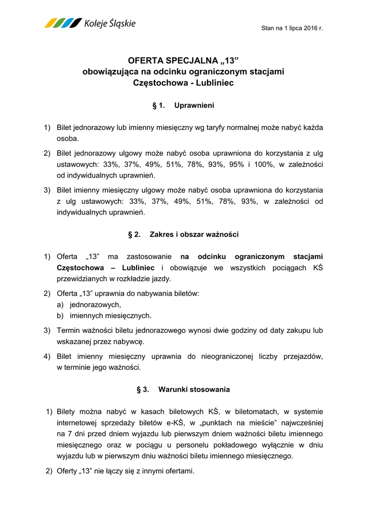 s Stan na 1 lipca 2016 r. OFERTA SPECJALNA „13” obowiązująca na odcinku ograniczonym stacjami Częstochowa - Lubliniec § 1. Uprawnieni 1) Bilet jednorazowy lub imienny miesięczny wg taryfy normalnej może nabyć każda osoba. 2) Bilet jednorazowy ulgowy może nabyć osoba uprawniona do korzystania z ulg ustawowych: 33%, 37%, 49%, 51%, 78%, 93%, 95% i 100%, w zależności od indywidualnych uprawnień. 3) Bilet imienny miesięczny ulgowy może nabyć osoba uprawniona do korzystania z ulg ustawowych: 33%, 37%, 49%, 51%, 78%, 93%, w zależności od indywidualnych uprawnień. § 2. Zakres i obszar ważności 1) Oferta „13” ma zastosowanie na odcinku ograniczonym stacjami Częstochowa – Lubliniec i obowiązuje we wszystkich pociągach KŚ przewidzianych w rozkładzie jazdy. 2) Oferta „13” uprawnia do nabywania biletów: a) jednorazowych, b) imiennych miesięcznych. 3) Termin ważności biletu jednorazowego wynosi dwie godziny od daty zakupu lub wskazanej przez nabywcę. 4) Bilet imienny miesięczny uprawnia do nieograniczonej liczby przejazdów, w terminie jego ważności. § 3. Warunki stosowania 1) Bilety można nabyć w kasach biletowych KŚ, w biletomatach, w systemie internetowej sprzedaży biletów e-KŚ, w „punktach na mieście” najwcześniej na 7 dni przed dniem wyjazdu lub pierwszym dniem ważności biletu imiennego miesięcznego oraz w pociągu u personelu pokładowego wyłącznie w dniu wyjazdu lub w pierwszym dniu ważności biletu imiennego miesięcznego. 2) Oferty „13” nie łączy się z innymi ofertami. § 4. Opłaty Bilety z oferty „13” wydawane są z zastosowaniem opłat zryczałtowanych. TABELA OPŁAT ZA BILETY JEDNORAZOWE I IMIENNE MIESIĘCZNE wg oferty "13" obowiązującej na odcinku ograniczonym stacjami Częstochowa - Lubliniec Ceny biletów jednorazowych Według taryfy Cena brutto PTU Cena netto Ceny biletów miesięcznych imiennych "tam i z powrotem" Cena brutto w złotych PTU Cena netto w złotych N 3,00 0,22 2,78 65,00 4,81 60,19 33% 2,01 0,15 1,86 43,55 3,23 40,32 37% 1,89 0,14 1,75 40,95 3,03 37,92 49% 1,53 0,11 1,42 33,15 2,46 30,69 51% 1,47 0,11 1,36 31,85 2,36 29,49 78% 0,66 0,05 0,61 14,30 1,06 13,24 93% 0,21 0,02 0,19 4,55 0,34 4,21 95% 0,15 0,01 0,14 § 5. - - - Zmiana umowy przewozu / zwrot należności za bilet 1) Zmiana umowy przewozu jest dozwolona tylko w zakresie terminu wyjazdu oraz wymiaru ulgi, na zasadach określonych w § 12 RPO-KŚ. 2) Zwrot/wymiana całkowicie niewykorzystanego biletu jednorazowego może nastąpić: a) przed rozpoczęciem oznaczonego na nim terminu ważności, b) po rozpoczęciu oznaczonego na nim terminu ważności –jednak nie później niż przed upływem 30 minut, licząc od godziny rozpoczęcia terminu ważności oznaczonego na bilecie, po potrąceniu 10% odstępnego, z zastrzeżeniem postanowień § 13 ust. 10 RPO-KŚ. 3) Za częściowo niewykorzystany bilet jednorazowy nie przysługuje zwrot należności. 4) Za całkowicie niewykorzystany bilet imienny miesięczny zwrócony przed rozpoczęciem terminu ważności, zwraca się zapłaconą należność, po potrąceniu 10% odstępnego. 5) Za częściowo niewykorzystany imienny bilet miesięczny zwrócony nie później niż piątego dnia ważności, zwraca się należność proporcjonalną do czasu, w jakim nie mógł być wykorzystany. Od zwracanych należności potrąca się 10% odstępnego. 6) Przy dokonywaniu zwrotu/wymiany biletu z oferty „13” należy stosować postanowienia RPO-KŚ w zakresie poświadczania biletów. 7) Przejście do pociągu innego przewoźnika nie jest dozwolone. § 6. Inne W sprawach nieuregulowanych w niniejszych warunkach stosuje się odpowiednie postanowienia Regulaminu przewozu osób, zwierząt i rzeczy przez Koleje Śląskie (RPO-KŚ) oraz Taryfy przewozowej (TP-KŚ).