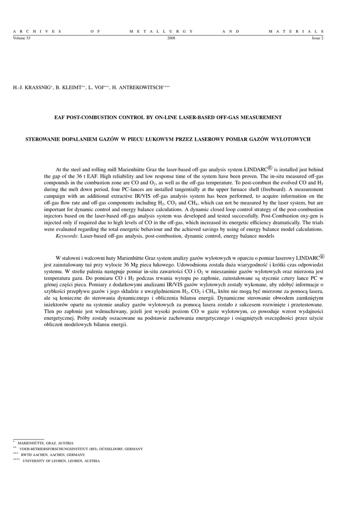 A R C H I V E S O F M E Volume 53 T A L L U R G Y A N D M A T E R I A 2008 L S Issue 2 H.-J. KRASSNIG∗ , B. KLEIMT∗∗ , L. VOJ∗∗∗ , H. ANTREKOWITSCH∗∗∗∗ EAF POST-COMBUSTION CONTROL BY ON-LINE LASER-BASED OFF-GAS MEASUREMENT STEROWANIE DOPALANIEM GAZÓW W PIECU ŁUKOWYM PRZEZ LASEROWY POMIAR GAZÓW WYLOTOWYCH R At the steel and rolling mill Marienhütte Graz the laser-based off-gas analysis system LINDARC is installed just behind the gap of the 36 t EAF. High reliability and low response time of the system have been proven. The in-situ measured off-gas compounds in the combustion zone are CO and O2 , as well as the off-gas temperature. To post-combust the evolved CO and H2 during the melt down period, four PC-lances are installed tangentially at the upper furnace shell (freeboard). A measurement campaign with an additional extractive IR/VIS off-gas analysis system has been performed, to acquire information on the off-gas flow rate and off-gas components including H2 , CO2 and CH4 , which can not be measured by the laser system, but are important for dynamic control and energy balance calculations. A dynamic closed loop control strategy of the post-combustion injectors based on the laser-based off-gas analysis system was developed and tested successfully. Post-Combustion oxy-gen is injected only if required due to high levels of CO in the off-gas, which increased its energetic efficiency dramatically. The trials were evaluated regarding the total energetic behaviour and the achieved savings by using of energy balance model calculations. Keywords: Laser-based off-gas analysis, post-combustion, dynamic control, energy balance models R W stalowni i walcowni huty Marienhütte Graz system analizy gazów wylotowych w oparciu o pomiar laserowy LINDARC jest zainstalowany tuż przy wylocie 36 Mg pieca łukowego. Udowodniona została duża wiarygodność i krótki czas odpowiedzi systemu. W strefie palenia następuje pomiar in-situ zawartości CO i O2 w mieszaninie gazów wylotowych oraz mierzona jest temperatura gazu. Do pomiaru CO i H2 podczas trwania wytopu po zapłonie, zainstalowane są stycznie cztery lance PC w górnej części pieca. Pomiary z dodatkowymi analizami IR/VIS gazów wylotowych zostały wykonane, aby zdobyć informacje o szybkości przepływu gazów i jego składzie z uwzględnieniem H2 , CO2 i CH4 , które nie mogą być mierzone za pomocą lasera, ale są konieczne do sterowania dynamicznego i obliczenia bilansu energii. Dynamiczne sterowanie obwodem zamkniętym inżektorów oparte na systemie analizy gazów wylotowych za pomocą lasera zostało z sukcesem rozwinięte i przetestowane. Tlen po zapłonie jest wdmuchiwany, jeżeli jest wysoki poziom CO w gazie wylotowym, co powoduje wzrost wydajności energetycznej. Próby zostały oszacowane na podstawie zachowania energetycznego i osiągniętych oszczędności przez użycie obliczeń modelowych bilansu energii. ∗ MARIENHÜTTE, GRAZ, AUSTRIA ∗∗ VDEH-BETRIEBSFORSCHUNGSINSTITUT (BFI), DÜSSELDORF, GERMANY ∗∗∗ ∗∗∗∗ RWTH AACHEN, AACHEN, GERMANY UNIVERSITY OF LEOBEN, LEOBEN, AUSTRIA
