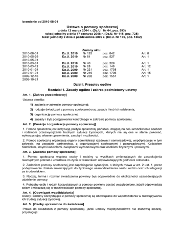 brzmienie od 2010-08-01 Ustawa o pomocy społecznej z dnia 12 marca 2004 r. (Dz.U. Nr 64, poz. 593) tekst jednolity z dnia 17 czerwca 2008 r. (Dz.U. Nr 115, poz. 728) tekst jednolity z dnia 2 października 2009 r. (Dz.U. Nr 175, poz. 1362) 2010-08-01 2010-05-29 2010-05-01 2010-03-31 2010-03-12 2010-01-24 2010-01-01 2009-12-16 2009-10-21 Dz.U. 2010 Dz.U. 2010 Zmiany aktu: Nr 125 poz. 842 Nr 81 poz. 527 Art. 8 Art. 1 Dz.U. 2010 Dz.U. 2010 Dz.U. 2009 Dz.U. 2009 Dz.U. 2009 Nr 40 Nr 28 Nr 221 Nr 219 Nr 202 Art. 1 Art. 12 Art. 1 Art. 15 Art. 1 poz. 229 poz. 146 poz. 1738 poz. 1706 poz. 1551 Dział I. Przepisy ogólne Rozdział 1. Zasady ogólne i zakres podmiotowy ustawy Art. 1. [Zakres przedmiotowy] Ustawa określa: 1) zadania w zakresie pomocy społecznej; 2) rodzaje świadczeń z pomocy społecznej oraz zasady i tryb ich udzielania; 3) organizację pomocy społecznej; 4) zasady i tryb postępowania kontrolnego w zakresie pomocy społecznej. Art. 2. [Funkcje i organizacja pomocy społecznej] 1. Pomoc społeczna jest instytucją polityki społecznej państwa, mającą na celu umożliwienie osobom i rodzinom przezwyciężanie trudnych sytuacji życiowych, których nie są one w stanie pokonać, wykorzystując własne uprawnienia, zasoby i możliwości. 2. Pomoc społeczną organizują organy administracji rządowej i samorządowej, współpracując w tym zakresie, na zasadzie partnerstwa, z organizacjami społecznymi i pozarządowymi, Kościołem Katolickim, innymi kościołami, związkami wyznaniowymi oraz osobami fizycznymi i prawnymi. Art. 3. [Zadania pomocy społecznej] 1. Pomoc społeczna wspiera osoby i rodziny w wysiłkach zmierzających do zaspokojenia niezbędnych potrzeb i umożliwia im życie w warunkach odpowiadających godności człowieka. 2. Zadaniem pomocy społecznej jest zapobieganie sytuacjom, o których mowa w art. 2 ust. 1, przez podejmowanie działań zmierzających do życiowego usamodzielnienia osób i rodzin oraz ich integracji ze środowiskiem. 3. Rodzaj, forma i rozmiar świadczenia powinny być odpowiednie do okoliczności uzasadniających udzielenie pomocy. 4. Potrzeby osób i rodzin korzystających z pomocy powinny zostać uwzględnione, jeżeli odpowiadają celom i mieszczą się w możliwościach pomocy społecznej. Art. 4. [Obowiązek współdziałania] Osoby i rodziny korzystające z pomocy społecznej są obowiązane do współdziałania w rozwiązywaniu ich trudnej sytuacji życiowej. Art. 5. [Osoby uprawnione do świadczeń] Prawo do świadczeń z pomocy społecznej, jeżeli umowy międzynarodowe nie stanowią inaczej, przysługuje: 1) osobom posiadającym obywatelstwo polskie mającym przebywającym na terytorium Rzeczypospolitej Polskiej; 2) cudzoziemcom mającym miejsce zamieszkania Rzeczypospolitej Polskiej: miejsce zamieszkania i przebywającym na i terytorium a) na podstawie zezwolenia na osiedlenie się, zezwolenia na pobyt rezydenta długoterminowego Wspólnot Europejskich, zezwolenia na zamieszkanie na czas oznaczony udzielonego w związku z okolicznością, o której mowa w art. 53 ust. 1 pkt 13 ustawy z dnia 13 czerwca 2003 r. o cudzoziemcach (Dz.U. z 2006 r. Nr 234, poz. 1694, z późn. zm.), lub w związku z uzyskaniem w Rzeczypospolitej Polskiej statusu uchodźcy lub ochrony uzupełniającej, b) na podstawie zgody na pobyt tolerowany - w formie schronienia, posiłku, niezbędnego ubrania oraz zasiłku celowego; 3) mającym miejsce zamieszkania i przebywającym na terytorium Rzeczypospolitej Polskiej obywatelom państw członkowskich Unii Europejskiej, państw członkowskich Europejskiego Porozumienia o Wolnym Handlu (EFTA) - stron umowy o Europejskim Obszarze Gospodarczym lub Konfederacji Szwajcarskiej oraz członkom ich rodzin w rozumieniu art. 2 pkt 4 ustawy z dnia 14 lipca 2006 r. o wjeździe na terytorium Rzeczypospolitej Polskiej, pobycie oraz wyjeździe z tego terytorium obywateli państw członkowskich Unii Europejskiej i członków ich rodzin (Dz.U. Nr 144, poz. 1043, z 2007 r. Nr 120, poz. 818 oraz z 2008 r. Nr 216, poz. 1367), posiadającym prawo pobytu lub prawo stałego pobytu na terytorium Rzeczypospolitej Polskiej. Art. 5a. [Uprawnieni cudzoziemcy] Prawo do świadczeń w formie interwencji kryzysowej, schronienia, posiłku, niezbędnego ubrania oraz zasiłku celowego przysługuje cudzoziemcom, o których mowa w art. 53 ust. 1 pkt 15 oraz art. 53a ust. 2 pkt 4 ustawy z dnia 13 czerwca 2003 r. o cudzoziemcach. Art. 6. [Słowniczek] Użyte w ustawie określenia oznaczają: 1) całkowita niezdolność do pracy - całkowitą niezdolność do pracy w rozumieniu przepisów o emeryturach i rentach z Funduszu Ubezpieczeń Społecznych albo zaliczenie do I lub II grupy inwalidów lub legitymowanie się znacznym lub umiarkowanym stopniem niepełnosprawności w rozumieniu przepisów o rehabilitacji zawodowej i społecznej oraz zatrudnianiu osób niepełnosprawnych; 2) dochód dziecka - dochód, do którego zalicza się kwotę otrzymywanej renty wraz z dodatkiem dla sierot zupełnych, zasiłek pielęgnacyjny, dodatek pielęgnacyjny, otrzymywane alimenty oraz kwotę odpowiadającą dochodom uzyskiwanym z majątku dziecka; 3) dochód na osobę w rodzinie - dochód rodziny podzielony przez liczbę osób w rodzinie; 4) dochód rodziny - sumę miesięcznych dochodów osób w rodzinie; 5) jednostka organizacyjna pomocy społecznej - regionalny ośrodek polityki społecznej, powiatowe centrum pomocy rodzinie, ośrodek pomocy społecznej, dom pomocy społecznej, placówkę specjalistycznego poradnictwa, w tym rodzinnego, placówkę opiekuńczowychowawczą, ośrodek adopcyjno-opiekuńczy, ośrodek wsparcia i ośrodek interwencji kryzysowej; 6) kontrakt socjalny - pisemną umowę zawartą z osobą ubiegającą się o pomoc, określającą uprawnienia i zobowiązania stron umowy, w ramach wspólnie podejmowanych działań zmierzających do przezwyciężenia trudnej sytuacji życiowej osoby lub rodziny; 7) niezdolność do pracy z tytułu wieku - ukończ
