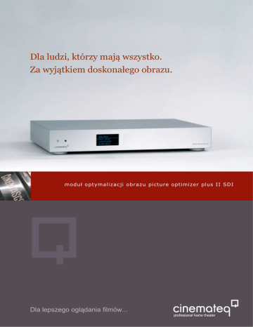 Dla ludzi, którzy mają wszystko. Za wyjątkiem doskonałego obrazu. moduł optymalizacji obrazu picture optimizer plus II SDI Dla lepszego oglądania filmów... moduł optymalizacji obrazu picture optimizer plus II SDI Idealne skalowanie, telewizja cyfrowa HDTV o rozdzielczościach do 1080p oraz w 100% cyfrowa obróbka sygnału Z idealnym skalowaniem, wszystkimi standardowymi rozdzielczościami, aż do rozdzielczości „prawdziwej” telewizji cyfrowej HDTV 1080p oraz w pełni cyfrową obróbką sygnału, moduł optymalizacji obrazu picture optimizer plus II SDI oferuje za rozsądną cenę jedyną w swoim rodzaju jakość obrazu dla projektorów, telewizorów plazmowych. Zupełnie poprawiony następca modelu picture optimizer plus wykorzystuje najnowsze technologie w celu zapewnienia obsługi nowych funkcji oraz zagwarantowania możliwości dostosowania do przyszłych rozwiązań. Moduł optymalizacji obrazu picture optimizer plus II SDI oferuje standard telewizji cyfrowej HDTV oraz w pełni cyfrowe przetwarzanie sygnału, wykorzystując standard SDI, jedyny standard wejścia cyfrowego gwarantujący przesyłanie strumieni danych sygnałów wideo pochodzących z odtwarzacza DVD lub też telewizji cyfrowej, w stosunku 1:1. Poza funkcją optymalizacji, urządzenie to jest wysokiej jakości przełącznikiem wideo z funkcją automatycznego wykrywania sygnału wejściowego. 10 wejść oraz 4 wyjścia oferują wszystkie standardowe interfejsy dla sygnałów wejściowych oraz wyjściowych i umożliwiają wszelkie niezbędne konfiguracje połączeń systemów kina domowego lub też w pomieszczeniach przeznaczonych do prezentacji. Sterowanie oraz konfiguracja modułu są realizowane za pomocą pilota zdalnego sterowania na podczerwień, w oparciu o łatwą w obsłudze strukturę menu, dostępną poprzez wyświetlacz graficzny lub też wyświetlane na ekranie menu. Urządzenie jest dostarczane „gotowe do pracy” w celu umożliwienia wszystkim posiadaczom systemów kina domowego natychmiastowe wykorzystanie modułu optymalizacji obrazu picture optimizer plus II SDI. Moduł jest również dostępny w wersji pozbawionej wejść SDI: moduł picture optimizer plus II jest dostępny za niższą cenę, przy identycznej funkcjonalności oraz parametrach. Posiada dwa dodatkowe wejścia typu composite zamontowane w miejsce wejść SDI. ! Pełna obsługa standardu telewizji cyfrowej HDTV ! Specjalna funkcja detekcji trybu filmu dla PAL/NTSC ! W 100% cyfrowa obróbka sygnału ! 8-wejściowy przełącznik sygnałów wideo z wejściem audio ! 22 fabrycznie ustawione rozdzielczości ! Wejścia wideo: 2 cyfrowe, 6 analogowych ! 4 regulowane „rozdzielczości użytkownika” ! 2 tory HDTV z funkcją progrssive bypass ! Maksymalna rozdzielczość 1080i oraz 1080p, 50/60 Hz ! 1 wyjście DVI, 3 wyjścia analogowe Możliwości i funkcje 22 fabrycznie ustawione dla standardu PAL oraz NTSC Pełna obsługa standardu telewizji cyfrowej HDTV z nowymi, predefiniowanymi rozdzielczościami 720p, 1080i oraz 1080p dla częstotliwości 50/60 Hz. Funkcja ta jest oparta na „prawdziwym” skalowaniu, bez interpolacji w poziomie sygnału wyjściowego. W 100% cyfrowa obróbka sygnału wykorzystując dwa wejścia SDI oraz zgodne ze standardem HDCP wyjście DVI. Wynikiem tego „w pełni cyfrowego łańcucha” jest wyraźna poprawa jasności odtwarzanego obrazu: większa ostrość, obrazy bez przeskoków oraz zestaw informacji umożliwiający otrzymanie bezbłędnego obrazu o praktycznie cyfrowej doskonałości. W 100% doskonałe matematycznie skalowanie rozdzielczości 9 rozdzielczości może zostać wybranych bezpośrednio za pomocą pilota zdalnego sterowania, 13 dalszych może zostać wybranych wykorzystując wyświetlane na ekranie menu. Każda rozdzielczość jest dostępna zarówno dla standardu PAL, jak i NTSC; daje to w sumie 2 razy 22 = 44 rozdzielczości. Te rozdzielczości to: dublowanie, potrajanie, czterokrotne zwiększanie, HDTV 720p, XGA, SXGA (5:4), HDTV 1080i, 480p, Wide-XGA, Wide-VGA, 540p, 576p, 576i, SVGA, Wide-XGA 2, Wide-XGA 3, SVGA (4:3), PDP 1, PDP 2, DILA, UXGA (4:3), HDTV 1080p. Maksymalne rozdzielczości zależą od ilości ramek na sekundę wykorzystywanego obrazu, przykładowo czterokrotne zwiększanie dla 50/72 Hz, Wide-XGA 100/90 Hz, DILA 75/72 Hz lub też 1080p 50/60 Hz (ilość ramek zgodna ze standardem PAL/NTSC). Firma cinemateq gwarantuje w 100% doskonałe matematycznie skalowanie sygnału wejściowego, dla każdej rozdzielczości sygnału wyjściowego. Rezultatem będzie obraz dokładny, co do piksela, spełniający pod każdym względem międzynarodowe normy. Wejścia i wyjścia Moduł optymalizacji obrazu picture optimizer plus II SDI oferuje w sumie 10 wejść oraz 4 wyjścia, wszystkie dla typowych formatów oraz typów interfejsów. Aby pozostać w zgodzie z wymaganiami rynku europejskiego, dodano również do modułu wejścia SCART. Zapewnia to obsługę wszystkich typowych źródeł oraz urządzeń wyświetlających oraz gwarantuje najwyższą możliwą elastyczność. Połączenie wszystkich wejść z czterema wyjściami umożliwia nawet specjalne typy konwersji sygnału, jak na przykład z YUV na RGB i odwrotnie. Są to tylko najważniejsze parametry modułu optymalizacji obrazu picture optimizer plus II SDI. Szczegóły dotyczące jego możliwości, funkcji oraz ukompletowania urządzenia, tabela rozdzielczości oraz wiele innych interesujących informacji jest dostępnych na stronach internetowych firmy cinemateq, pod adresem www.cinemateq.com. Moduł optymalizacji obrazu picture optimizer plus II SDI – Dane techniczne Nazwa modelu/aktualna wersja Nazwa modelu/aktualna wersja ! Moduł optymalizacji obrazu klasy high-end ze zintegrowanym przełącznikiem wideo ! Aktualna wersja oprogramowania wewnętrznego 4.10 ! Dowolne przydzielanie 8 wejść oraz 4 wyjść ! Funkcja wejścia sygnału audio z rozpoznawaniem priorytetu ! Równoległe przesyłanie optymalizowanego sygnału do 4