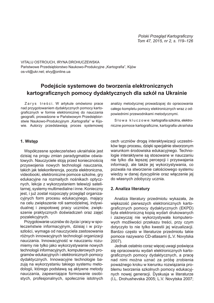 Polski Przegląd Kartograficzny Tom 47, 2015, nr 2, s. 119–126 VITALIJ OSTROUCH, IRYNA DROHUCZEWSKA Państwowe Przedsiębiorstwo Naukowo-Produkcyjne „Kartografia”, Kijów [email protected]; [email protected] Podejście systemowe do tworzenia elektronicznych kartograficznych pomocy dydaktycznych dla szkół na Ukrainie Z a r y s t r e ś c i. W artykule omówiono prace nad przygotowaniem dydaktycznych pomocy kartograficznych w formie elektronicznej do nauczania geografii, prowadzone w Państwowym Przedsiębiorstwie Naukowo-Produkcyjnym „Kartografia” w Kijowie. Autorzy przedstawiają proces systemowej analizy metodycznej prowadzącej do opracowania całego kompletu pomocy elektronicznych wraz z odpowiednimi przewodnikami metodycznymi. 1. Wstęp cech uczniów drogą interaktywizacji uczestników tego procesu, dzięki specjalnie stworzonym warunkom środowiska edukacyjnego. Technologie interaktywne są stosowane w nauczaniu nie tylko dla lepszej percepcji i przyswajania informacji, ale także jej wykorzystywania, co pozwala na stworzenie całościowego systemu wiedzy w danej dyscyplinie oraz włączenie jej do własnych zdobyczy ucznia. Współczesne społeczeństwo ukraińskie jest dzisiaj na progu zmian paradygmatów oświatowych. Nauczyciele stoją przed koniecznością przyswojenia nowych technologii nauczania, takich jak telekonferencja, poczta elektroniczna, videobooki, elektroniczne pomoce szkolne, gry edukacyjne na rozmaitych nośnikach optycznych, lekcje z wykorzystaniem telewizji satelitarnej, systemy multimedialne i inne. Konieczny jest, i już został rozpoczęty przegląd organizacyjnych form procesu edukacyjnego, mający na celu zwiększenie roli samodzielnej, indywidualnej i zespołowej pracy uczniów, zwiększenie praktycznych doświadczeń oraz zajęć pozalekcyjnych. Przygotowanie uczniów do życia i pracy w społeczeństwie informacyjnym, dzisiaj i w przyszłości, wymaga od nauczyciela zastosowania różnych innowacyjnych technologii organizacji nauczania. Innowacyjność w nauczaniu rozumiemy nie tylko jako wykorzystywanie nowych technologii informacyjnych, komputerowych programów edukacyjnych i elektronicznych pomocy dydaktycznych. Innowacyjne technologie bazują na wykorzystaniu takiego systemu metodologii, którego podstawą są aktywne metody nauczania, zapewniające formowanie osobistych, profesjonalnych, społecznie istotnych S ł o w a k l u c z o w e : kartografia szkolna, elektroniczne pomoce kartograficzne, kartografia ukraińska 2. Analiza literatury Analiza literatury przedmiotu wykazała, że większość pierwszych elektronicznych kartograficznych pomocy dydaktycznych (EKPD) była elektroniczną kopią wydań drukowanych i zazwyczaj nie wykorzystywała komputerowych możliwości przekazu treści, przy czym dotyczyło to nie tylko kwestii jej wizualizacji. Bardzo często w literaturze przedmiotu takie pomoce nazywano CD-atlasami (L.V. Novytska 2007). Jednak ostatnio coraz więcej uwagi poświęca się opracowaniu wydań elektronicznych kartograficznych pomocy dydaktycznych, a pracę nad nimi można uznać za próbę zrobienia poważnego kroku w kierunku rozwiązania problemu tworzenia szkolnych pomocy edukacyjnych nowej generacji. Dyskusja w literaturze (I.L. Drohushevska 2005; L.V. Novytska 2007; 120 Vitalij Ostrouch, Iryna Drohuczewska V.I. Ostroukh 2011, 2013; M.L. Sherman 2003) pokazuje, że jeśli elektroniczna pomoc dydaktyczna ma odpowiadać zakładanym wymaganiom, konieczne jest, aby łączyła w sobie funkcje podręcznika i nauczyciela, poradnika, informatora i konsultanta, symulatora i kontrolera wiedzy. Oprócz wyżej wymienionych problemów istnieje również kwestia przygotowania redakcyjnego, ponieważ metodyka przygotowania redakcyjnego elektronicznych pomocy kartograficznych ma swoją specyfikę i różni się od tradycyjnych prac, związanych z przygotowaniem map do wydania. Omówienie właśnie tych aktualnych kwestii jest głównym zadaniem autorów artykułu. 3. Cele i zadania artykułu Do rozwiązania tego problemu zostało zaproponowane wykorzystanie systemowego podejścia do wytwarzania elektronicznych kartograficznych pomocy dydaktycznych. W ramach takiego podejścia obiekt jest rozpatrywany jako system składający się z wielu współzależnych elementów, tworzących pewną całość, która charakteryzuje się właściwościami systemowymi. Systemowe podejście pozwala na tworzenie elektronicznej pomocy kartograficznej w taki sposób, aby nie była skierowana wyłącznie do konkretnej grupy użytkowników, ale tak, aby prawie każdy mógł z niej skorzystać. W zależności od potrzeb i już posiadanej wiedzy nauczyciel sam wybiera materiał do nauczania, jego zakres oraz technikę nauczania. Wytworzenie różnych modeli prezentacji wiedzy, które w jednym przypadku przedstawiają obiekty charakterystyczne dla logicznego myślenia, w innym zaś mapy, którymi operuje myślenie kreatywne, umożliwia optymalizację procesu nauczania takich przedmiotów jak geografia i historia. Kontrola wiedzy po omówieniu każdego rozdziału może się odbywać na różne sposoby (za pomocą testów, kontrolnych pytań, logicznych ćwiczeń itp.). W zależności od poziomu przyswojenia materiału przez uczniów można, jeśli to konieczne, powtórzyć przestudiowany rozdział albo skorygować lub zmienić metodykę nauczania. Brak wspólnego podejścia do opracowania metodyki nauczania geografii, prowadzenia lekcji, praktycznych zajęć z zastosowaniem współczesnych środków elektronicznych można uznać za podstawowy problem metodyczny nauczania tej dyscypliny. Brak rozwiązania tego problemu, istotnie hamujący wprowadzenie uczenia do praktyki oświatowej, można objaśnić zarówno jego nowością jak i złożonością. Owe przyczyny są spowodowane tym, iż istota problemu znajduje się na styku dwóch dziedzin. Pierwsza z nich to najnowsze technologie informacyjne, druga – właśnie metodyka nauczania i uczenia się geografii